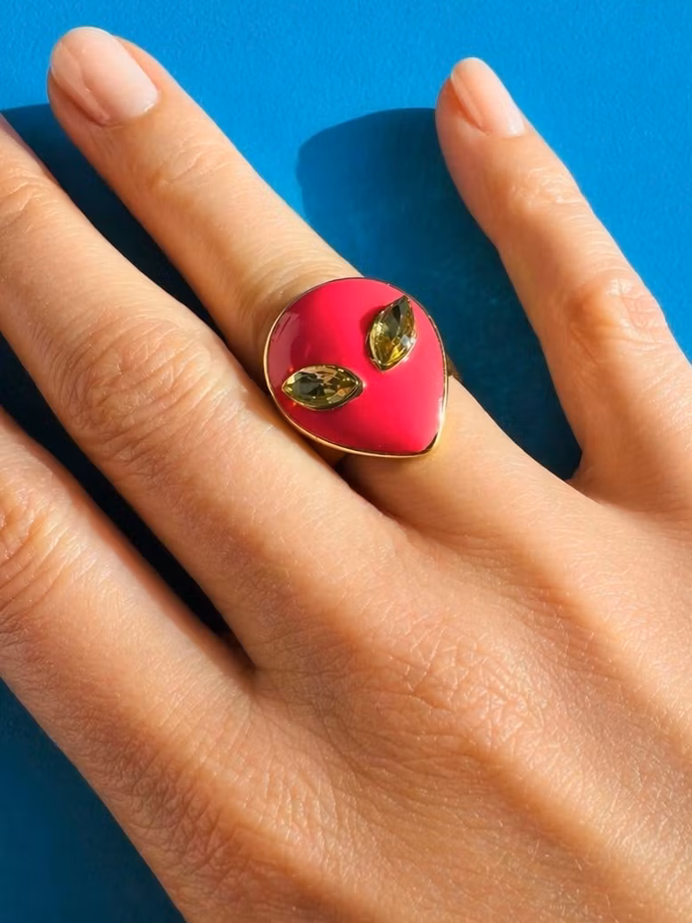 Beskrivning: Kaxig och kul på samma gång. Den starka rosa tonen på utomjordingen kombinerat med gnistrande detaljer gör den till ett riktigt blickfång.