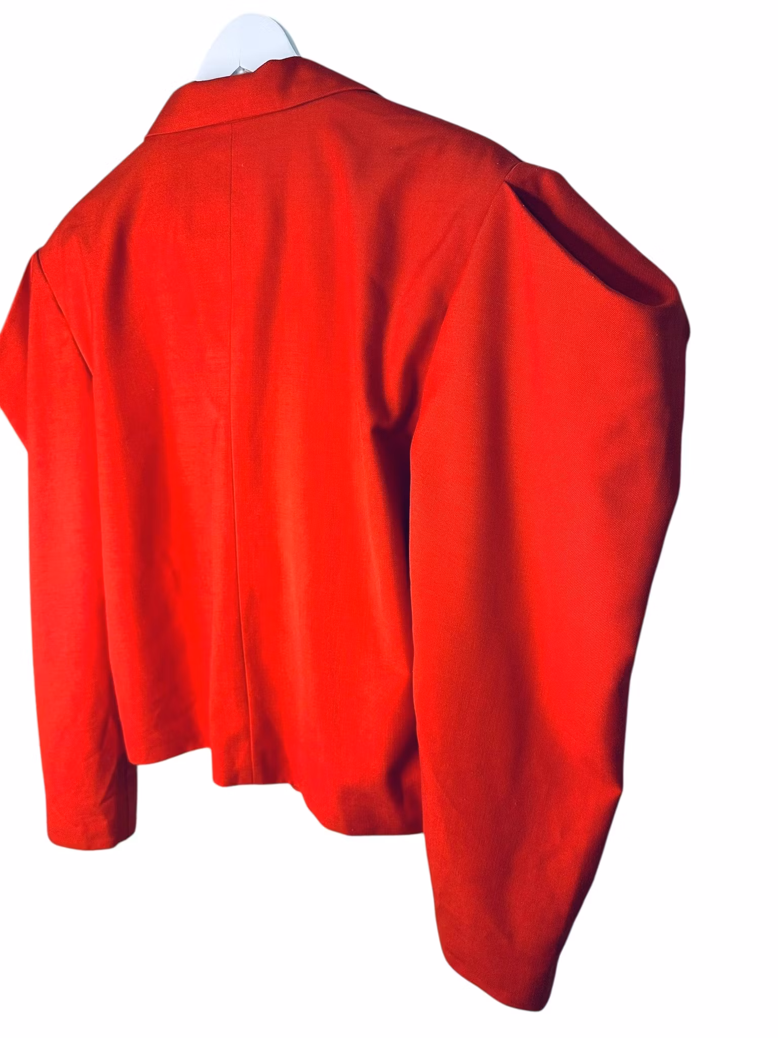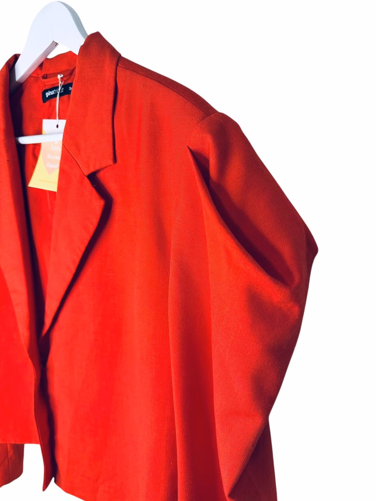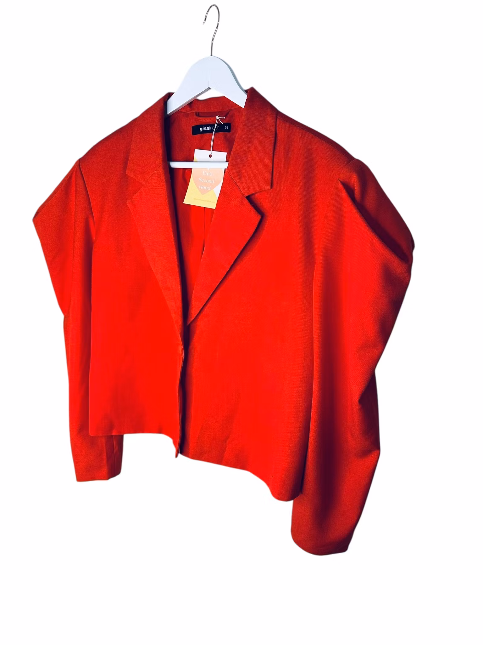 Beskrivning: En riktig statementpiece i rött! En croppad kavaj med rejält maxade axlar. Stängs framtill med en klädd knapp. Helfodrad. Från Gina Tricot. Uppfattas som rymlig i storlek.