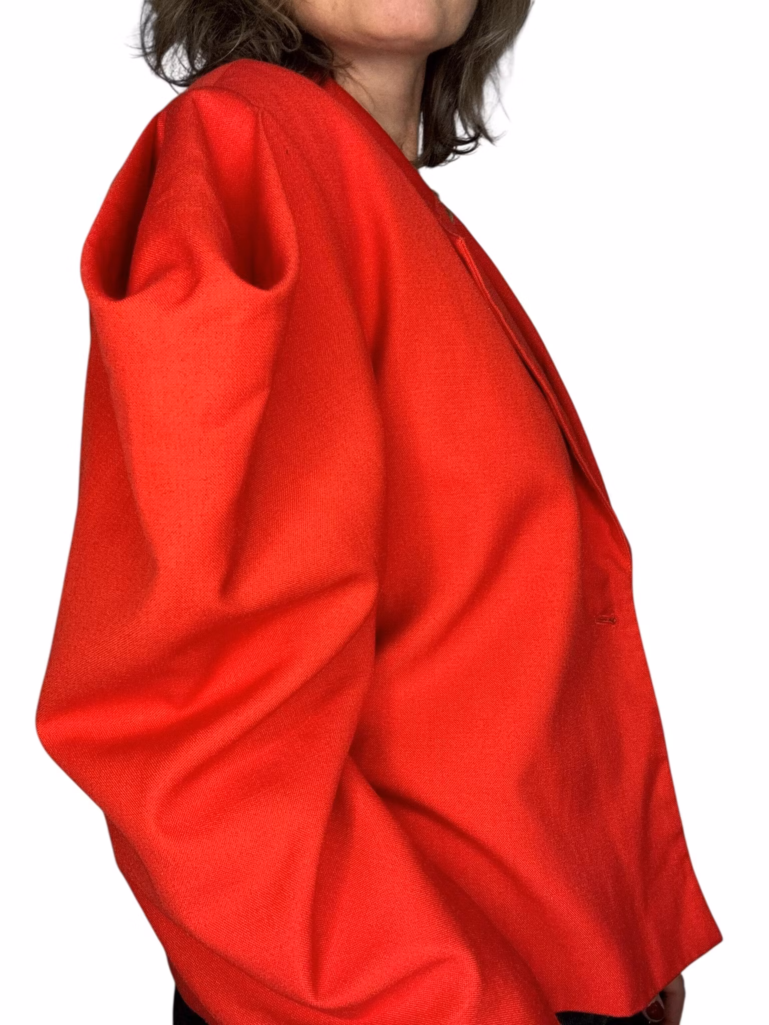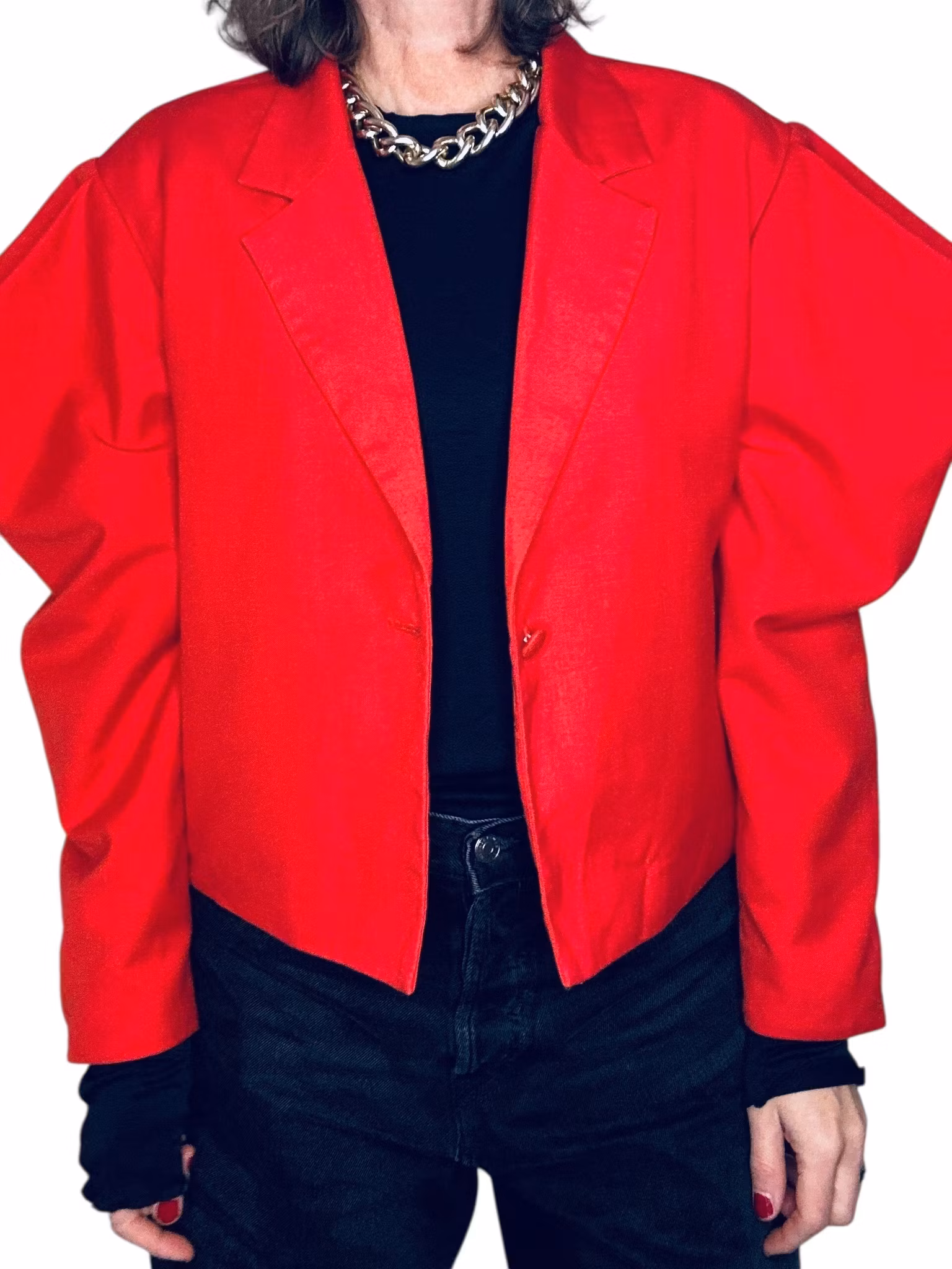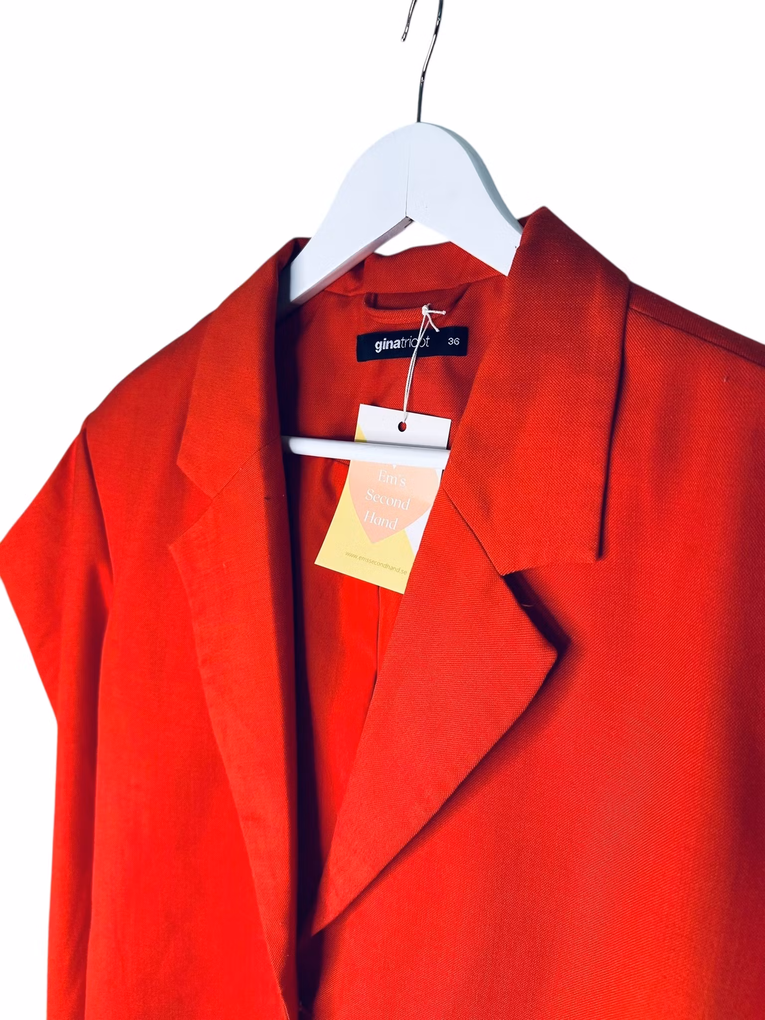 Beskrivning: En riktig statementpiece i rött! En croppad kavaj med rejält maxade axlar. Stängs framtill med en klädd knapp. Helfodrad. Från Gina Tricot. Uppfattas som rymlig i storlek.