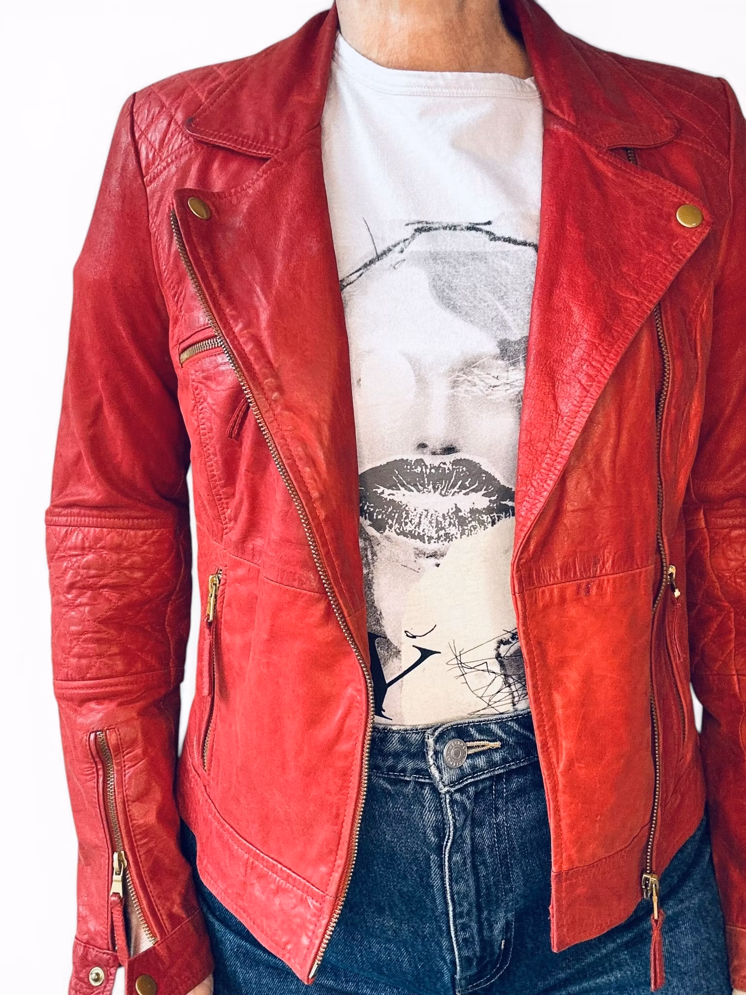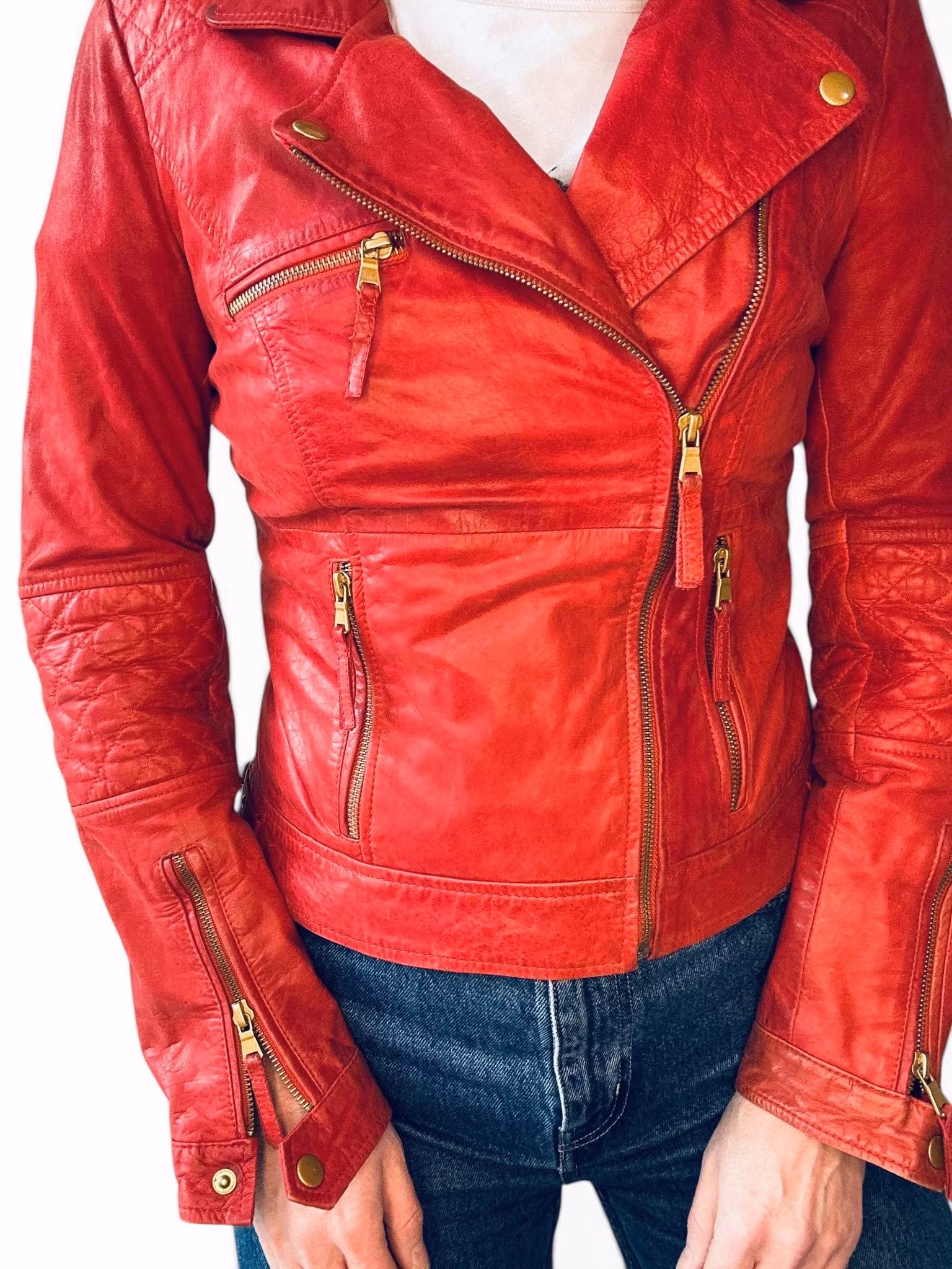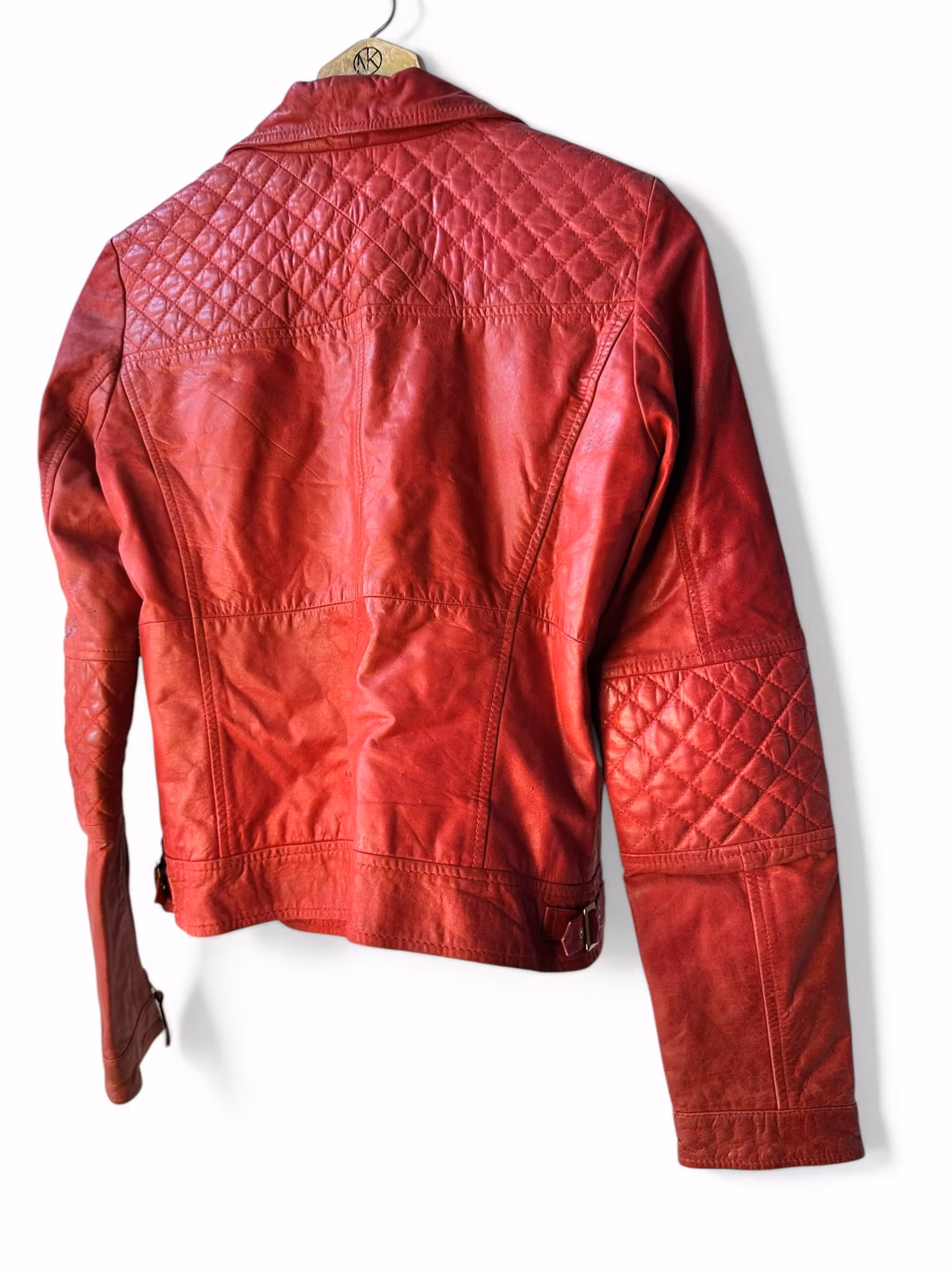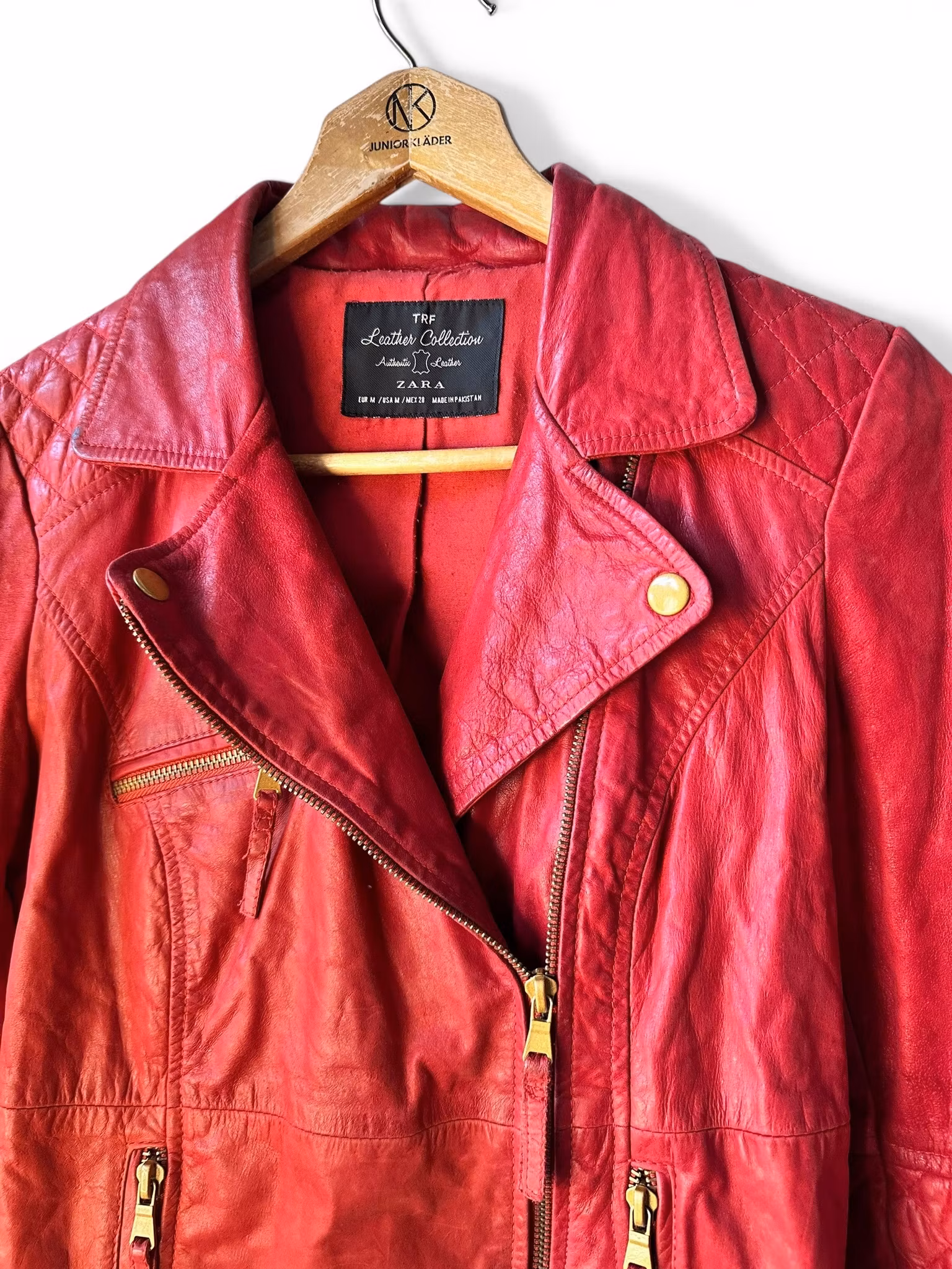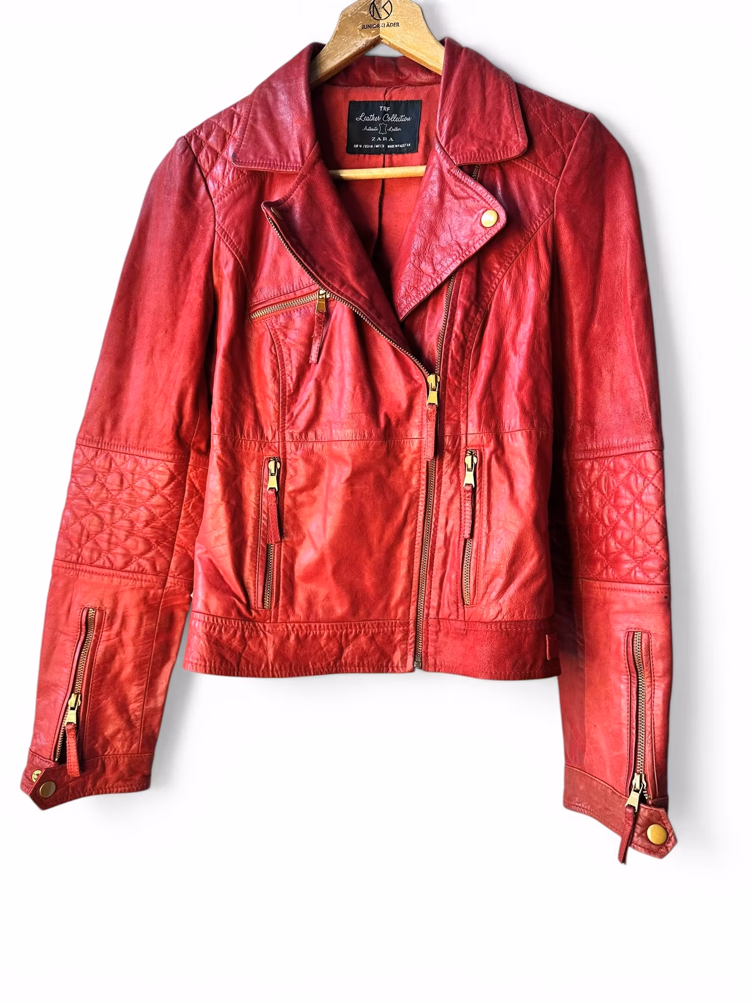 Beskrivning: En röd liten bikerjacka i läder från Zara. Lite mörk i skinnet på sina ställen men med fin patina. Ganska liten i storleken.