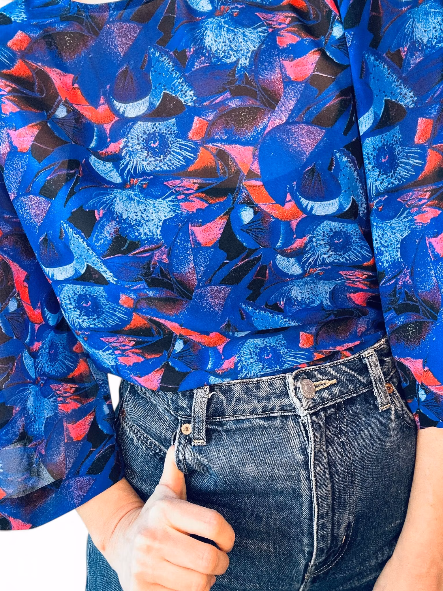 Sökord: Rodebjer blus, Rodebjer Maine print, färgglad blus dam, blå mönstrad blus, statementblus, second hand Rodebjer, hållbart mode dam, designer second hand Sverige, oversized blus, grafiskt print blus