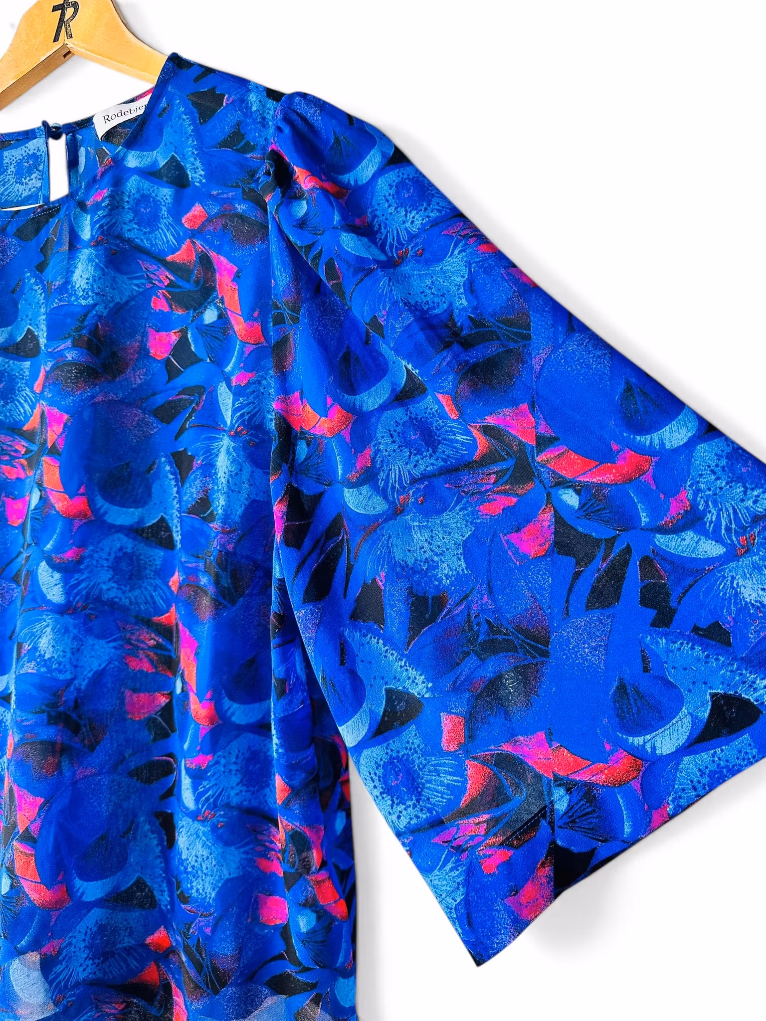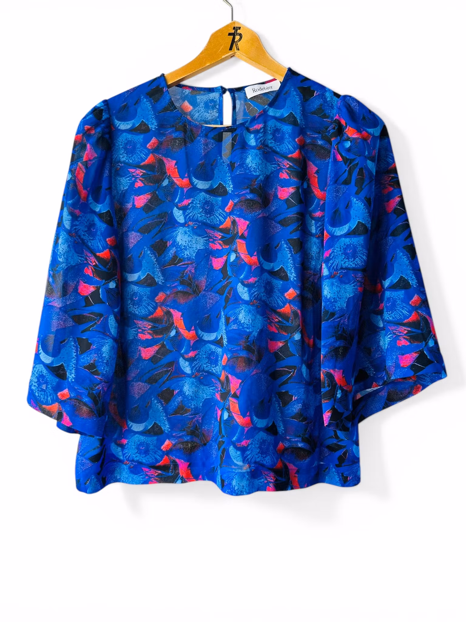 Beskrivning: En riktig färgklick från Rodebjer – en blus som lyfter hela din outfit på en sekund. Det grafiska printet i koboltblått, cerise och svart ger ett konstnärligt uttryck, samtidigt som den avslappnade silhuetten gör den lättburen och modern. Blusen har en rak, något boxig passform med lätt volym i ärmarna som slutar strax ovan armbågen. Den rundade halsringningen med diskret knapp i nacken ger ett rent och stilrent intryck. Nypris ca 2200kr.