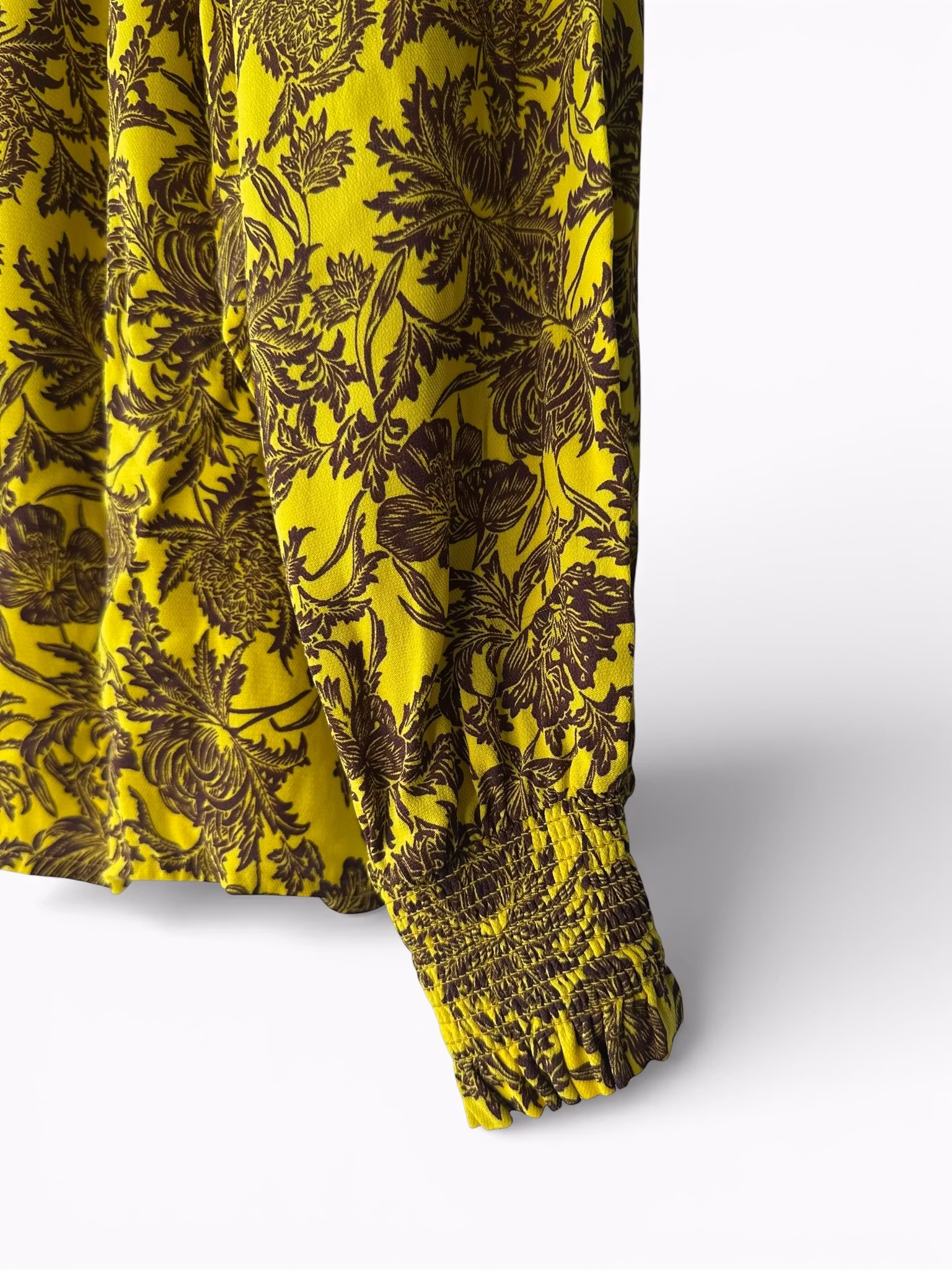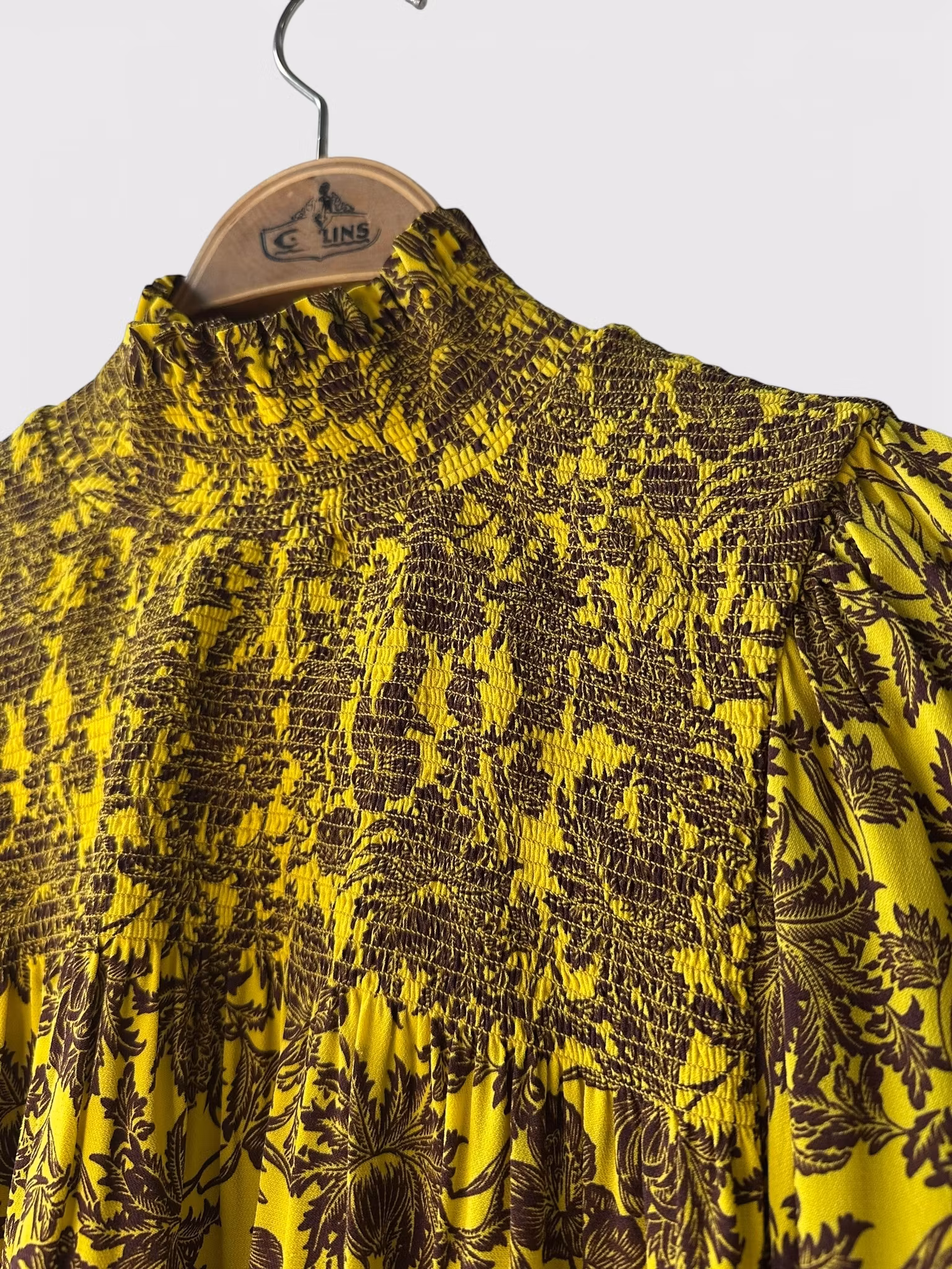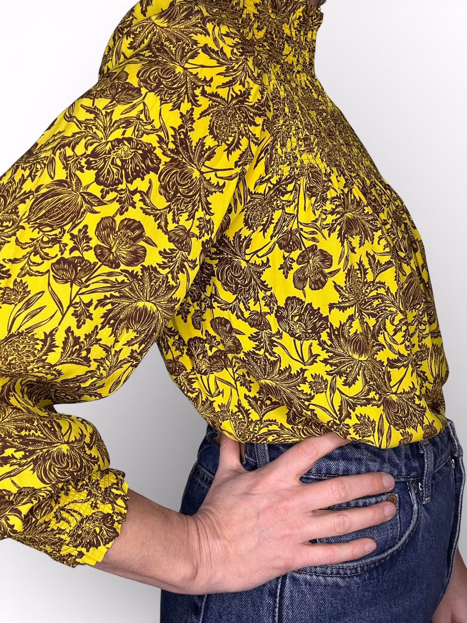 Beskrivning: Vacker blus i viskos från Rodebjer i en klar gul botten med vinrött botaniskt mönster, nästan som en vintage tapet. Modellen heter Demi och har hög smockad hals, smockat ok över axlar och bröst samt långa ärmar med smockade manschetter. Nypris ca 1500kr