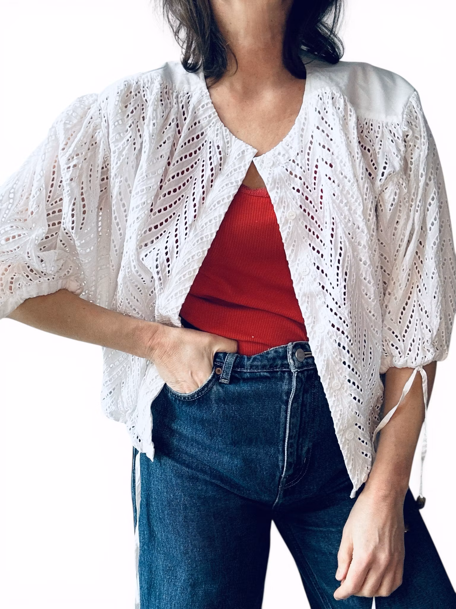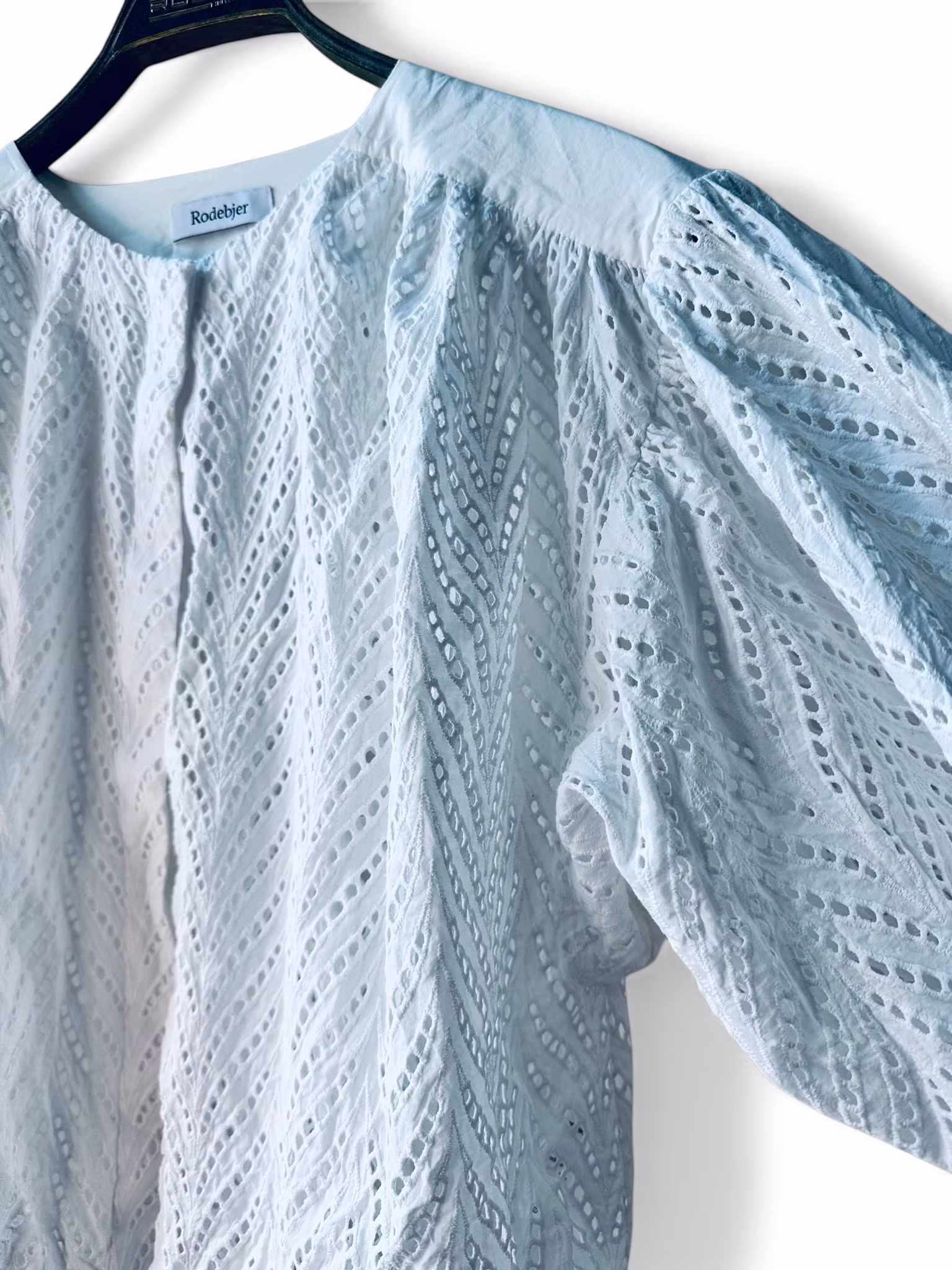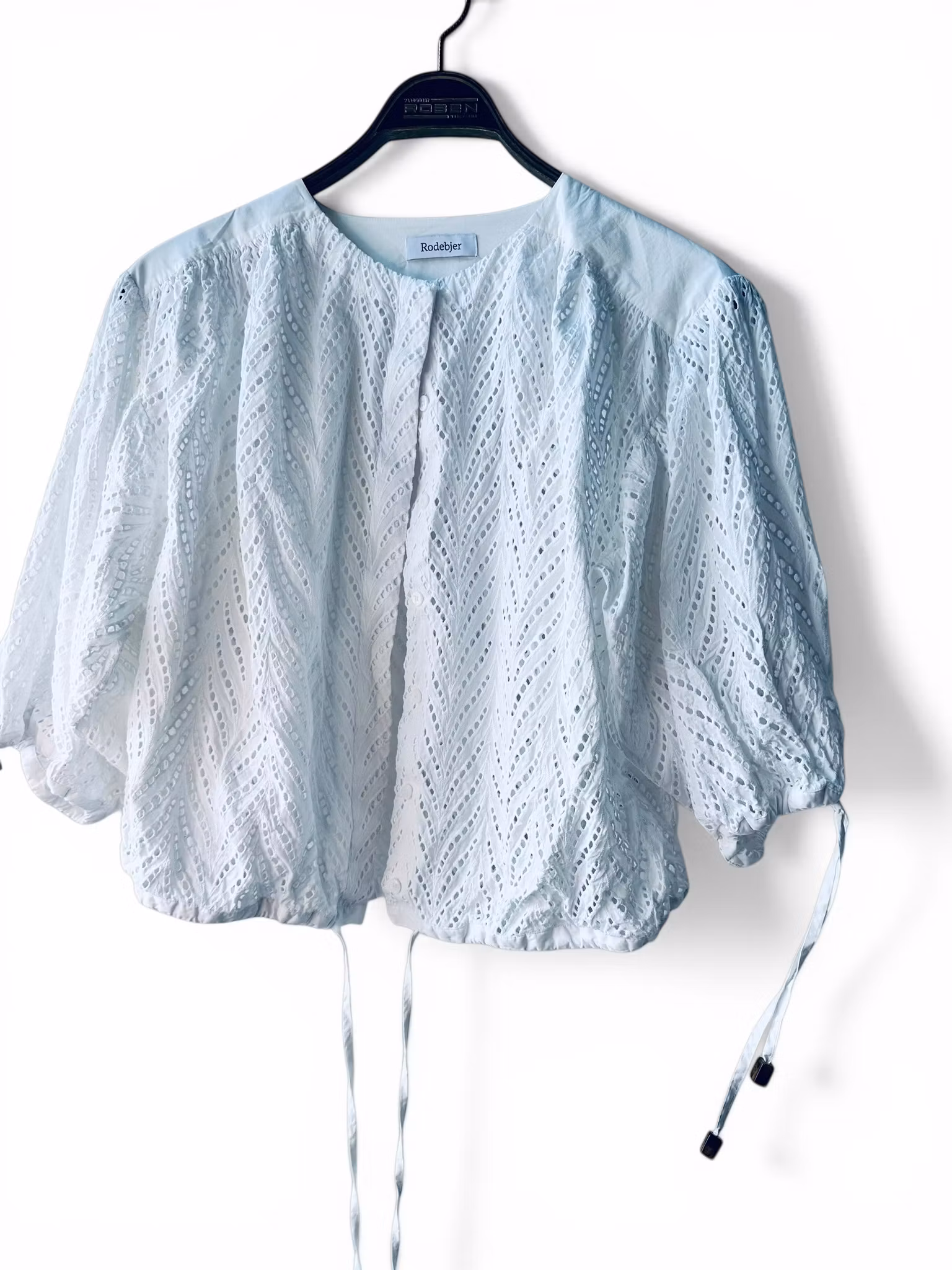Beskrivning: En nutida klassiker från Rodebjer. Deras dramatiska bomullsblus Breeze som kommit i olika utföranden, här hålmönstad och vit. Puffiga ärmar med dragsko i slutet och dekorativa pärlor i ändarna. Samma typ av dragsko återkommer i midjan. Boxig modell med dold knappslå, fin även öppen. De sista två bilderna är lånade produktbilder (den sista i annan färg och utan hålmönster men en inspirerande styling).