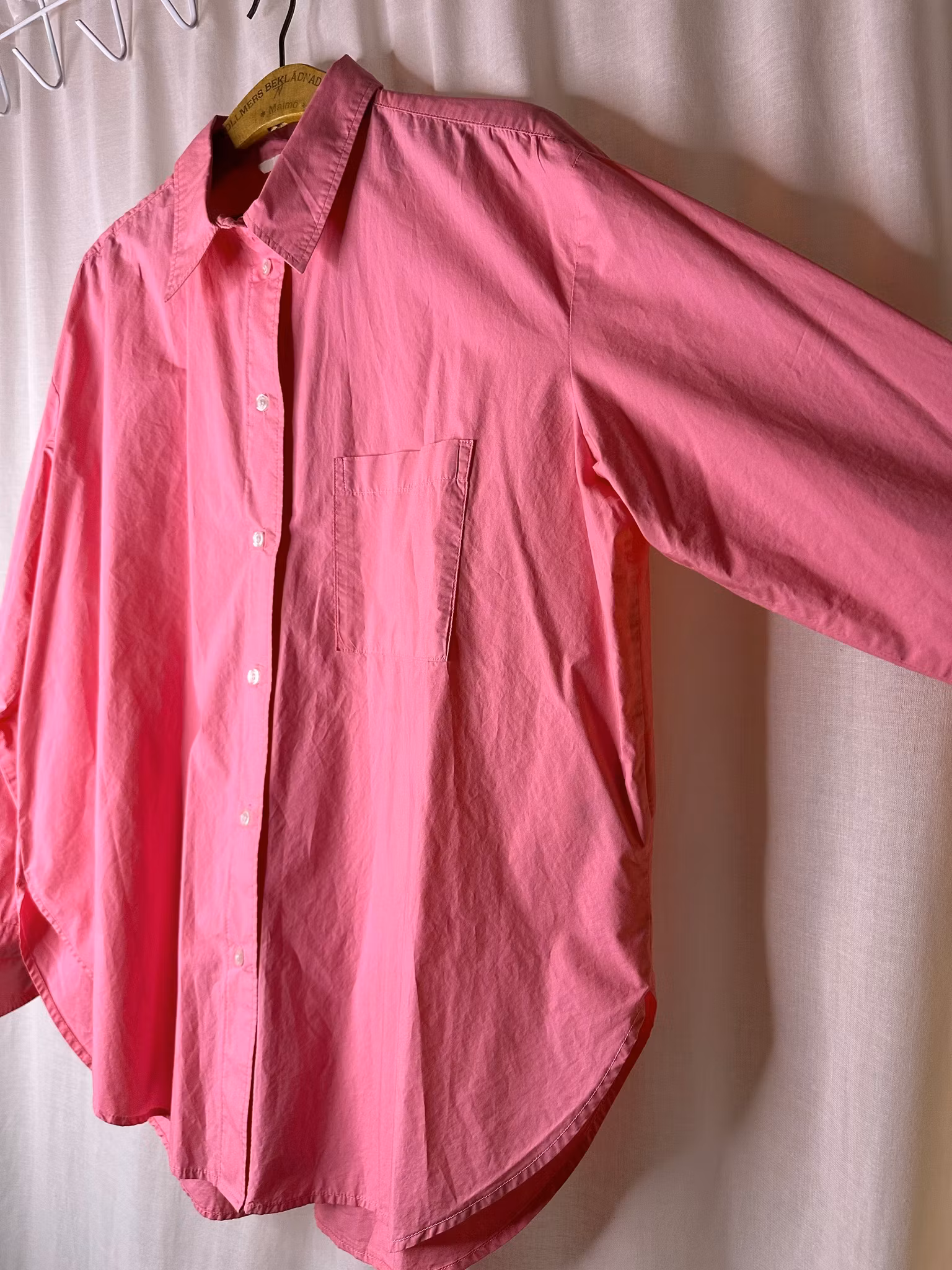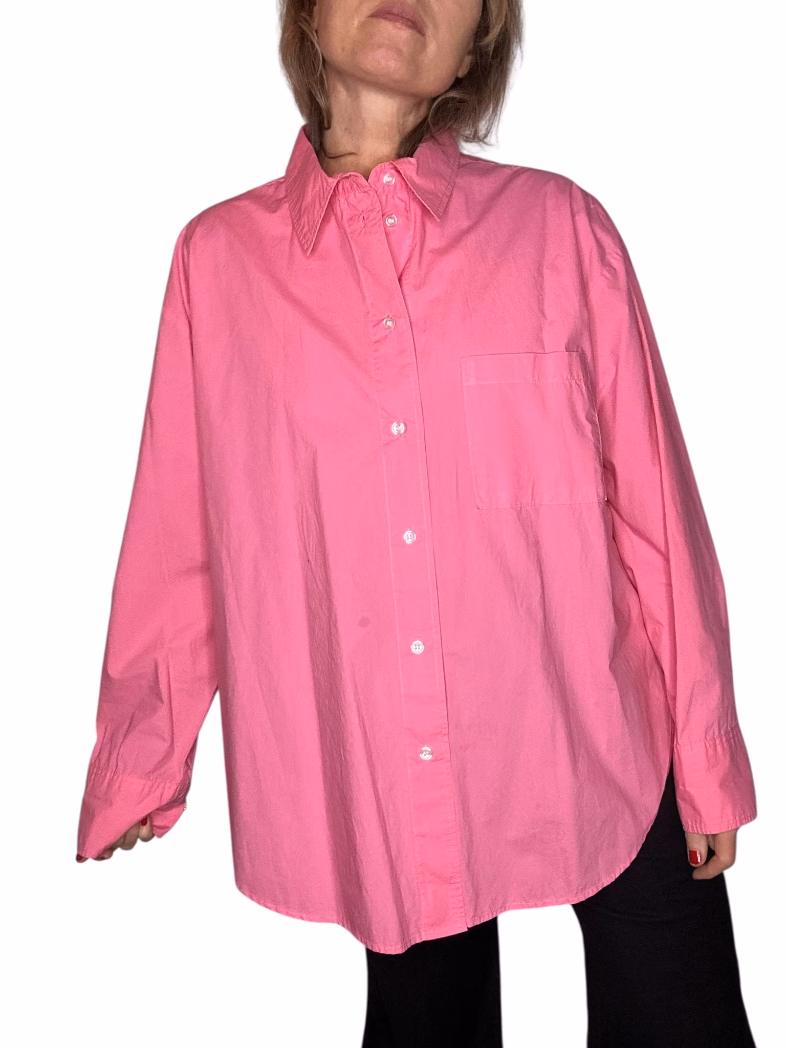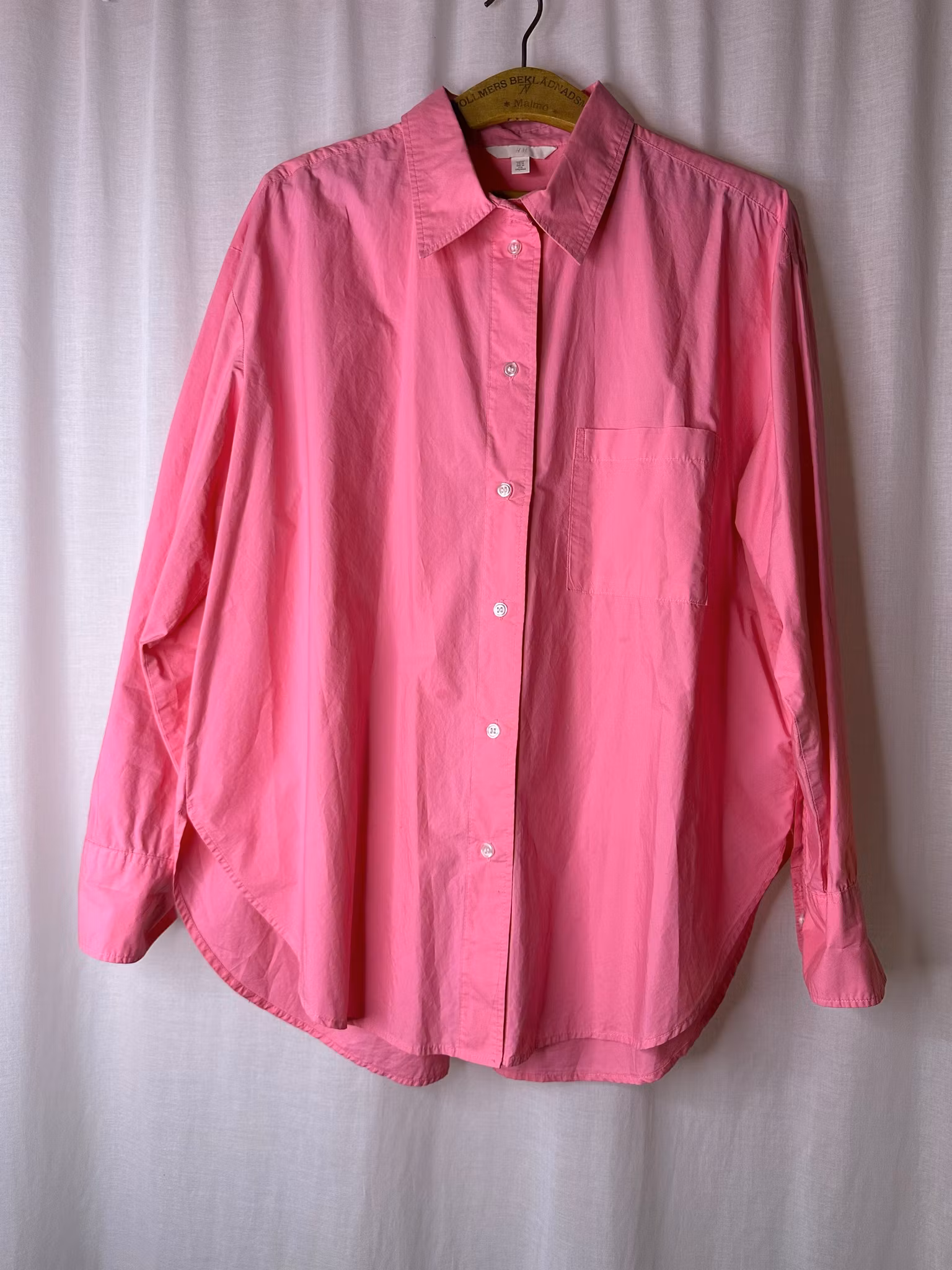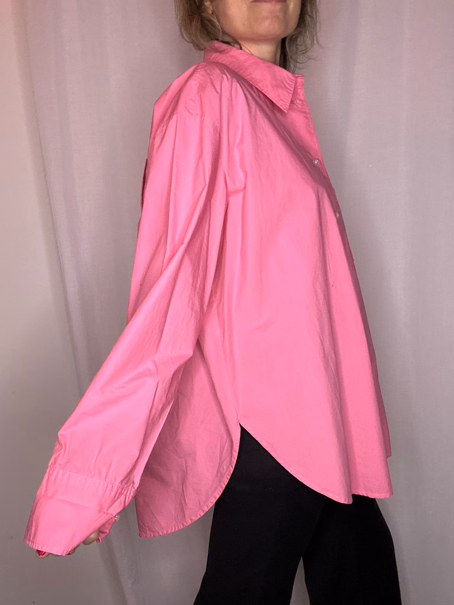 Beskrivning: Krispig bomullsskjorta i vid modell med en stor bröstficka. Inte helt olik Hopes klassiska modell Elma. Men denna i härligt rosa är från HM.