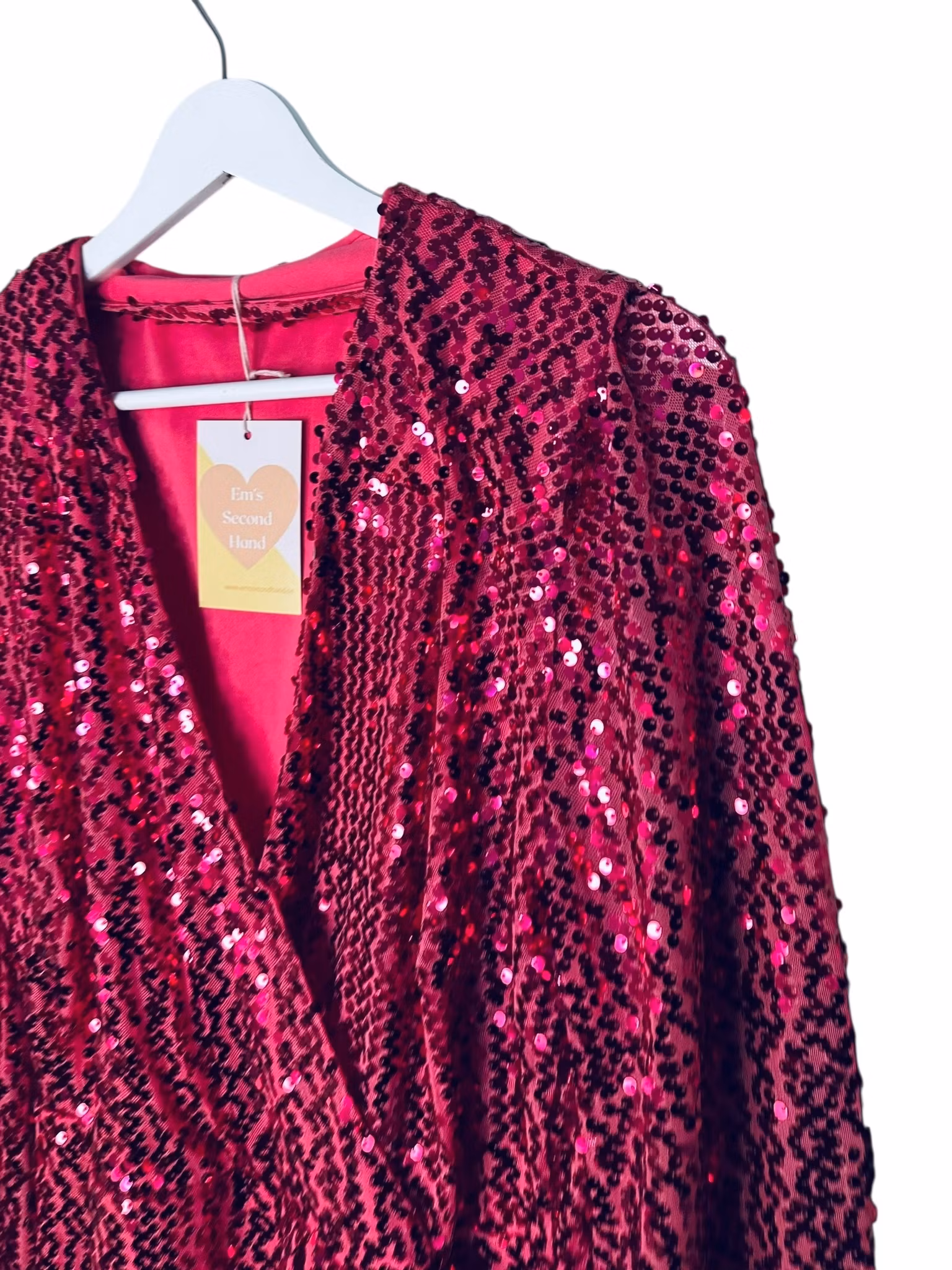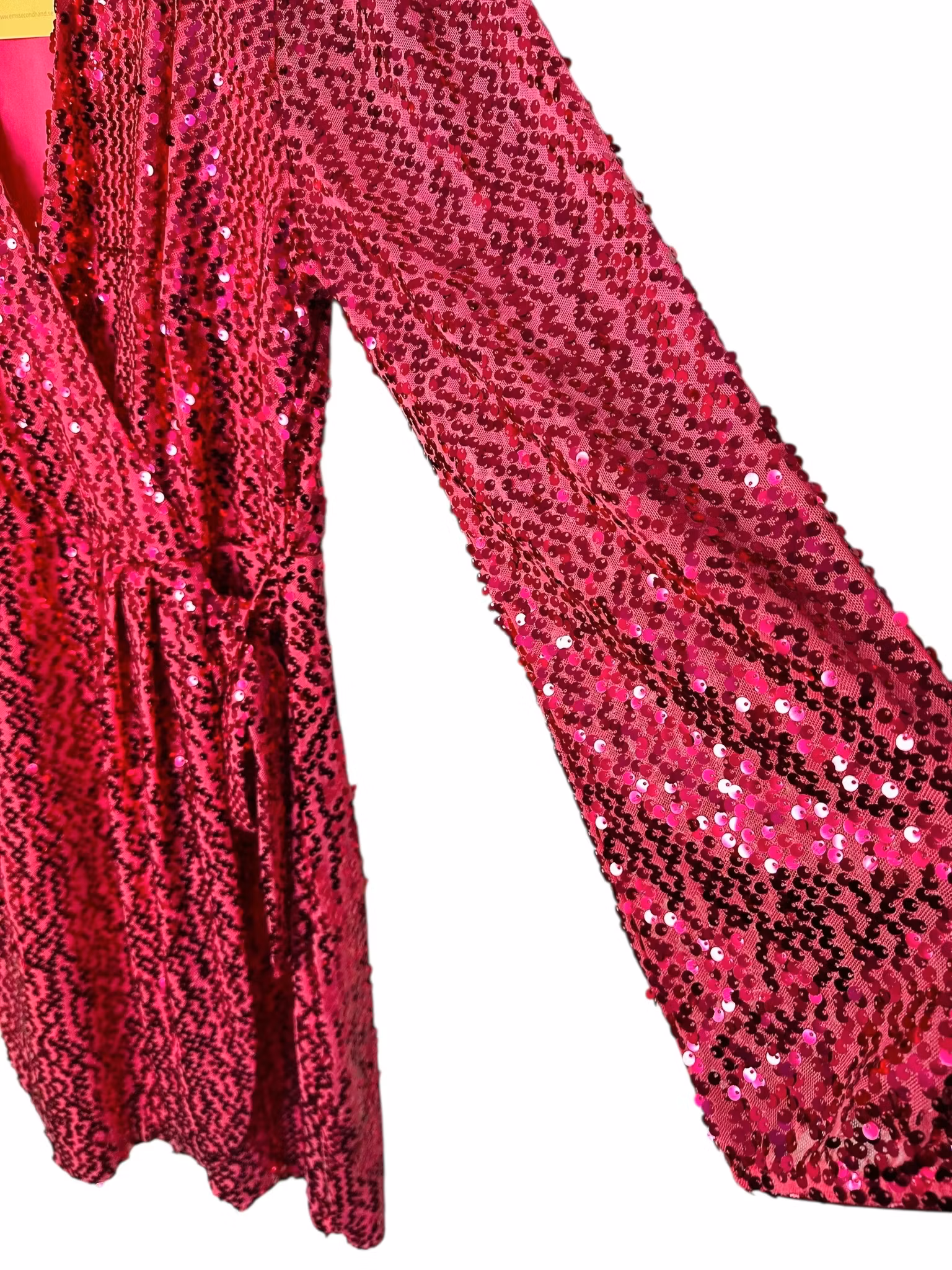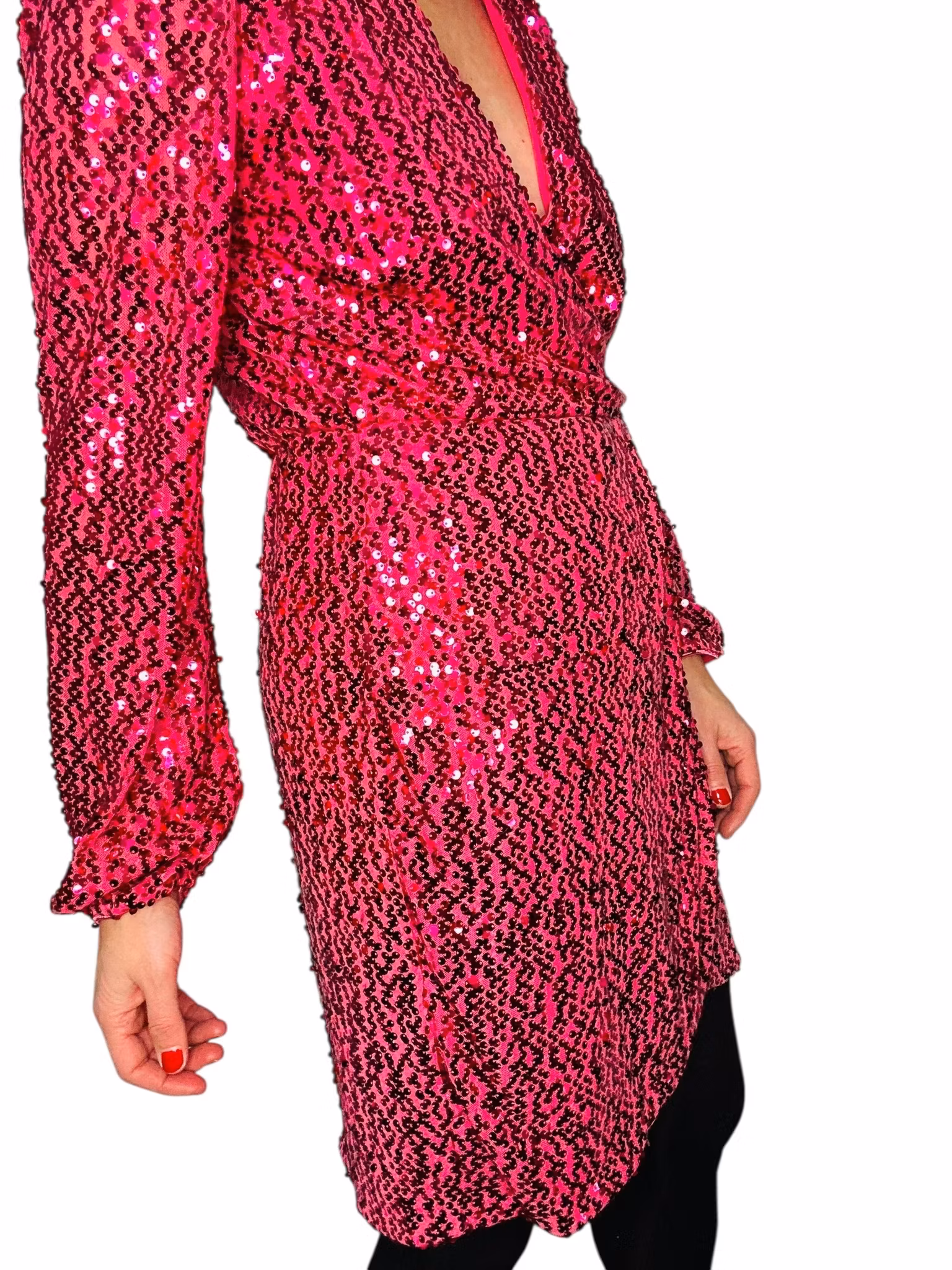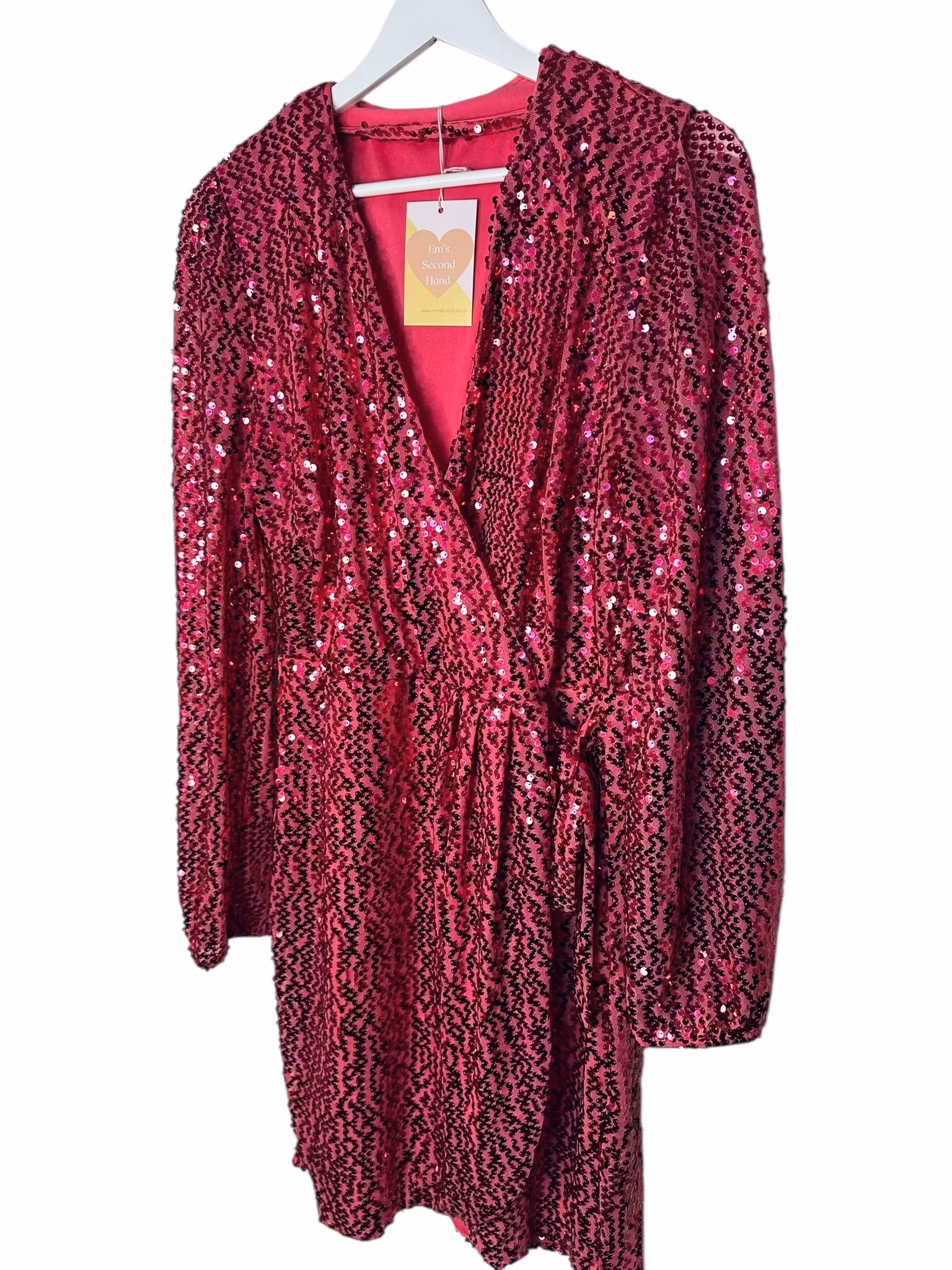 Beskrivning: Rosa klänning i sydd omlottmodell med paljetter. Lång, klockad ärm och v-ringad hals. Lappar saknas men uppskattas passa ca M, se mått.