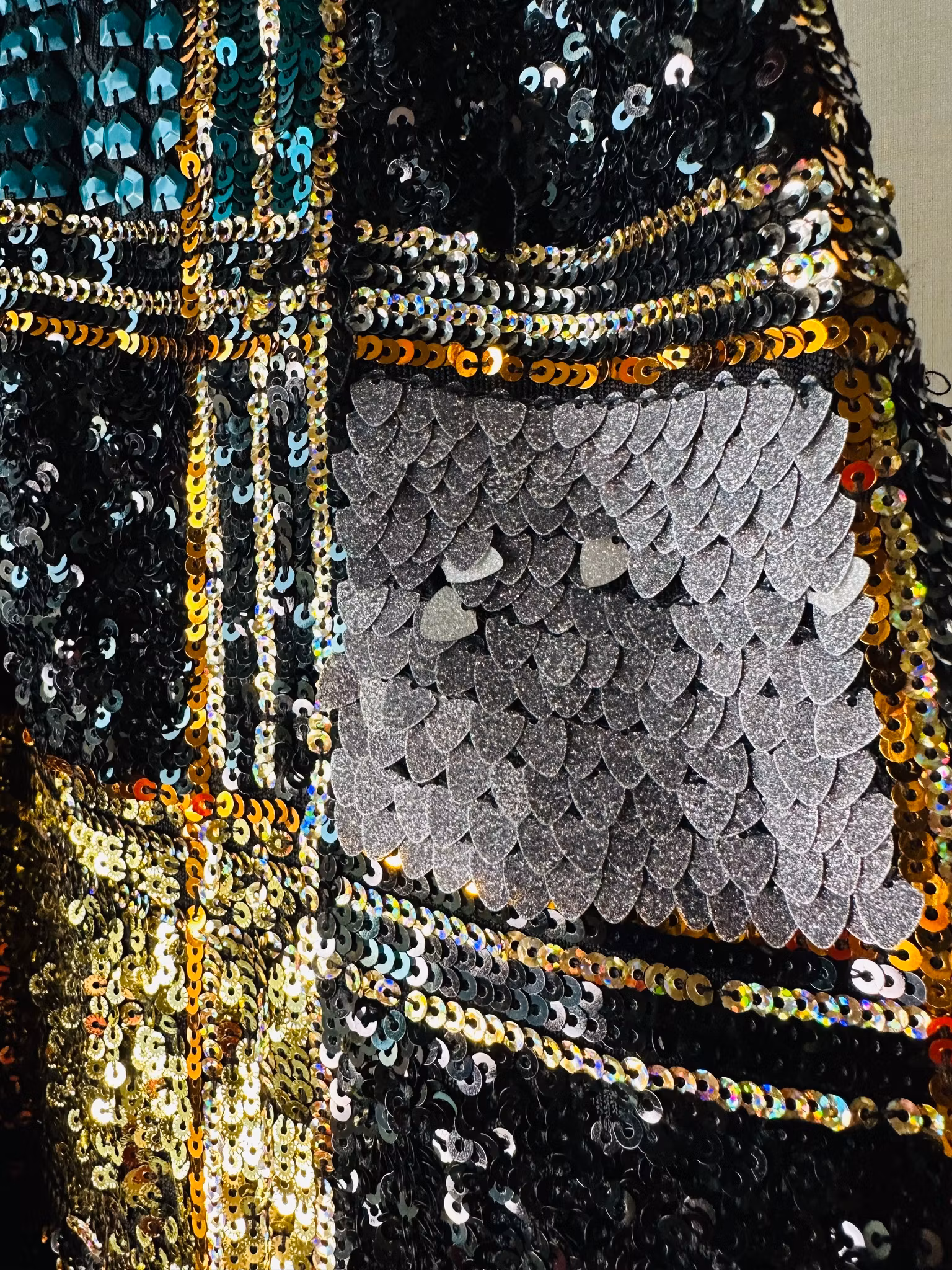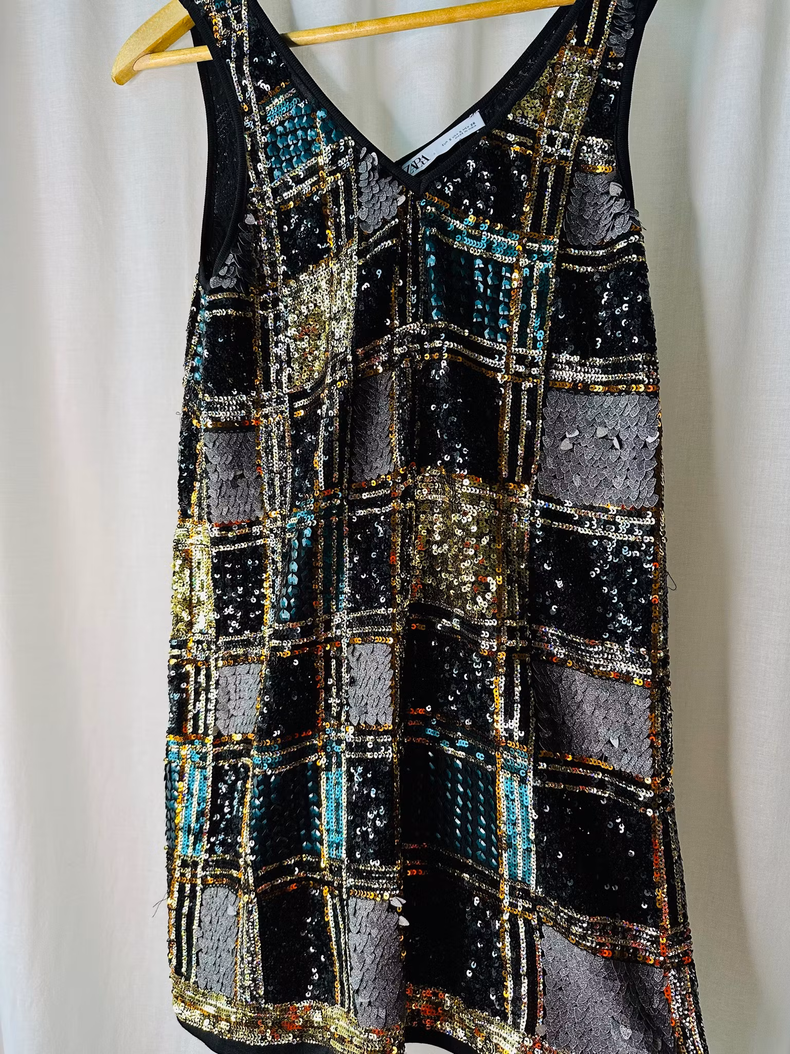 Beskrivning: Kul miniklänning med rutor av paljetter av olika slag. Ränderna är guldiga och rutorna fyllda med bl a guldpaljetter, silvriga hjärtformade glitterpaljetter, sexkantiga gröna paljetter mm. Från Zara.