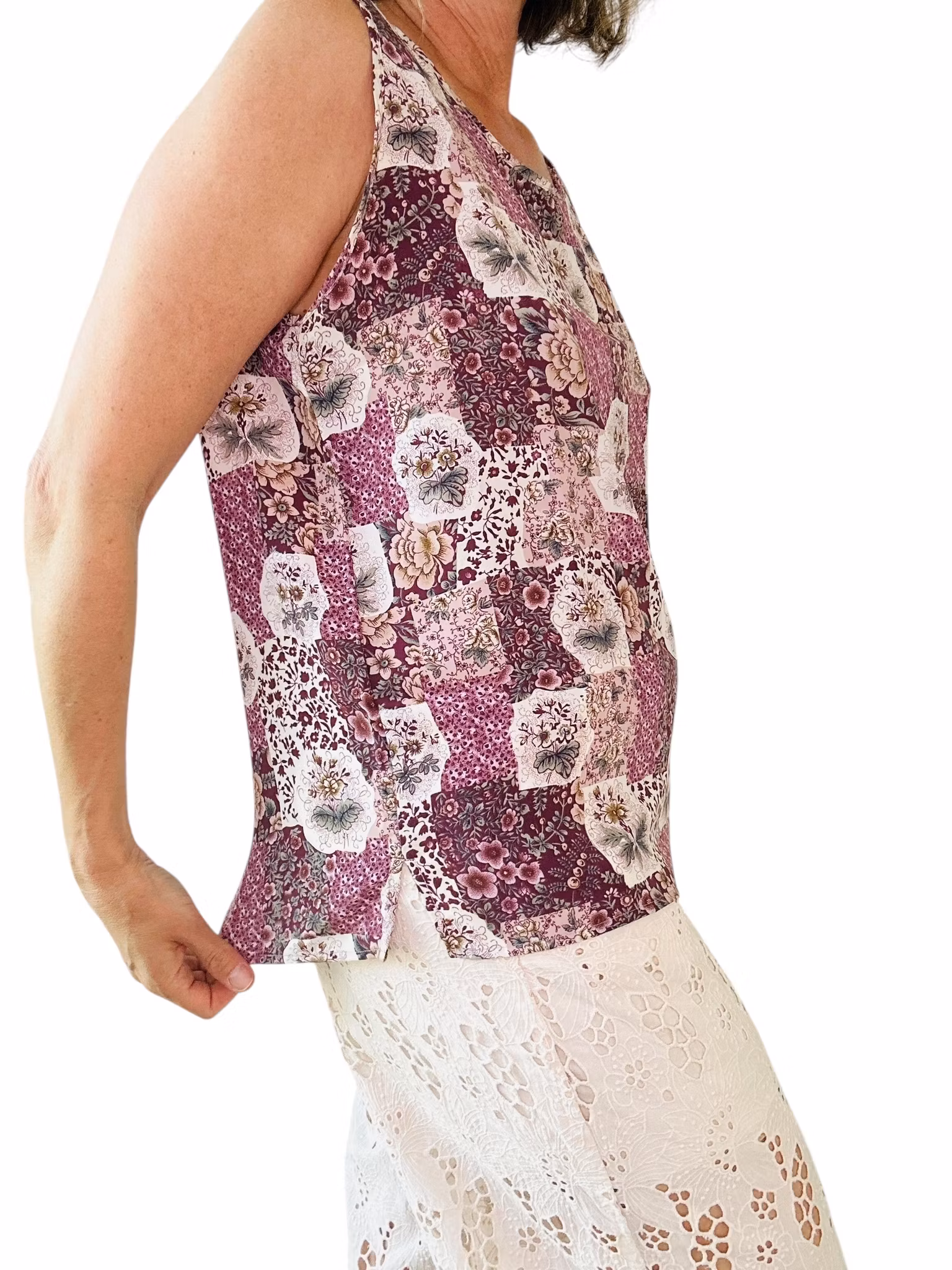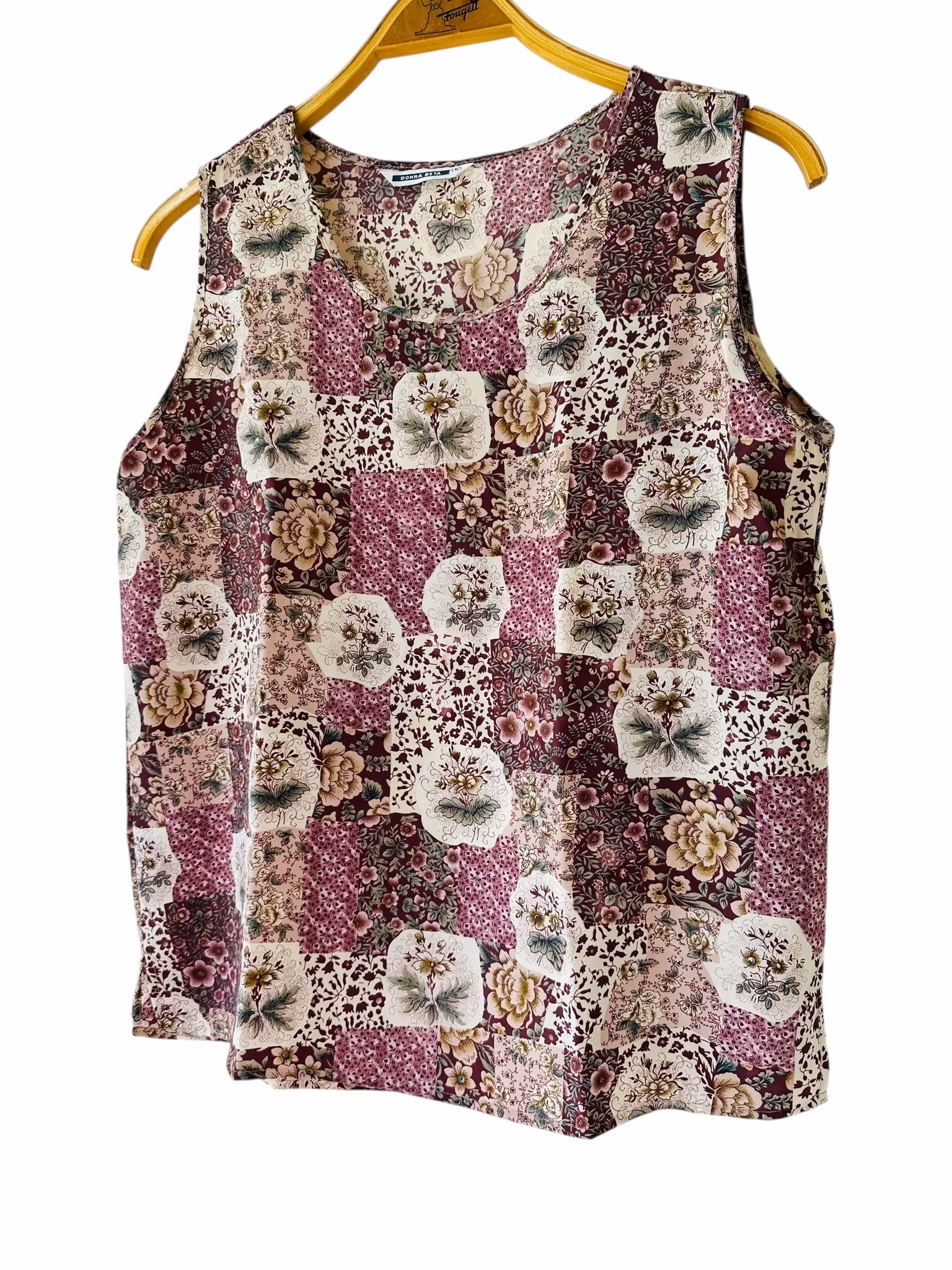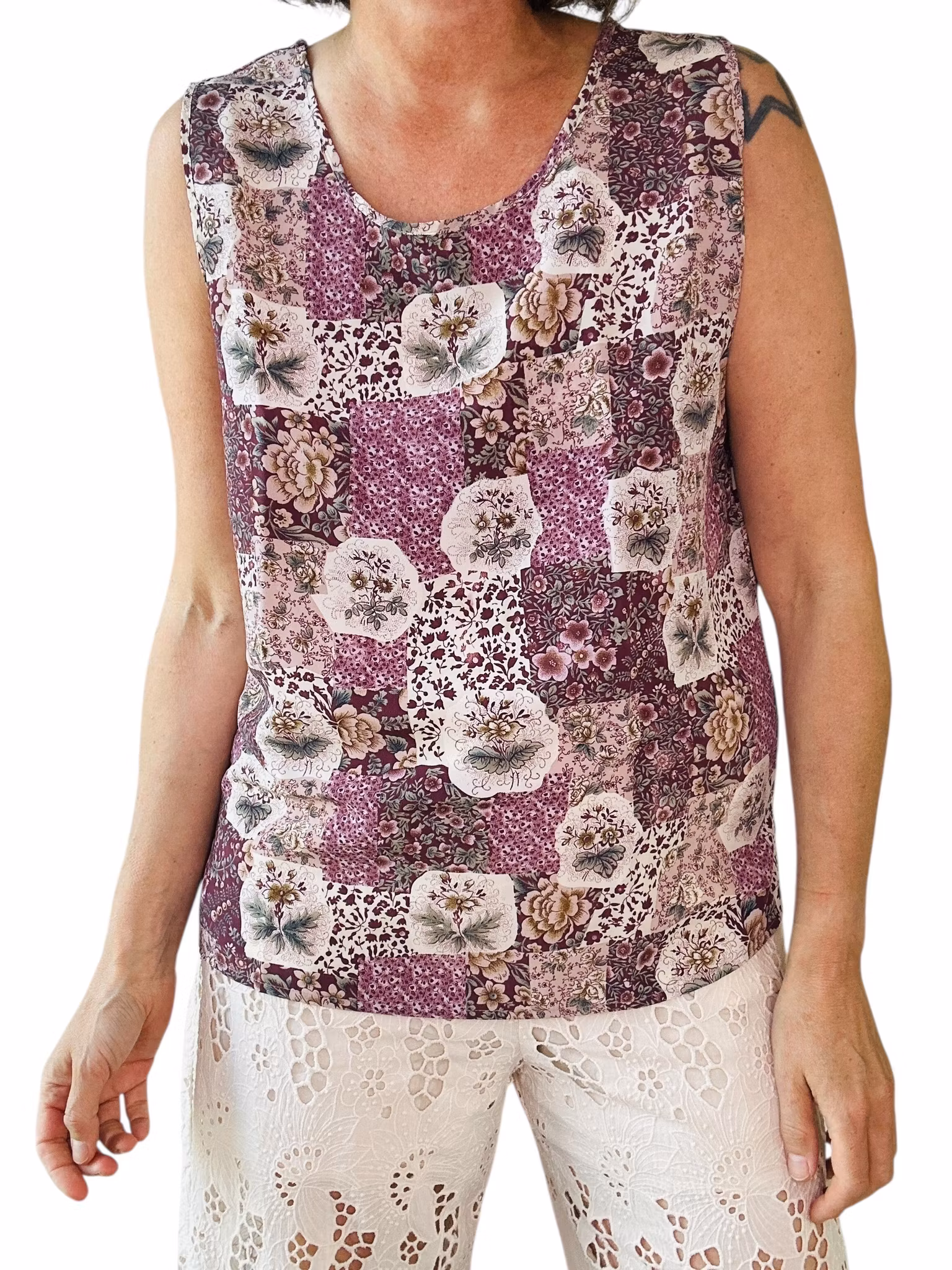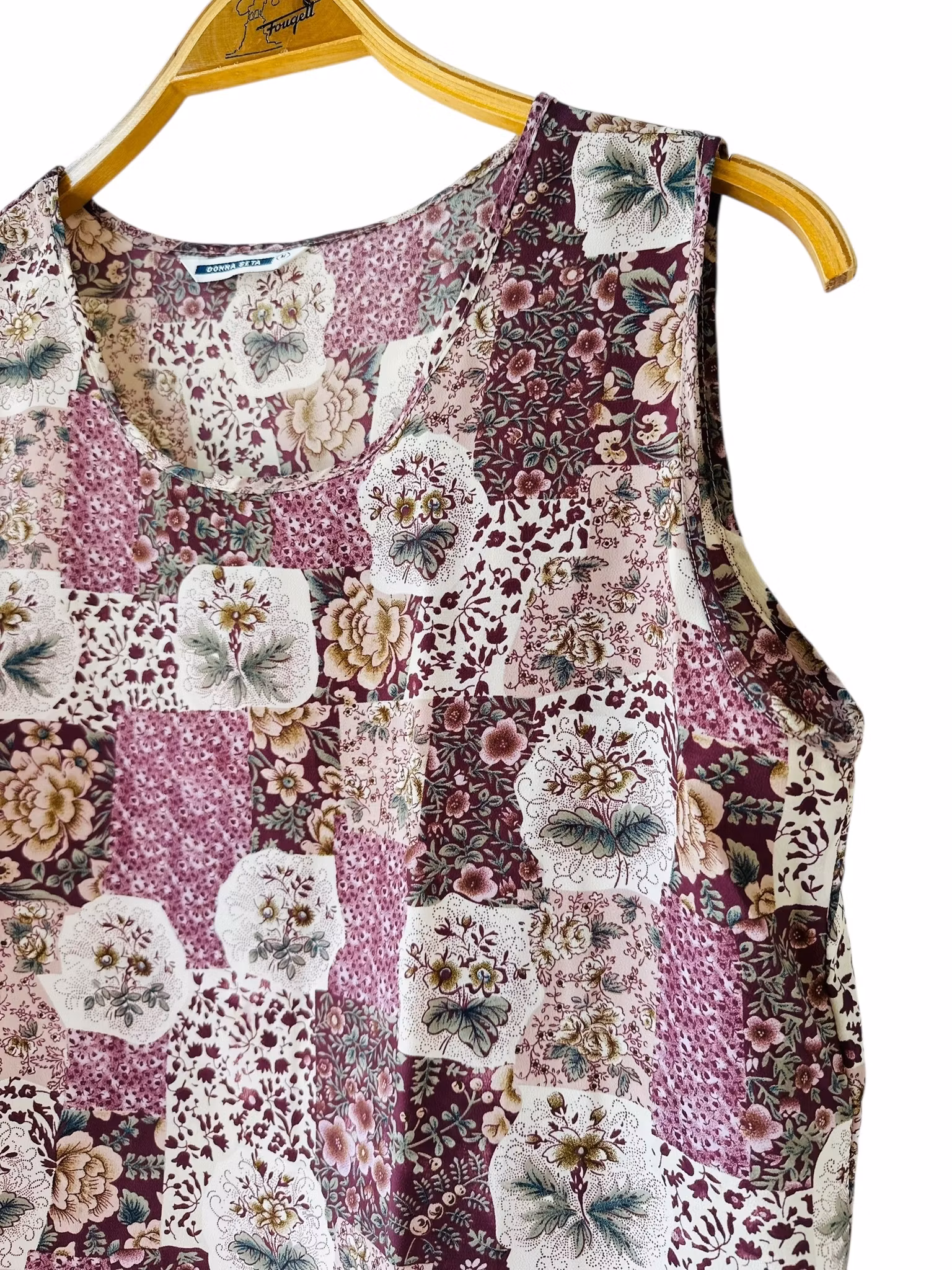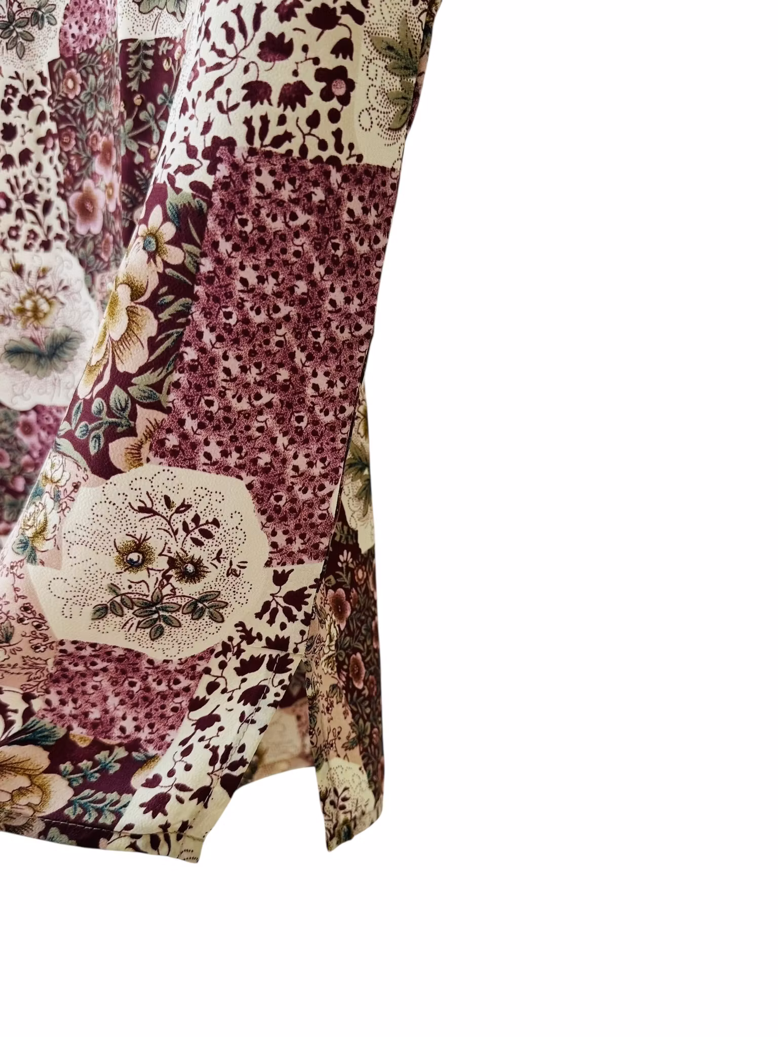Beskrivning: Italienskt sidenlinne i typiskt 90-talsmönster i lila, vinröda och rosa toner med blommor i ett rutmönster. Rund halsringning och små sprund i sidan. Tätt vävd siden som är nära nog strykfritt och liksom prassligt snarare än tvåligt.