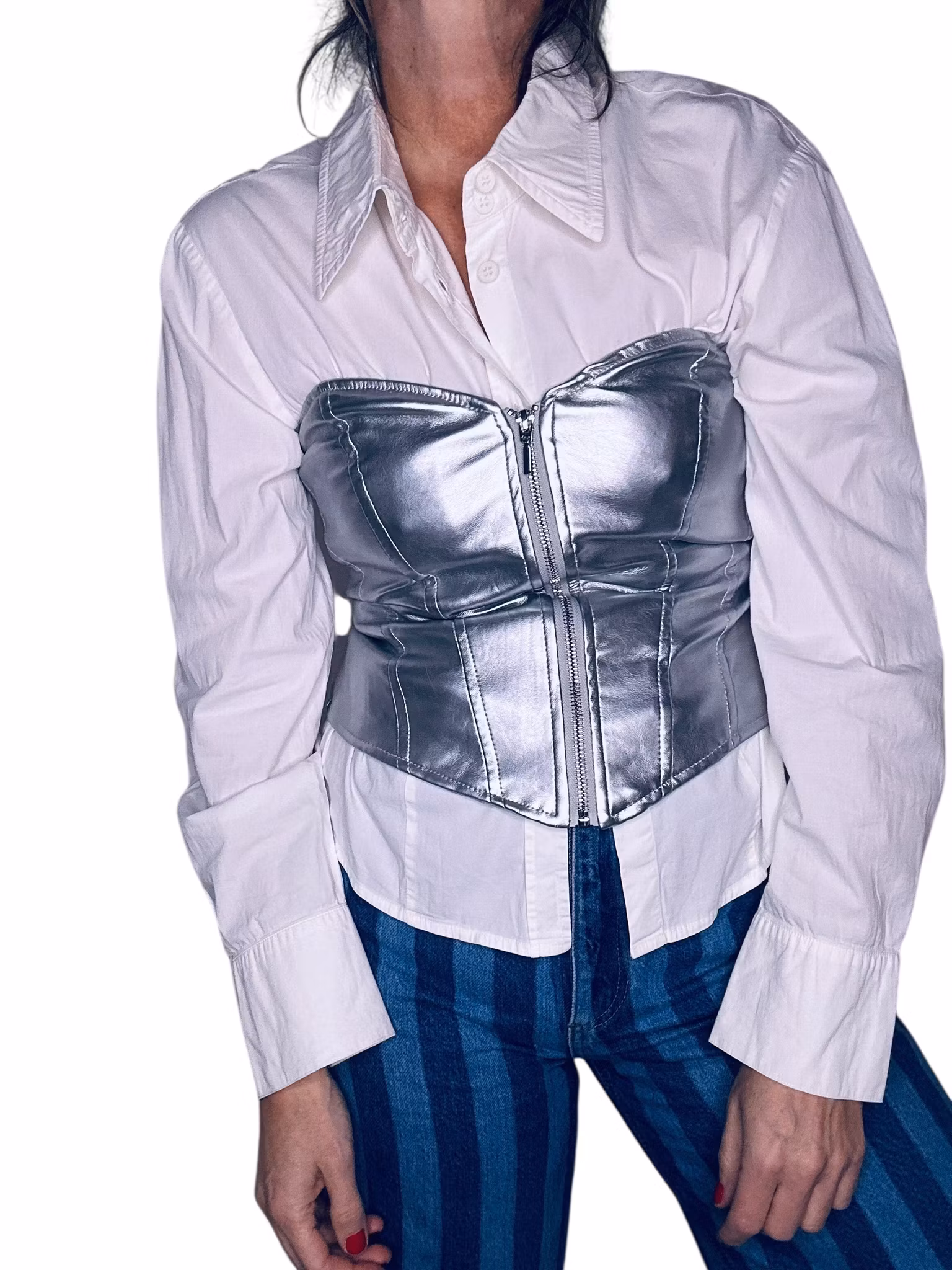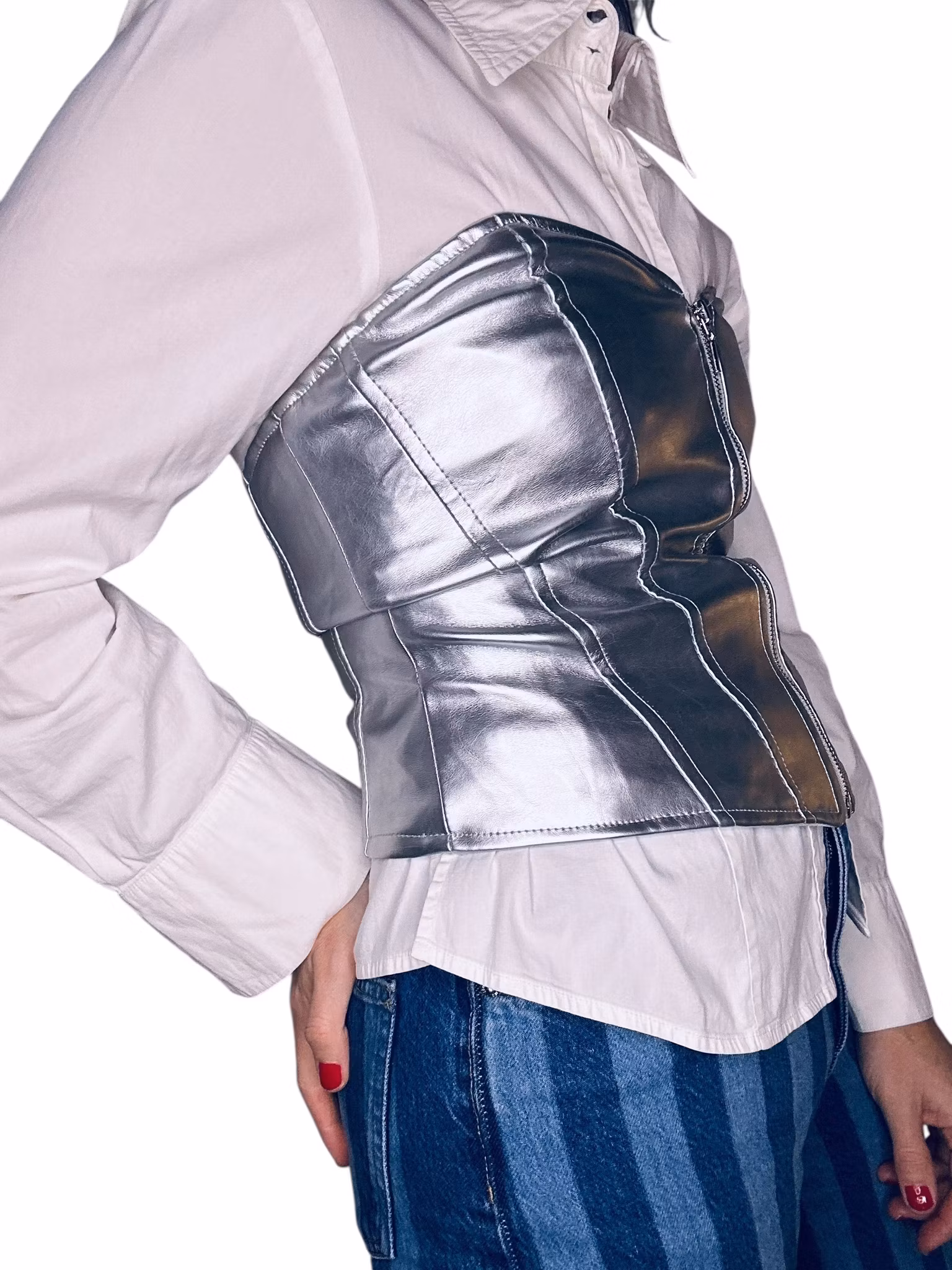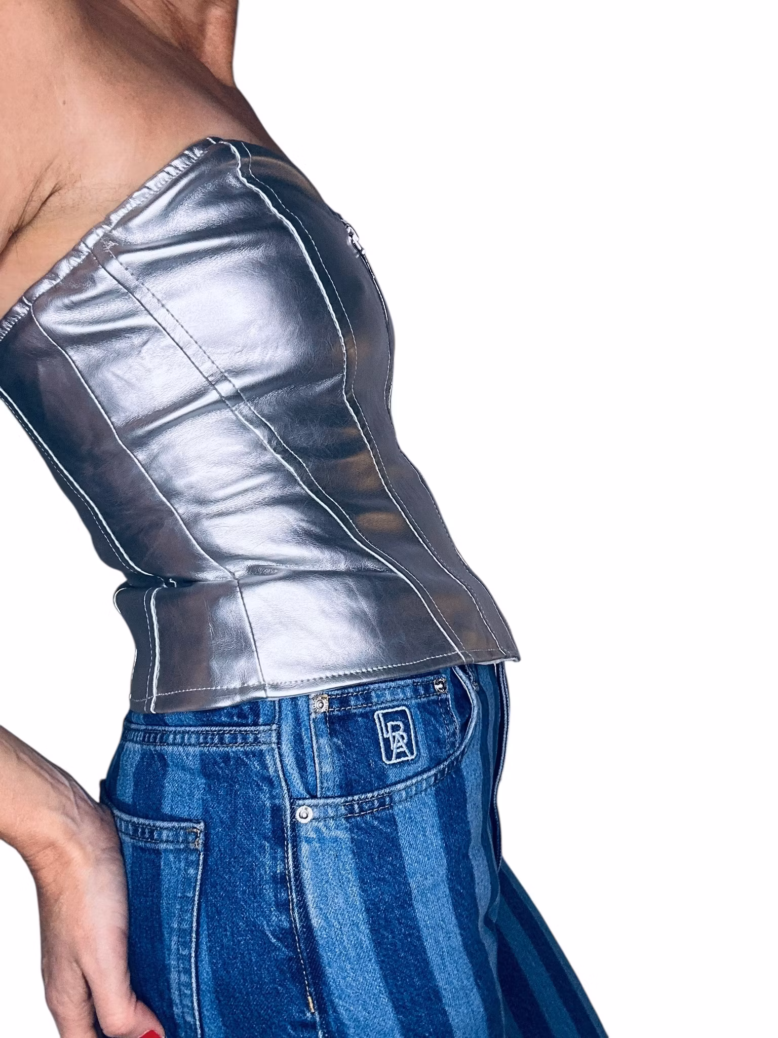 Beskrivning: En silverfärgad, blank topp i tajt korsettmodell. Helfodrad och stängs med dragkedja framtill. Stretchig.