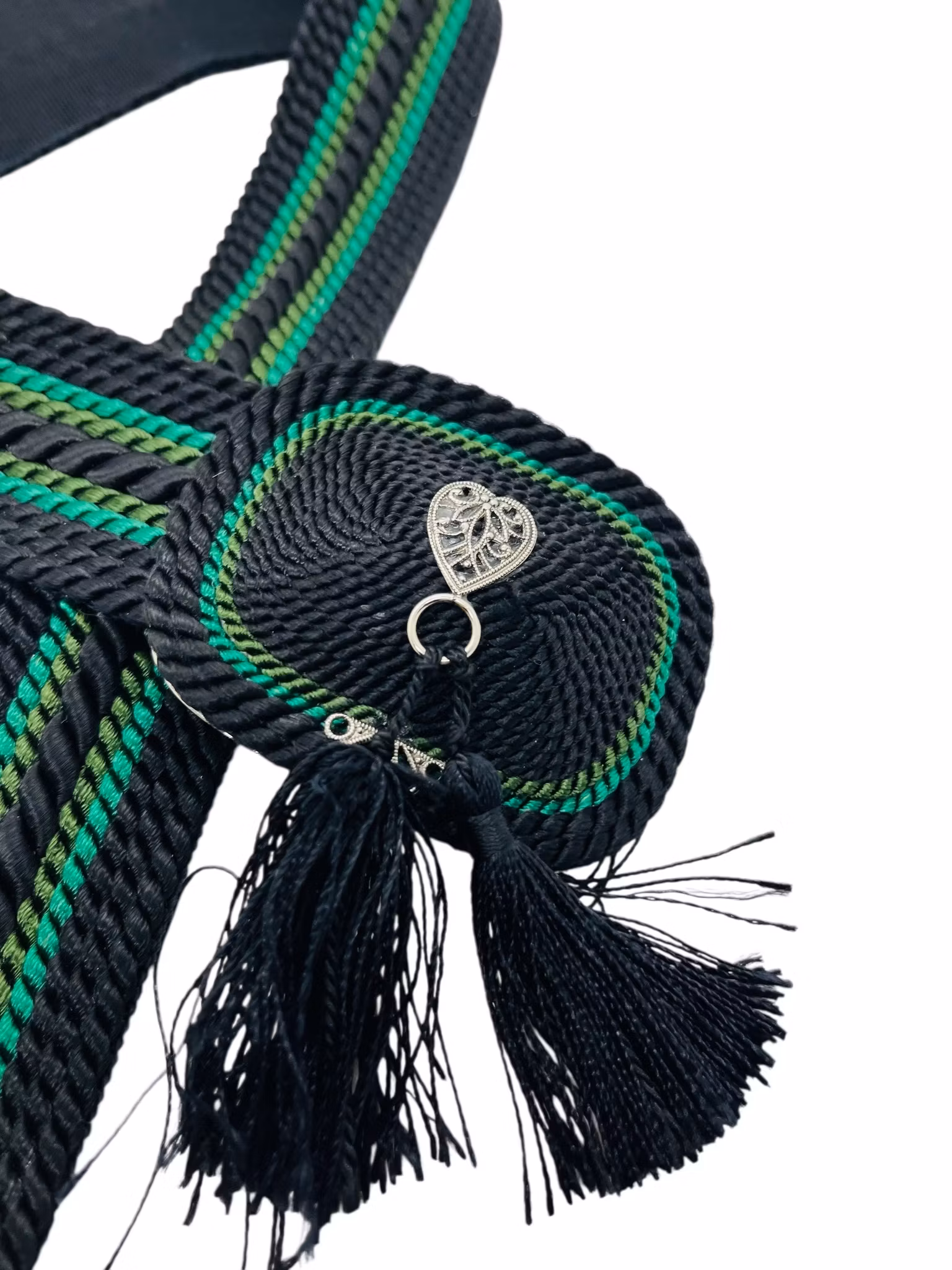 Beskrivning: Bälte i svart textil med repdetaljer och en tofs i svart och grönt. Stängs med silvermetallspänne på baksidan.