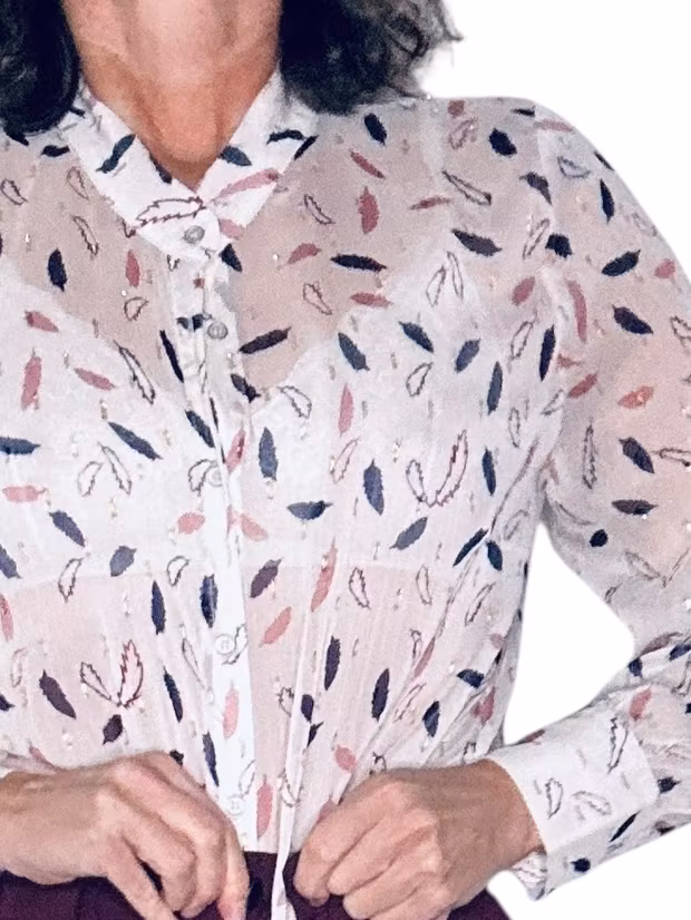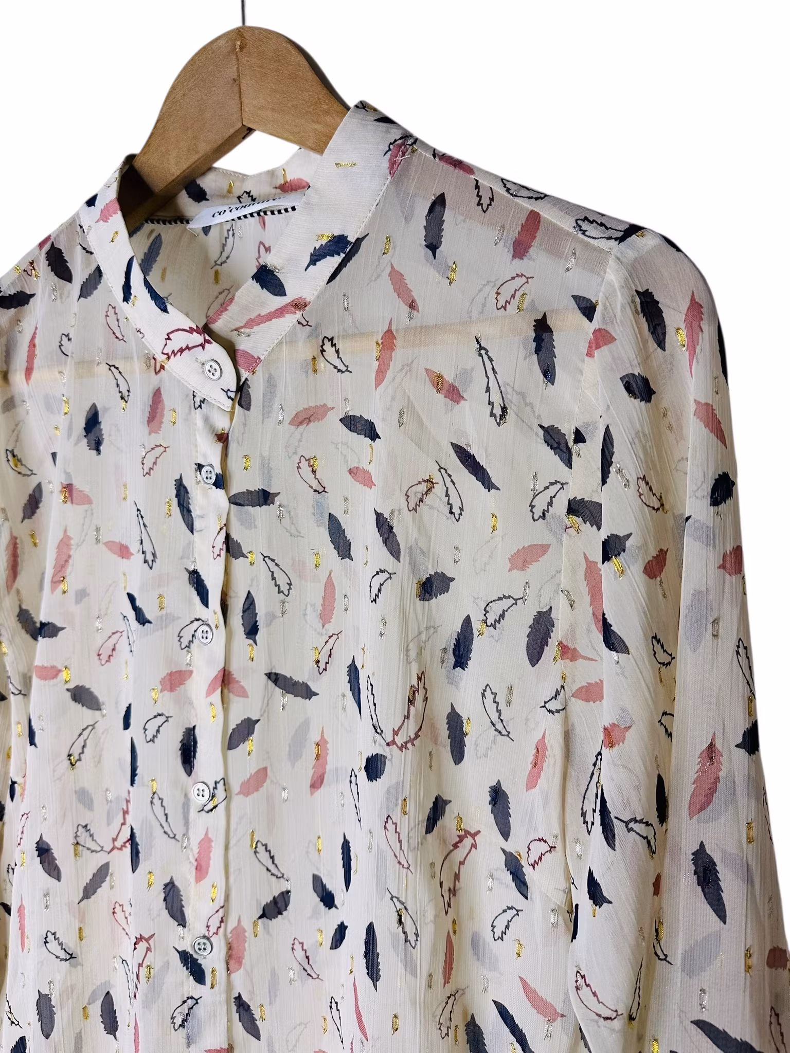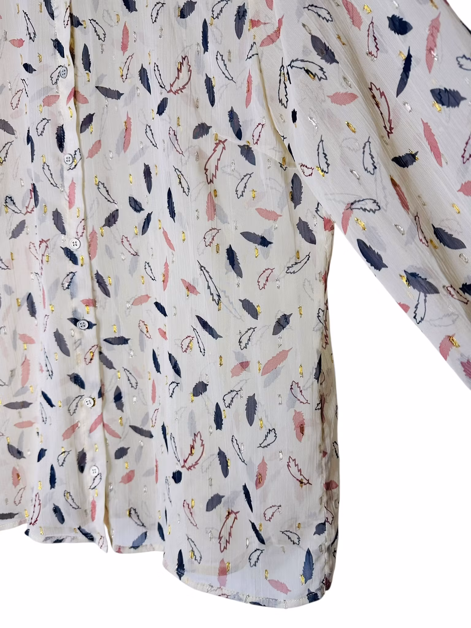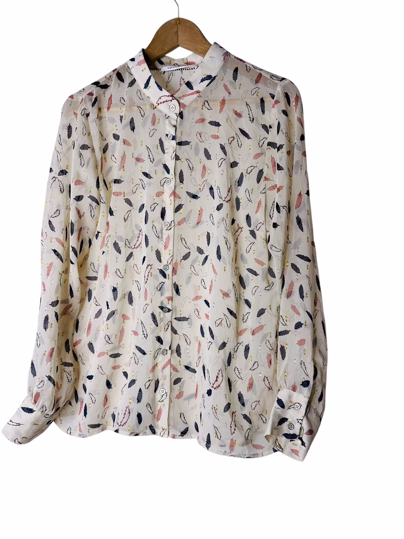 Beskrivning: Blus i skirt material, cremefärgad botten och ett print av fjädrar i rosa, svart, guld och silver. Rund hals utan krage, voluminösa ärmar som avslutas av smala manschetter med knapp och rak nederkant. Från danska Co'Couture.