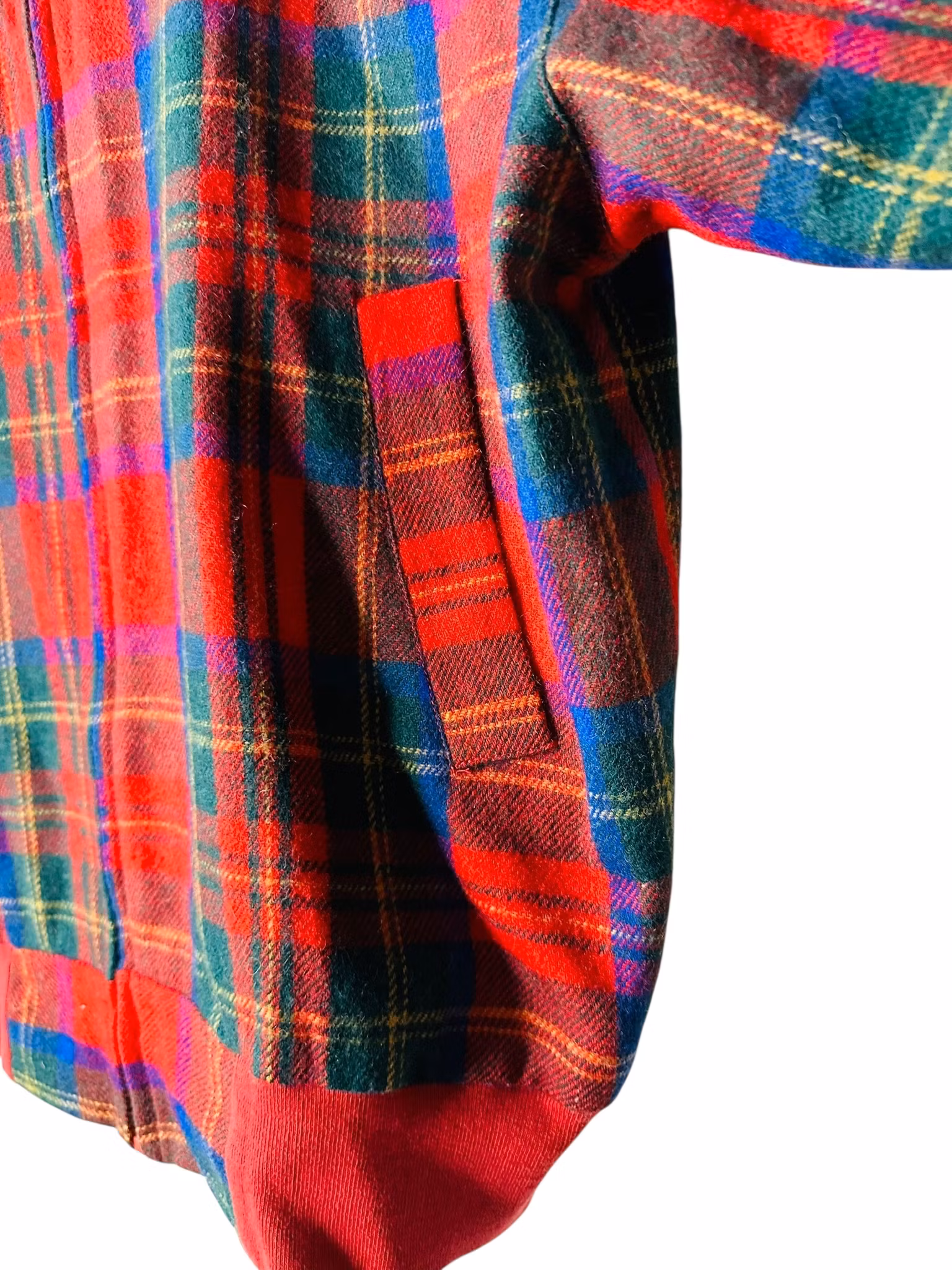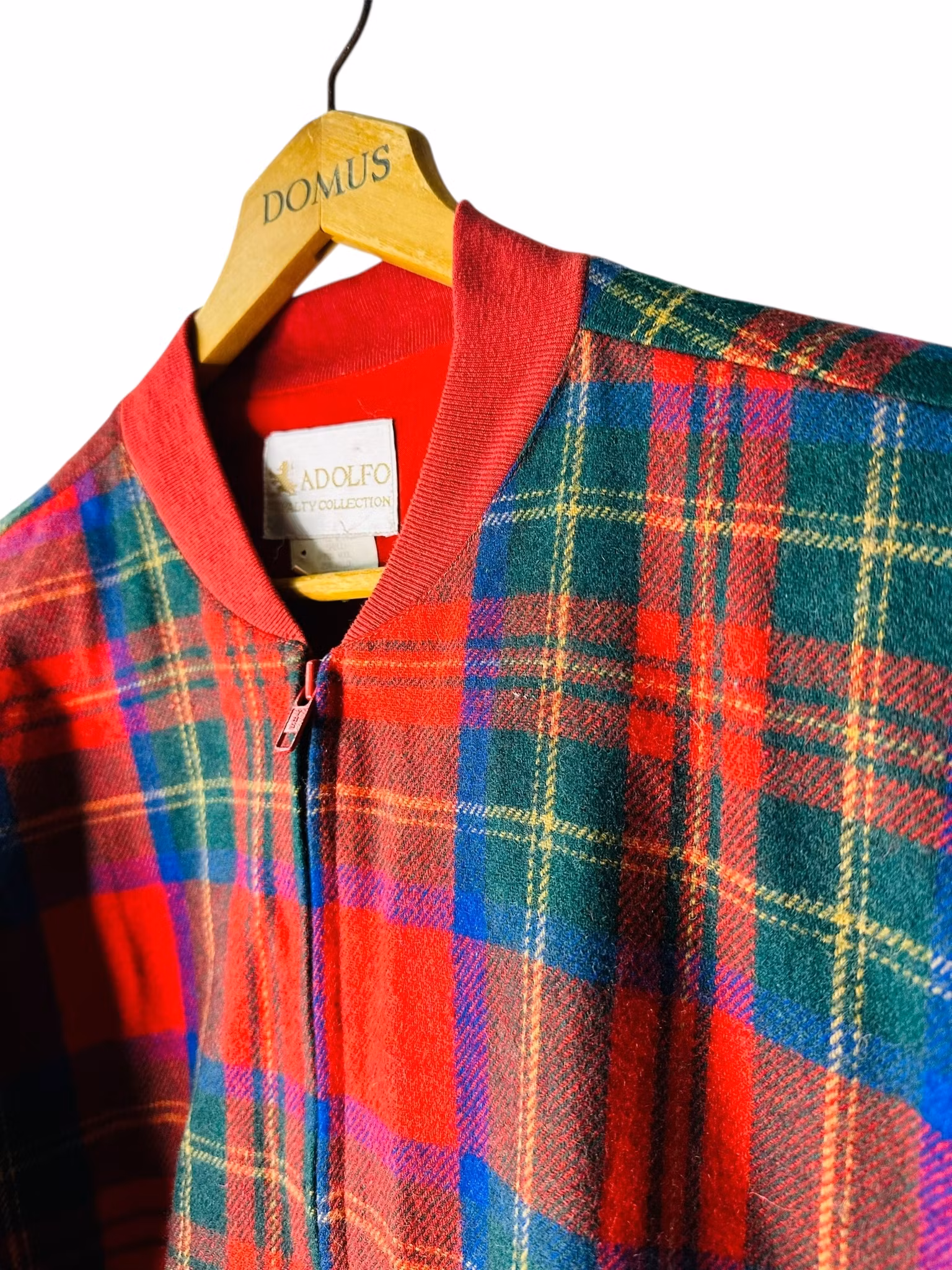 Beskrivning: Så snygg bomberjacka i skotskrutig ullmix. Vintage med breda axlar och axelvaddar. Röd mudd nertill, i halsen och i ärmslut. Dragkedja hela vägen ner framtill. Fickor i sidorna. Helfodrad i rött. En pärla att använda inomhus istället för kavaj och som utejacka höst/vår! Från Adolfo Royalty Collection.