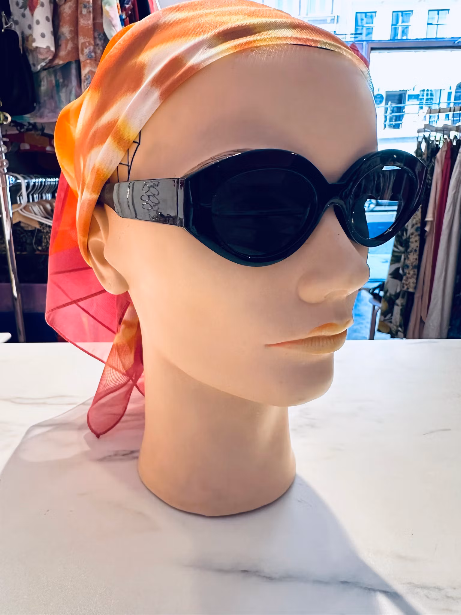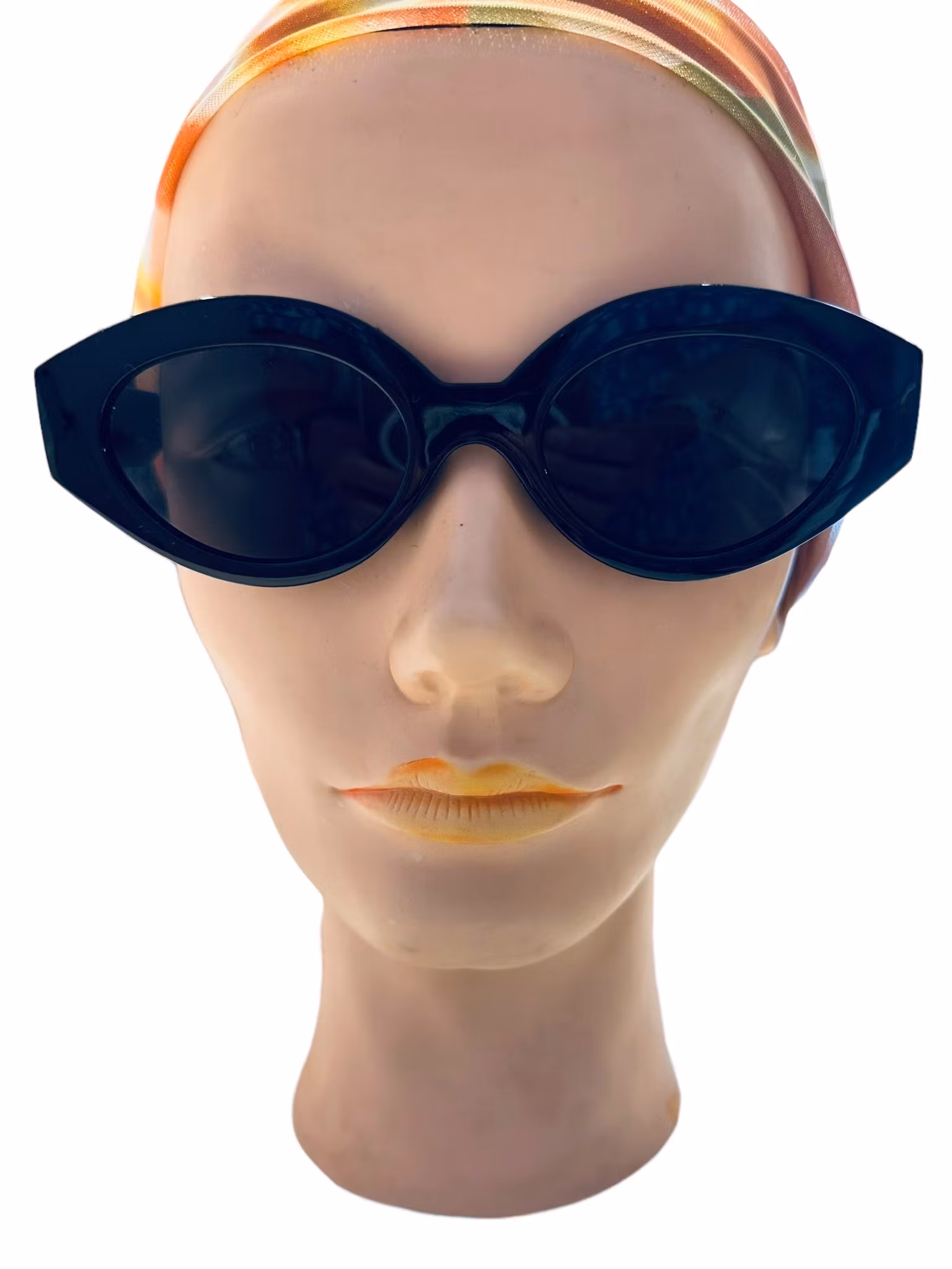 Beskrivning: Solglasögon med svarta smala bågar.