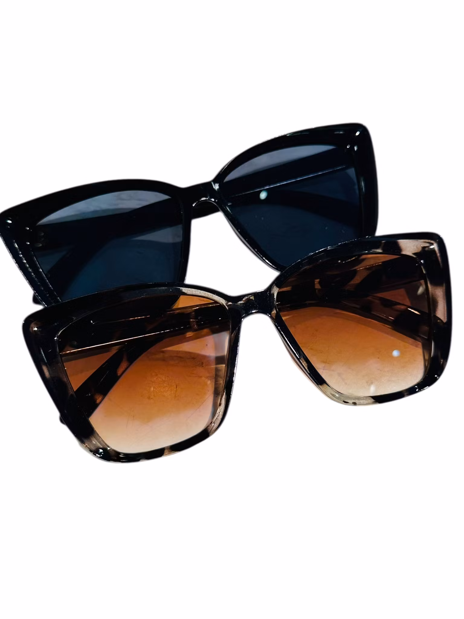 Beskrivning: Stora solisar med svarta bågar som är lite kattformade.