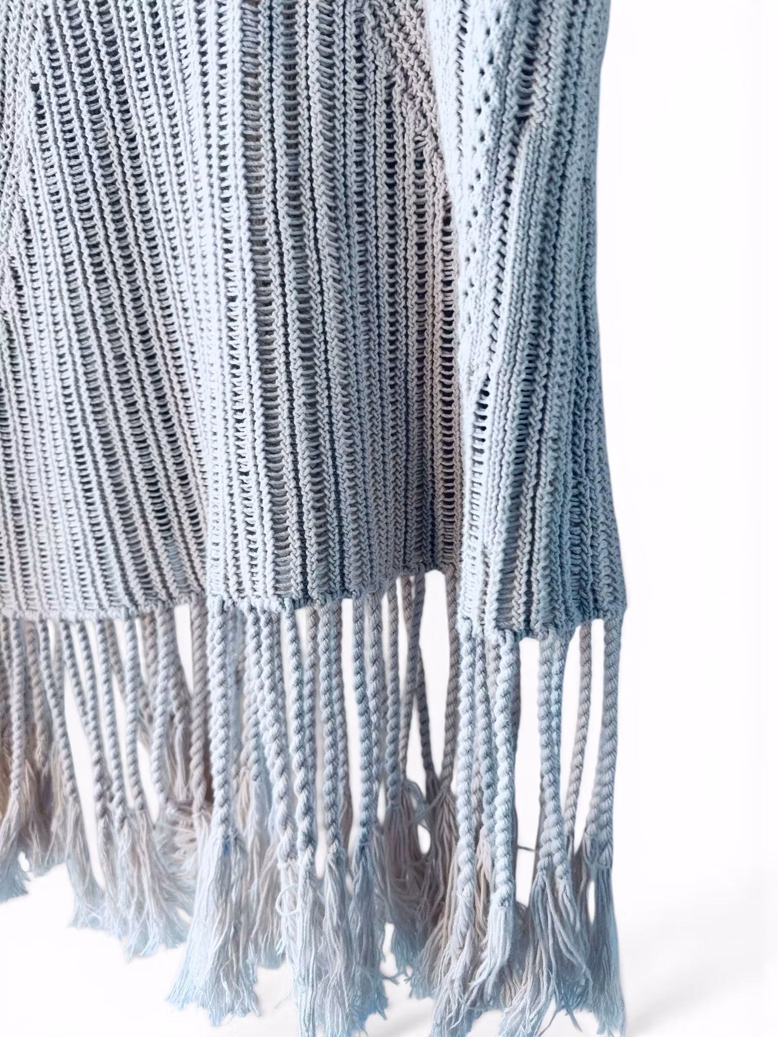 Mått: Bröst 57 cm (mätt rakt över armhåla till armhåla), längd 65-83 cm (med eller utan fransar)