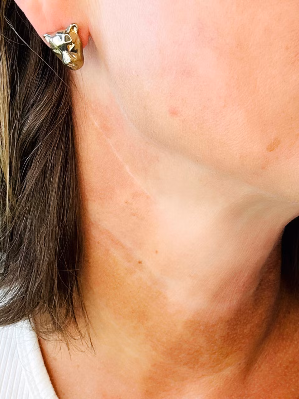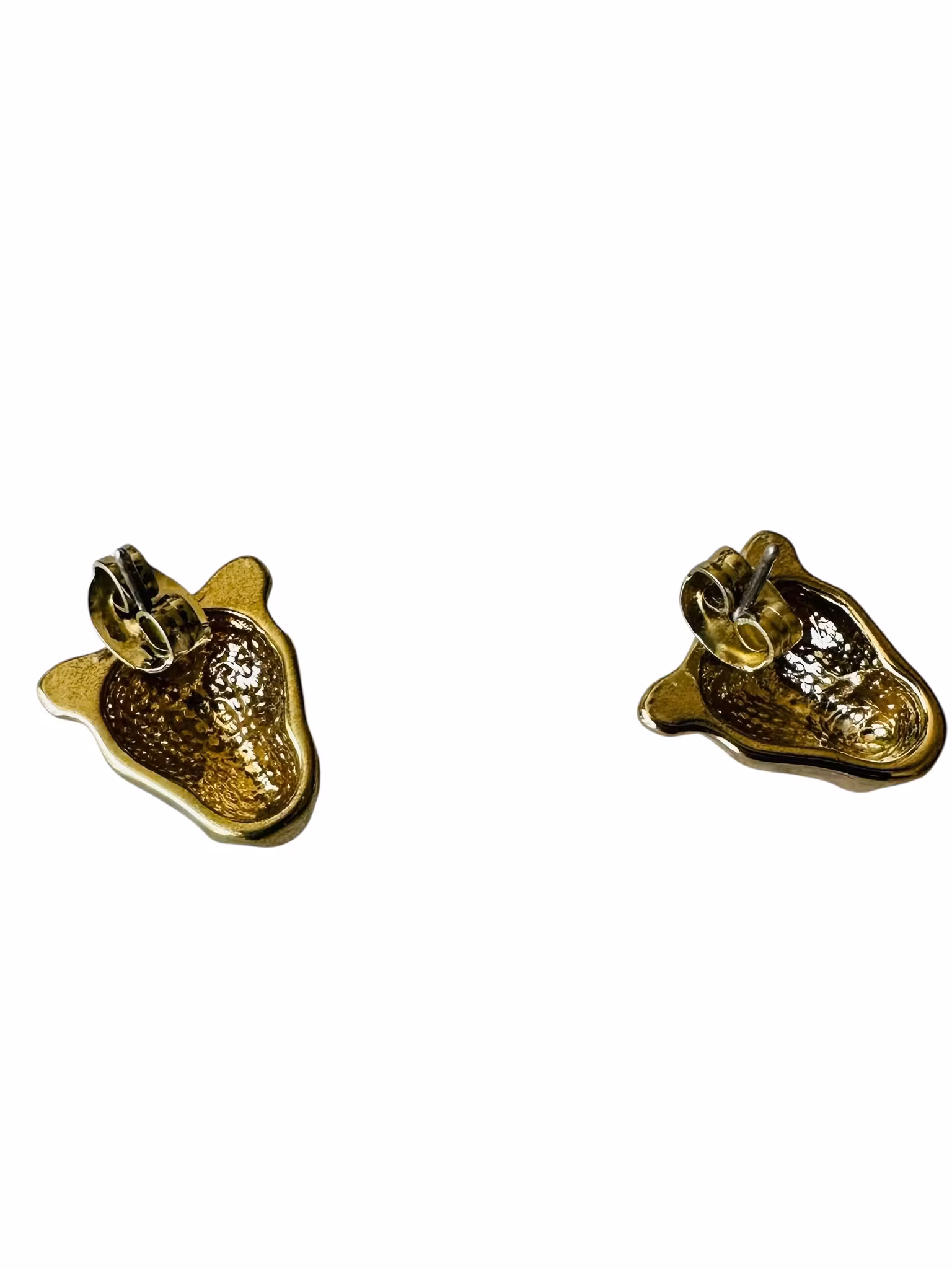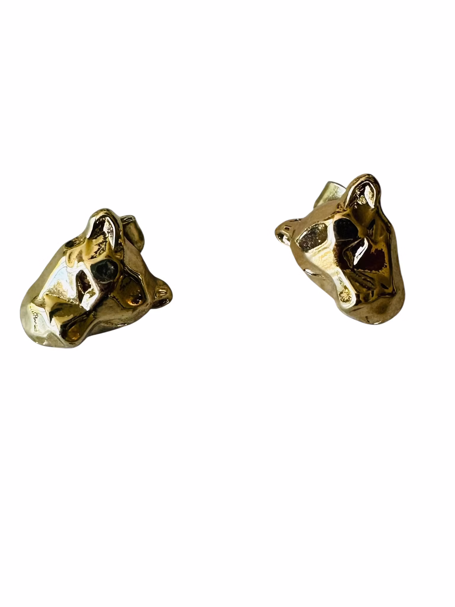Beskrivning: Små studs i guldmetall i form av kattdjurshuvuden, jag tänker panter!