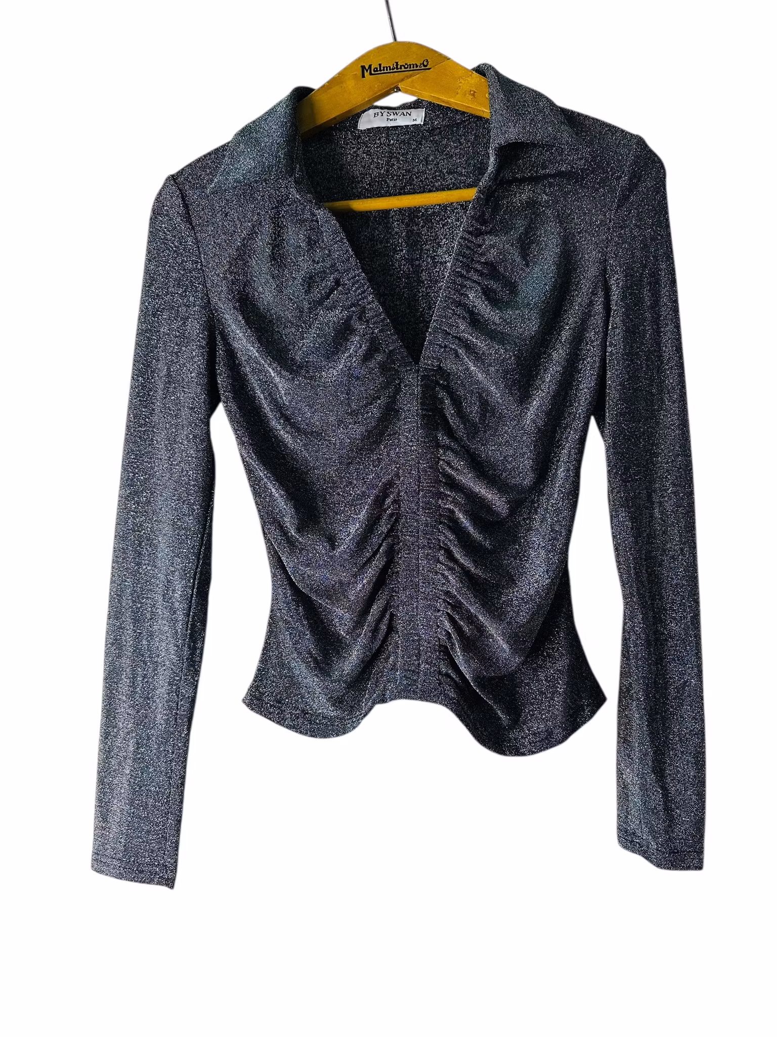Beskrivning: Så fin topp i all sin enkelhet. Stretchig och tajt med elastisk tråd framtill vilket skapar en ryscheffekt. Krage och v-ringning. Från By Swan".