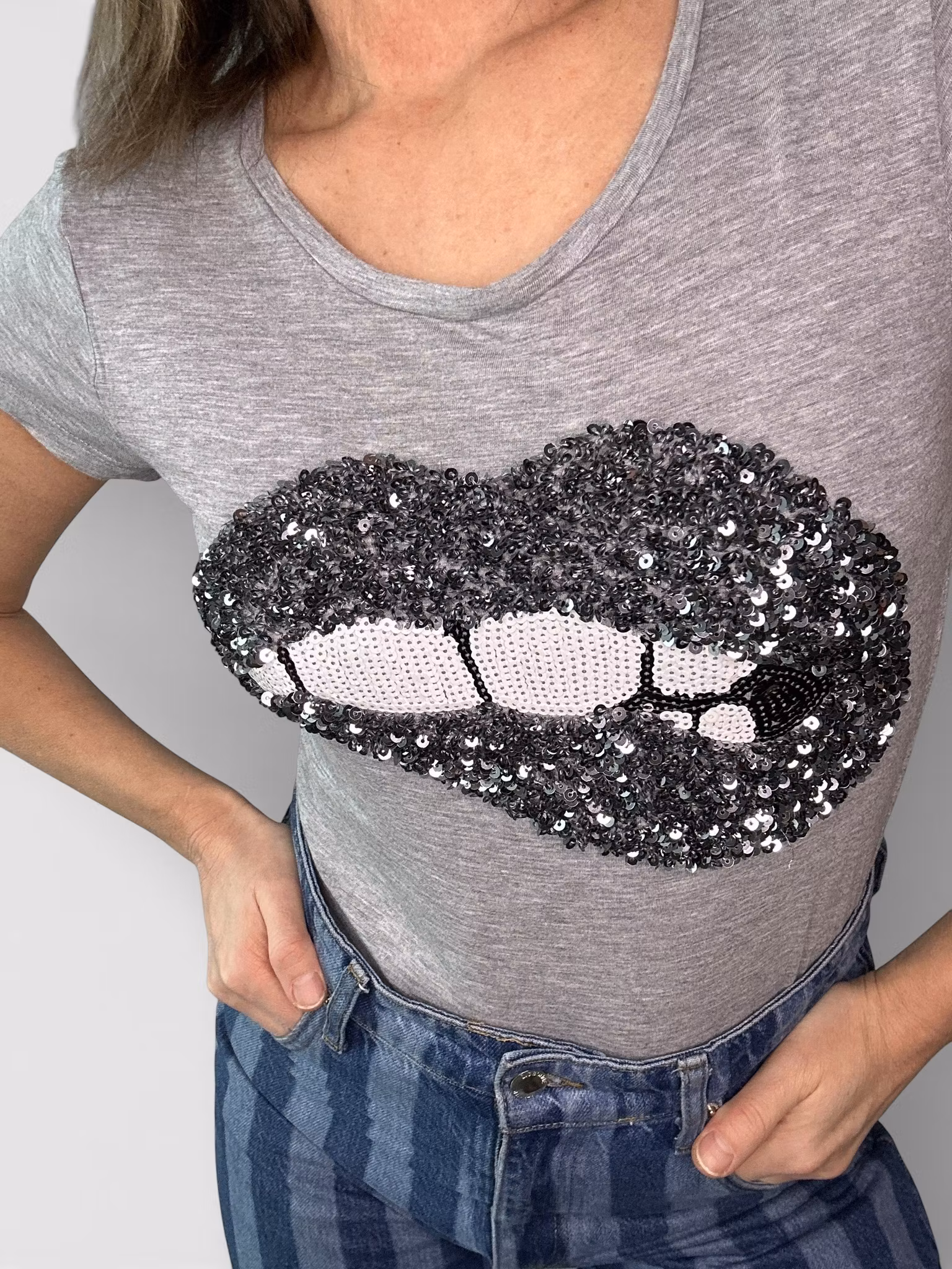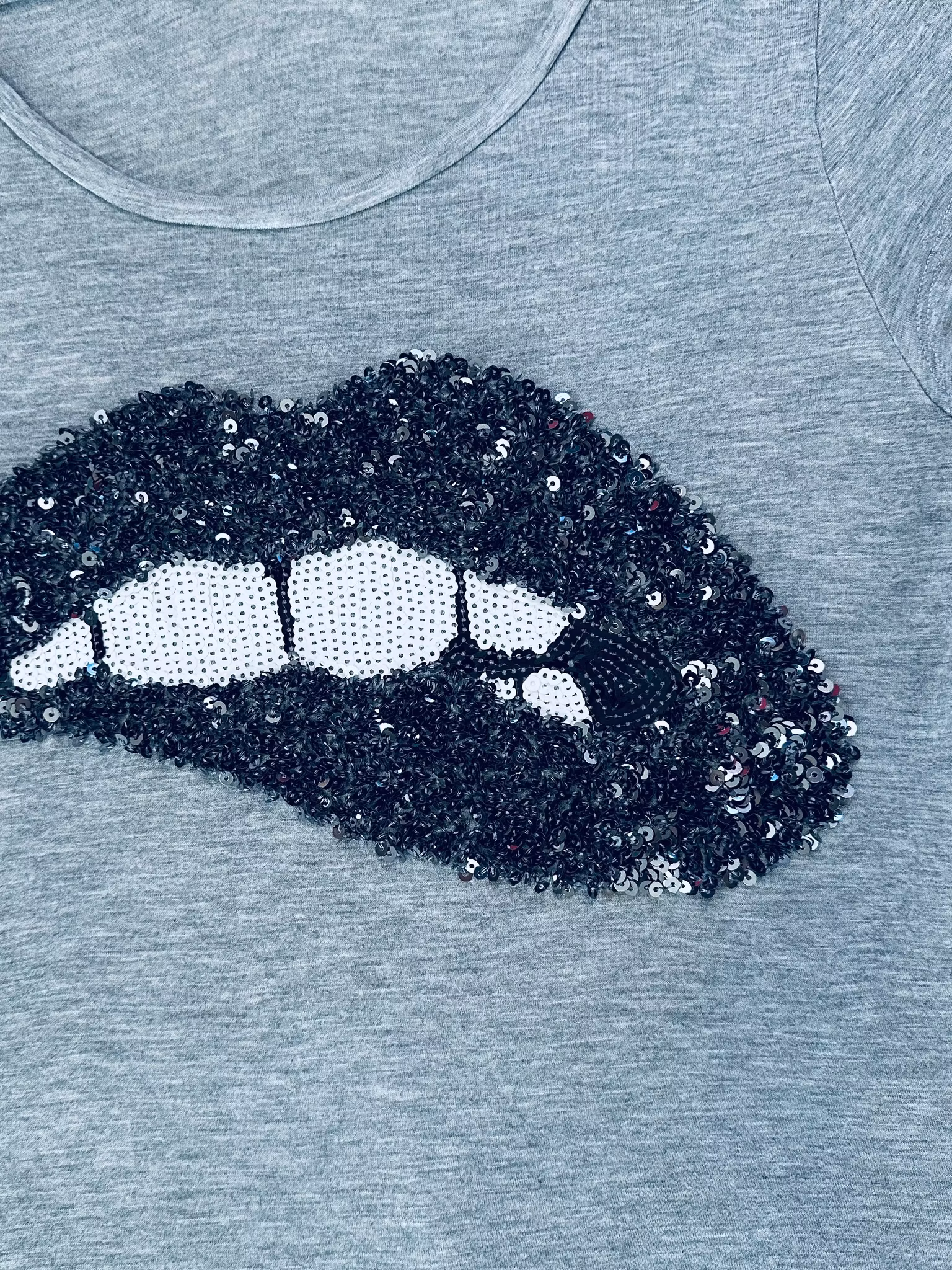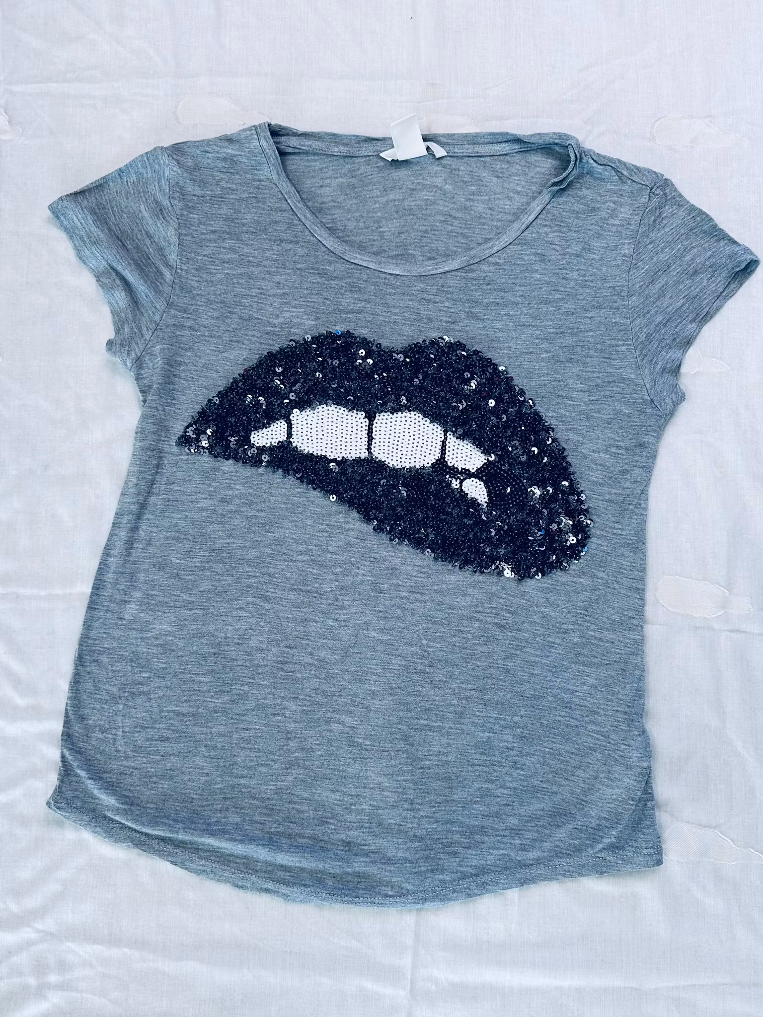 Beskrivning: Grå t-shirt i viskos med en mun av paljetter på framsidan. Från HM.