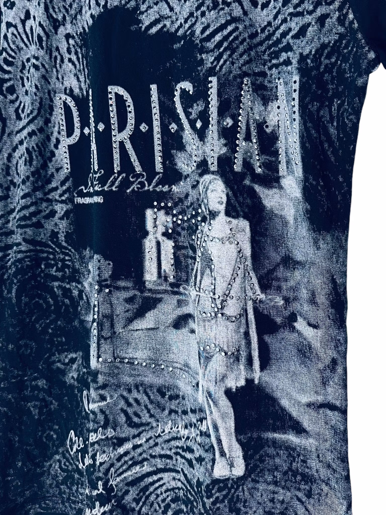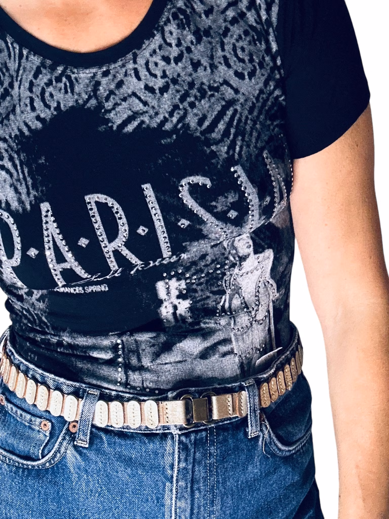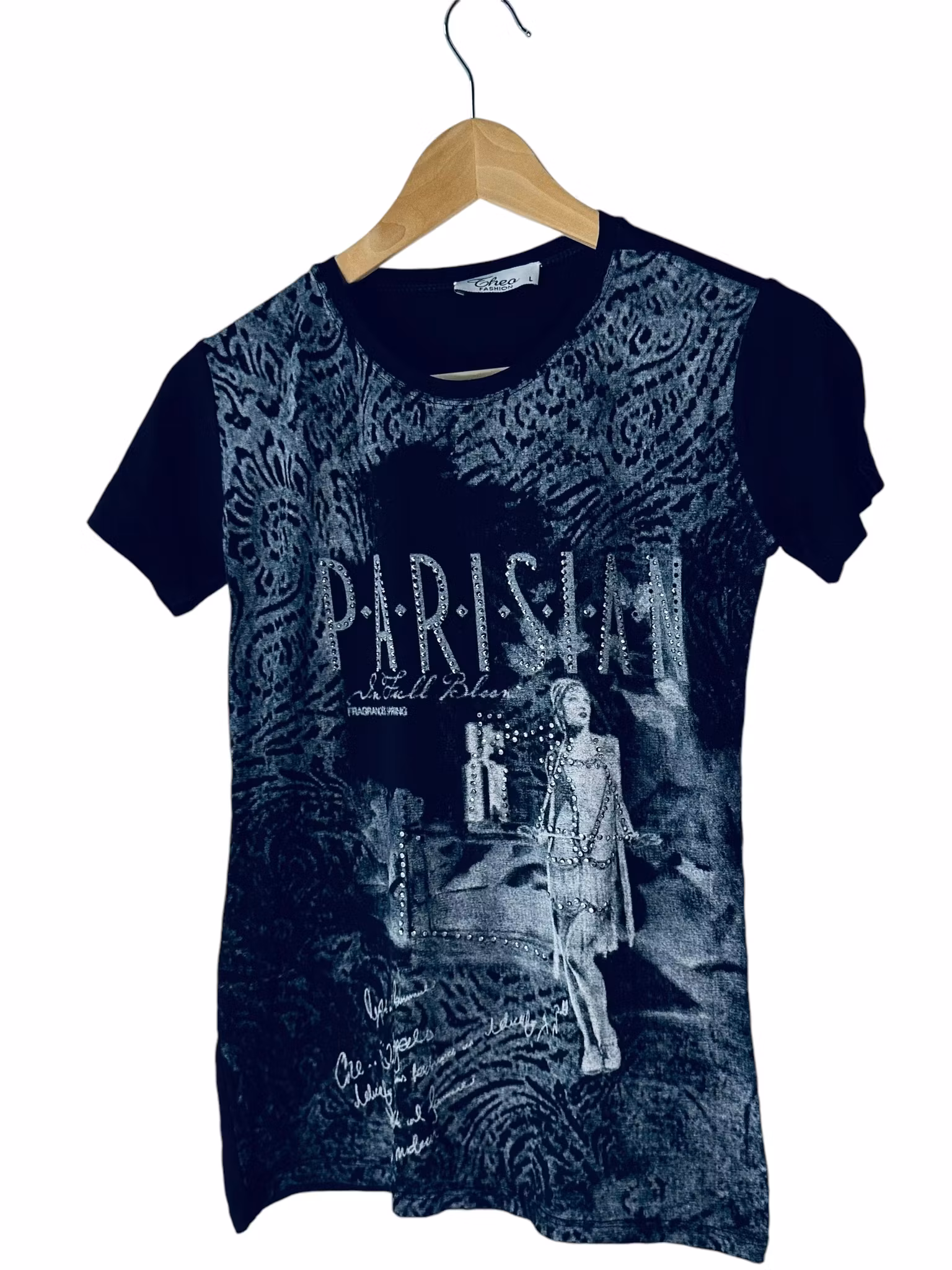 Beskrivning: T-shirt i svart med mönster i grått och strass och texten "Parisian" . Från Thea Fashion.