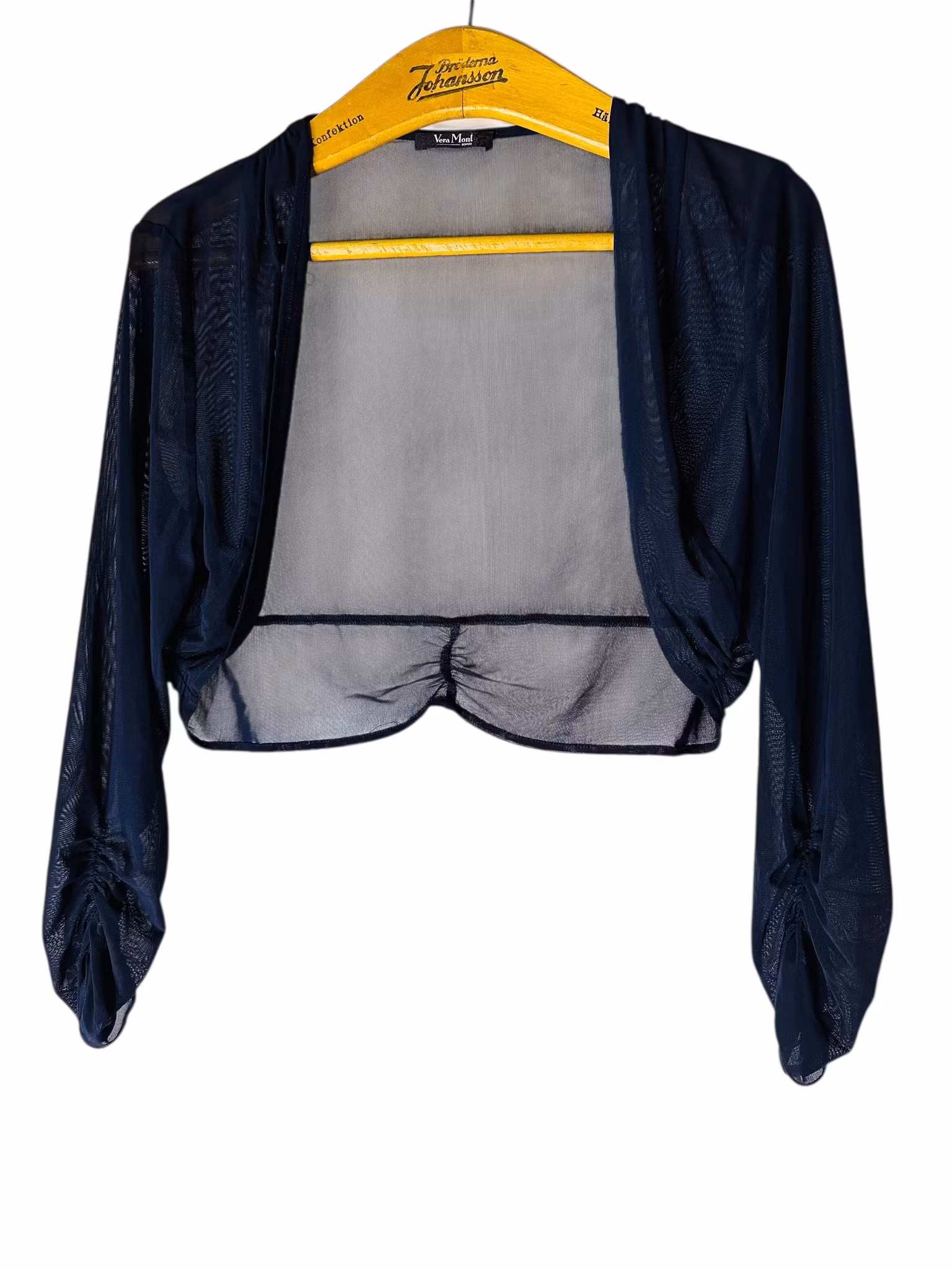 Beskrivning: Bolerojacka i tunt, halvtransparent, stretchigt marinblått material. Liten ryschdetalj i slutet av ärmarna samt baktill. Från Vera Mont Soirée.