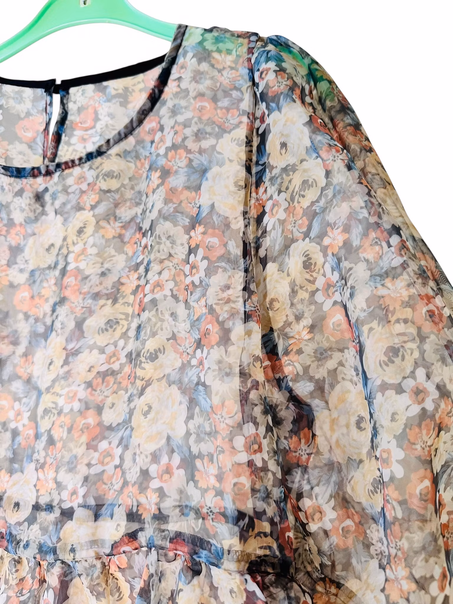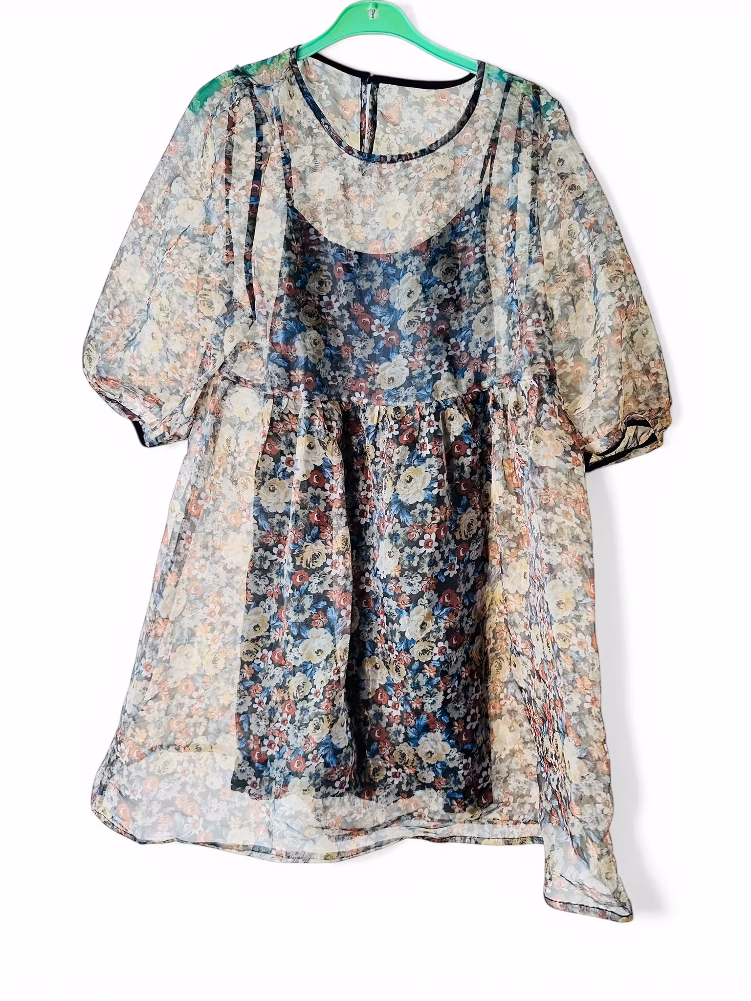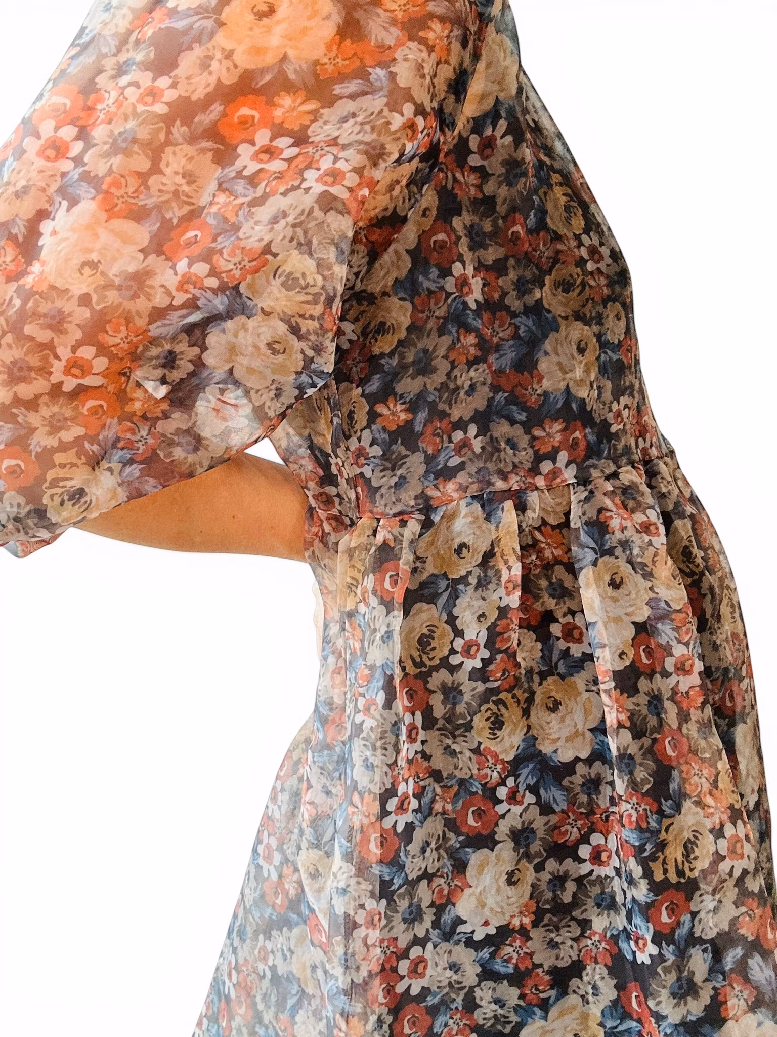 Beskrivning: Söt klänning i transparent blommigt tyg från danska Liberté Essentiel. Puffig modell med ballongärm. Fin att bära över t ex jeans - kanske med en mesh under och en kavaj över för riktig lager-på-lager-känsla.