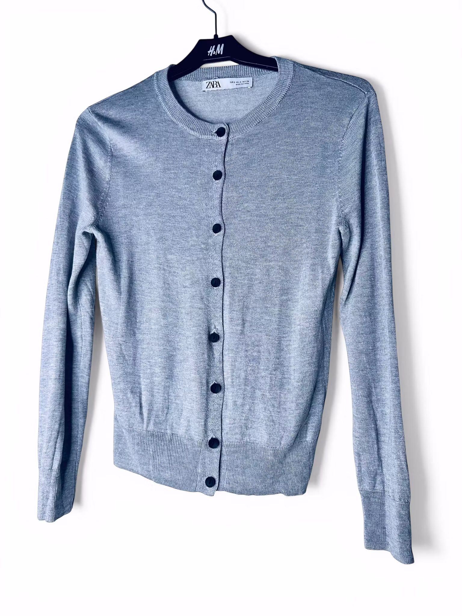 Beskrivning: En tunn kofta i finstickad kvalitet från Zara. Den ljusgrå färgen och de kontrasterande mörka knapparna ger ett stilrent och minimalistiskt uttryck. Modellen är figurnära, rundhalsad och knapparna fiffigt gummerade för att inte slinka ur materialet som är lite svalt och halkigt i lyocell och siden. Nypris ca 650kr.
