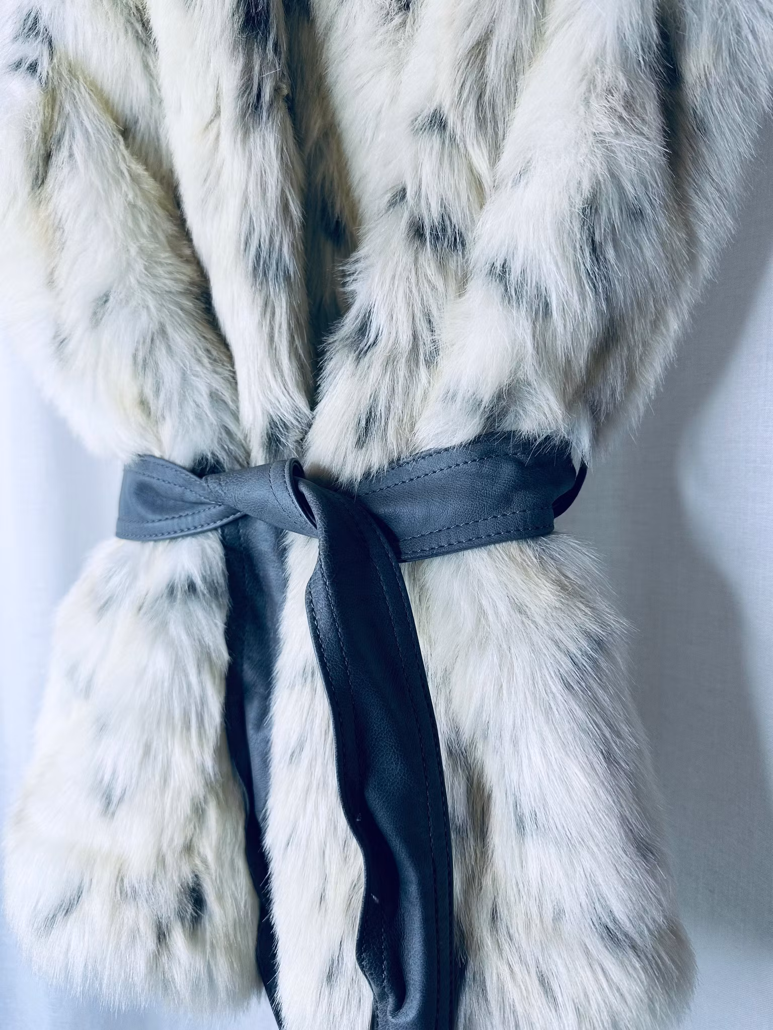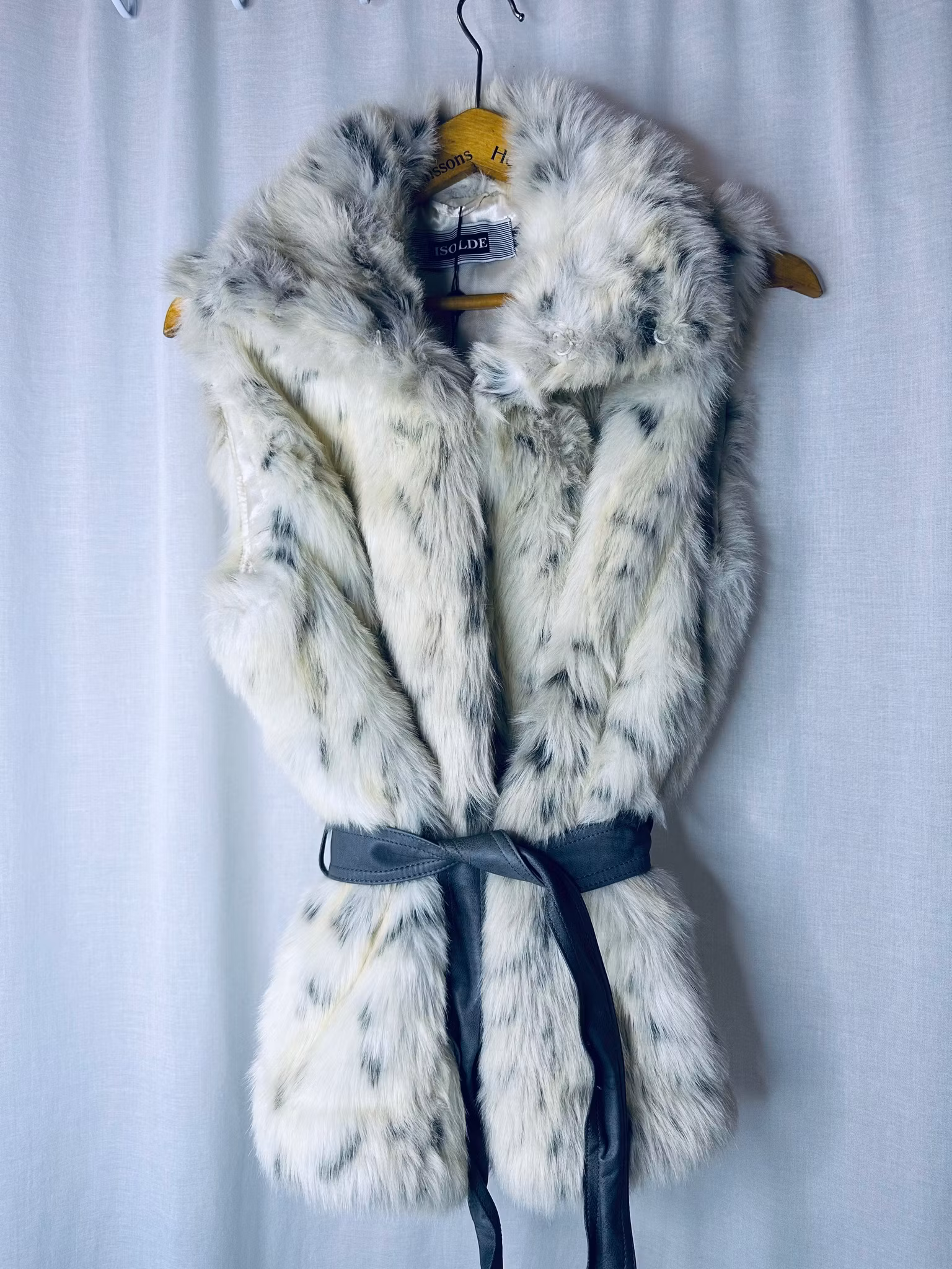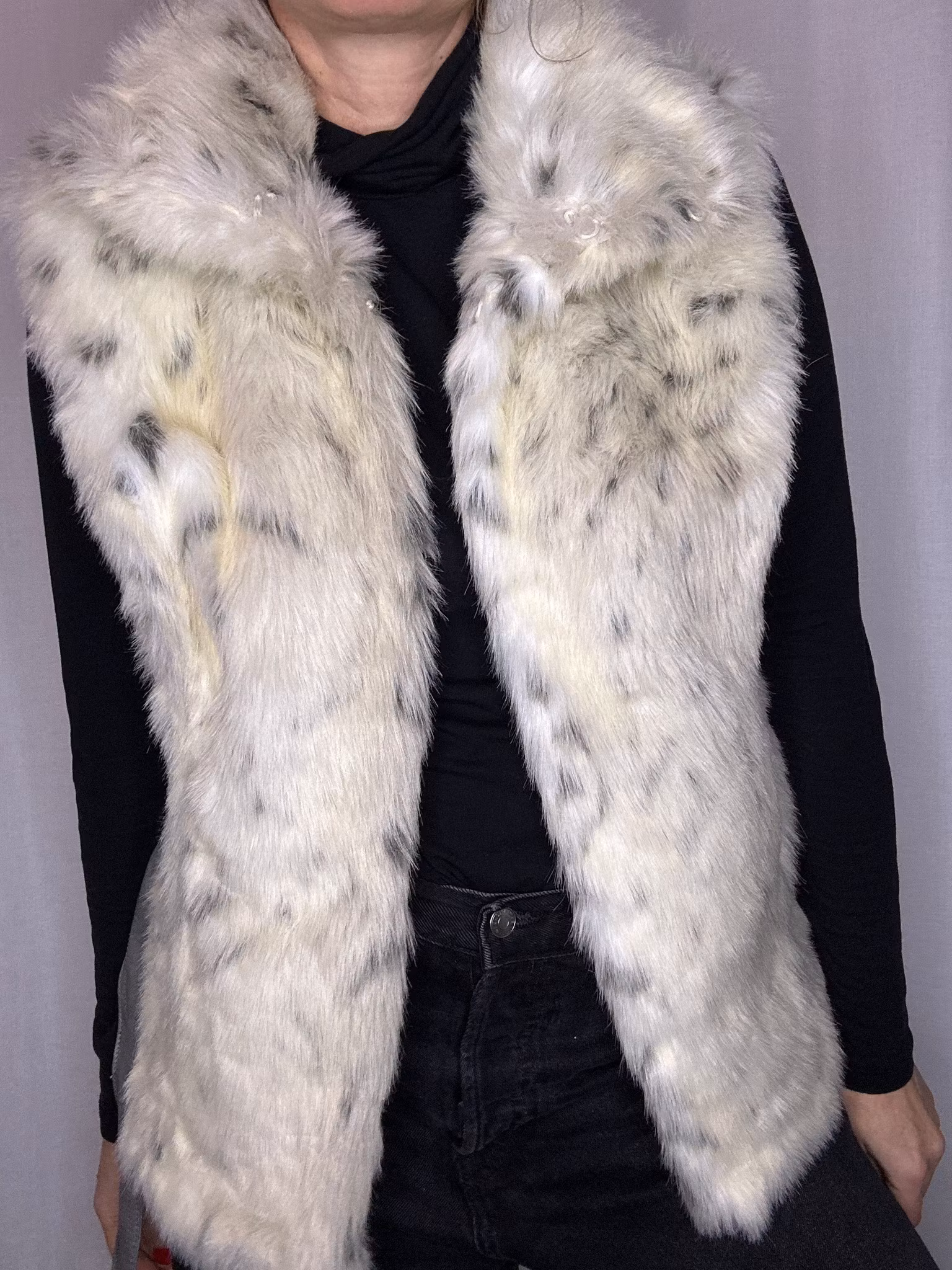 Beskrivning: Så mjuk och gosig väst i fuskpäls som är helt oanvänd med lapparna kvar. Från Isolde i snöleopardmönster. Cremefärgat, blankt foder och ett grått skärp i fuskskinn i midjan. Stängs med hyskor och har en hög krage som kan knäppas hela vägen upp.