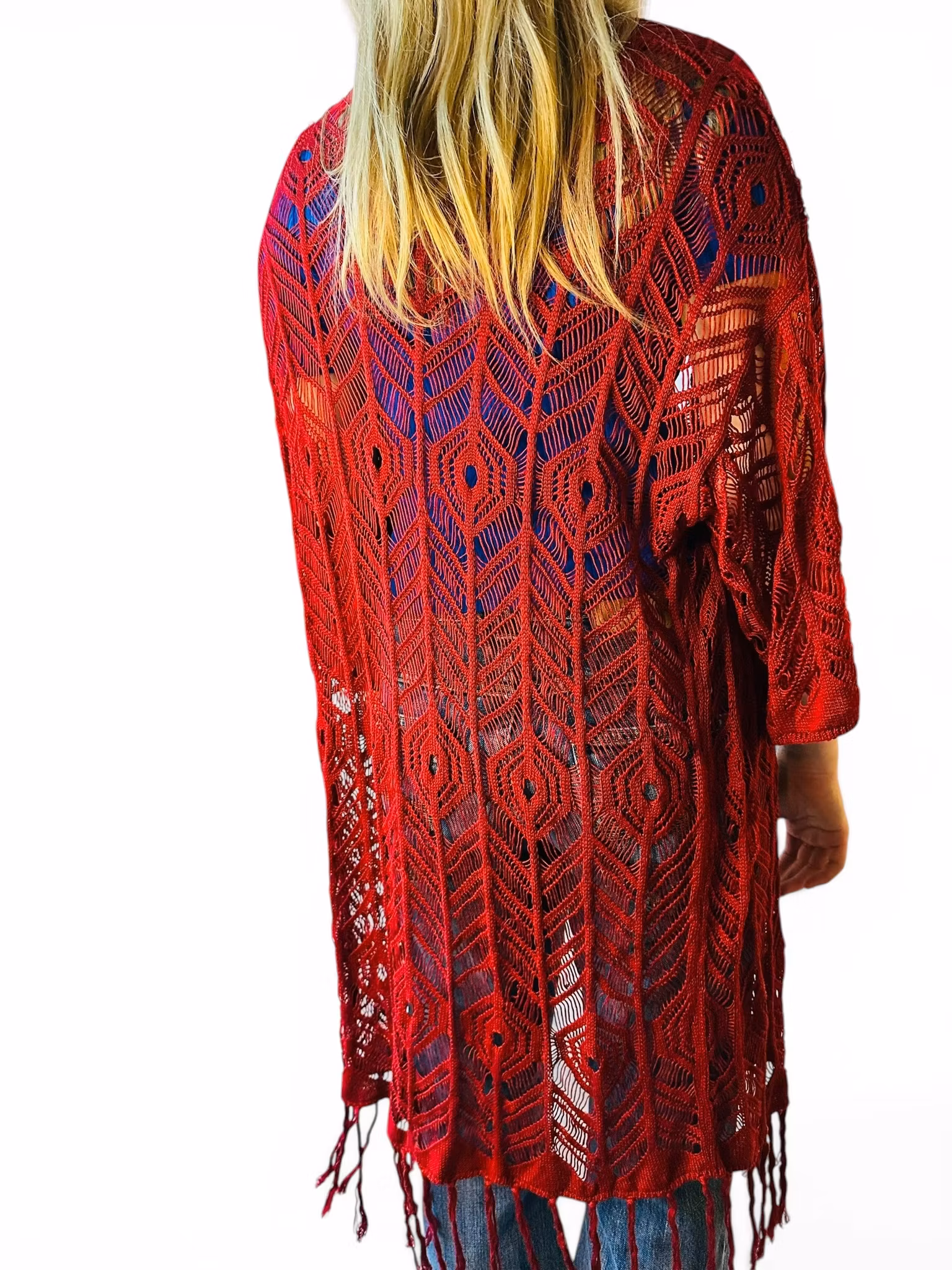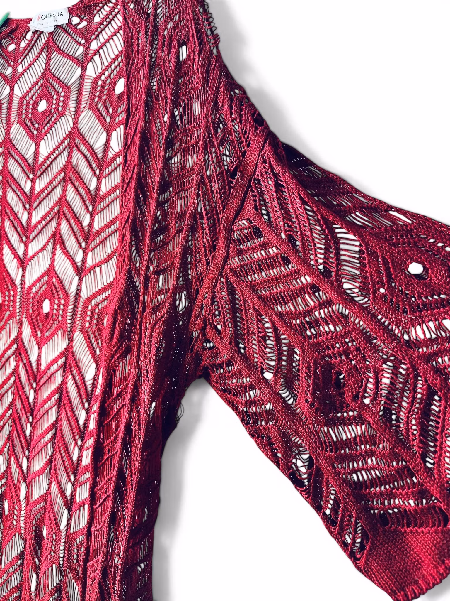 Beskrivning: En virkad kaftan från HM Coachella i vinrött garn. Glest virkat med fransar längst ner.