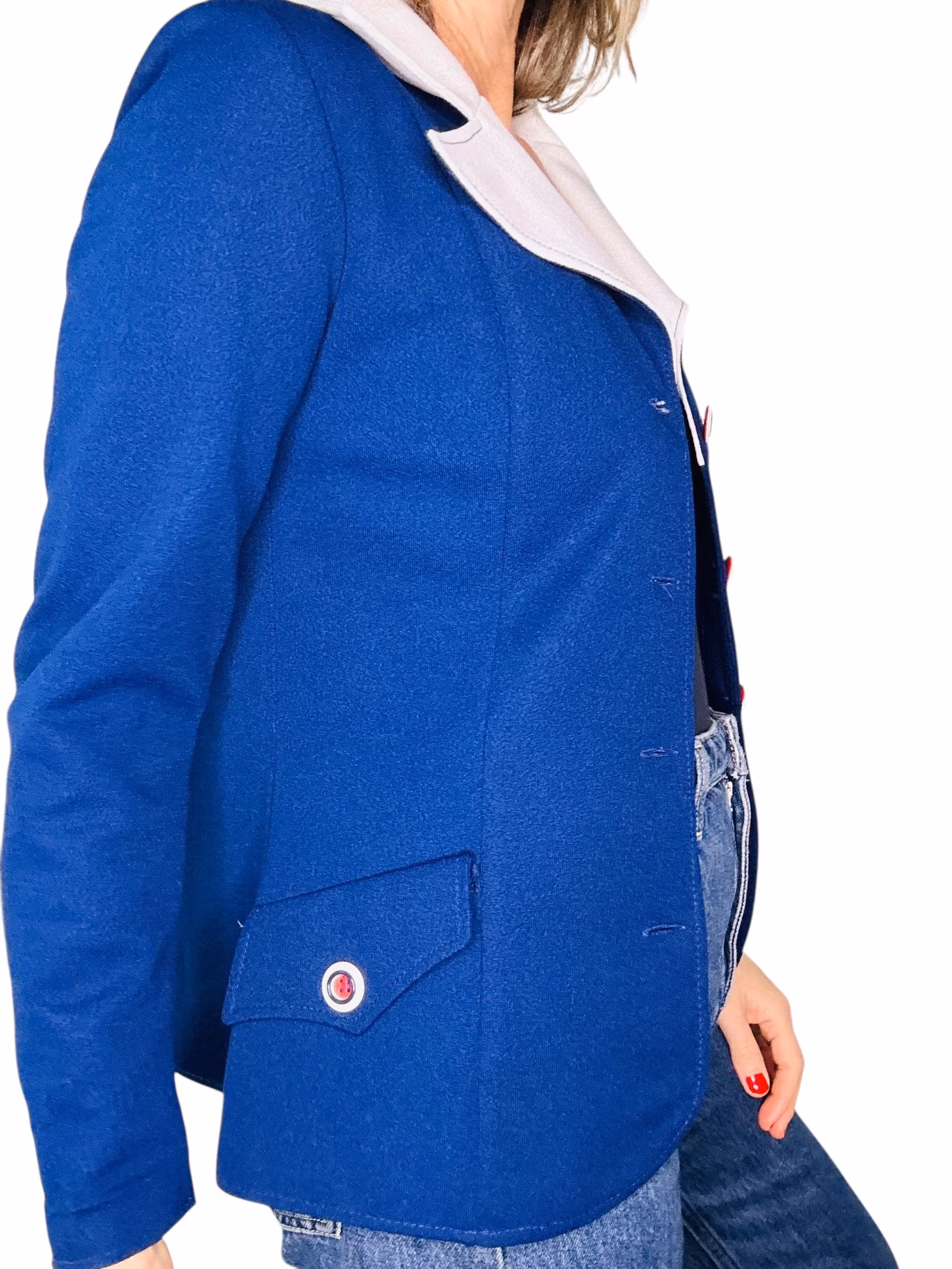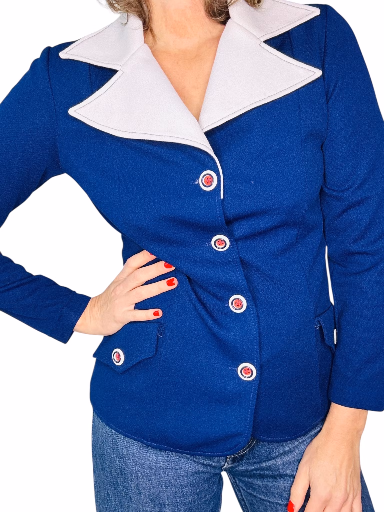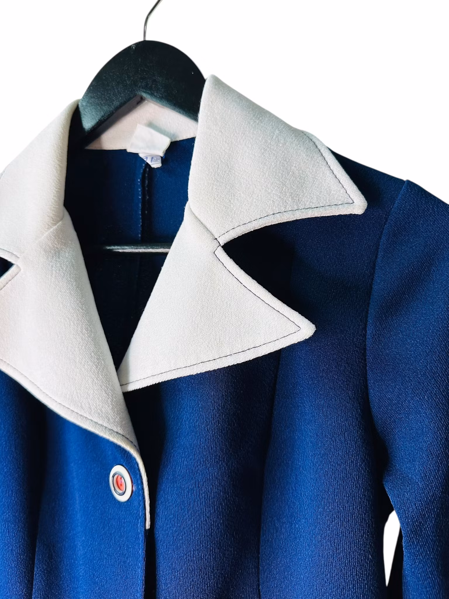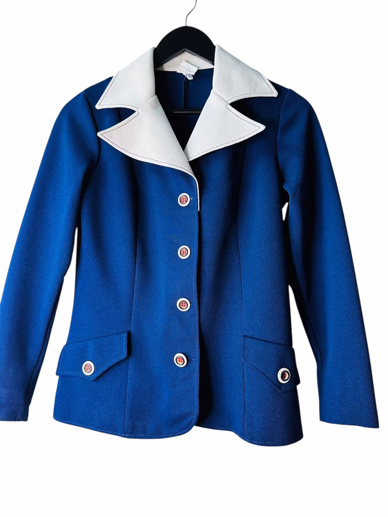 Beskrivning: Vintage kavaj från svenska Petri. Mörkblå och figursydd med vita, stora 70-talsslag. Knapparna är vita med blå cirkel och röd mitt - en kul detalj. Ficklock men endast dekorativa, inga fickor. Materiallapp saknas men vi uppskattar att detta är polyester.