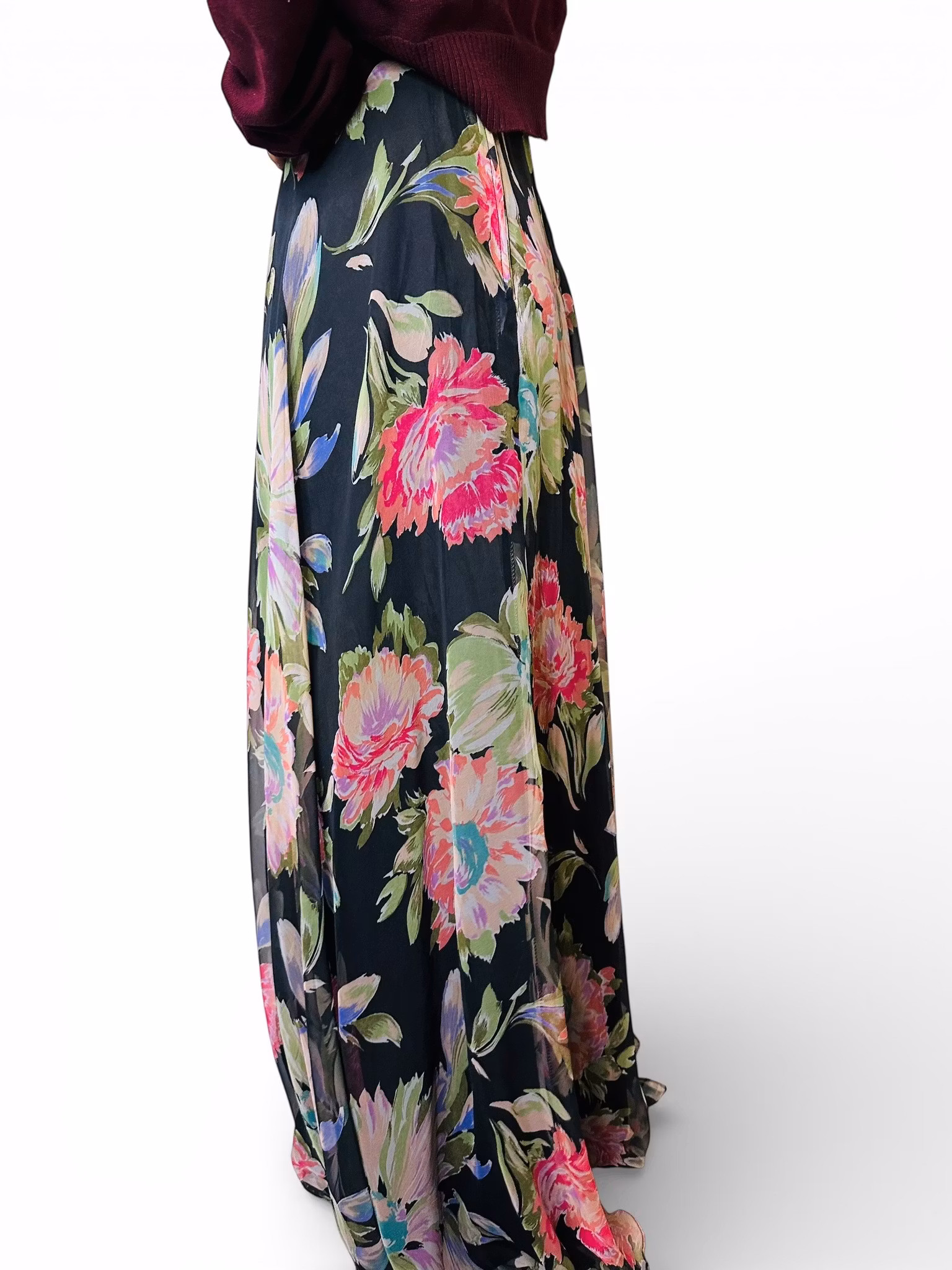 Beskrivning: En svepande maxikjol från Lucie Linden i skirt chiffongtyg med mjukt målade blommor i rosa, lavendel, mint och grönt mot svart botten. En tidlös modell med vacker rörelse och lätt transparens i yttertyget. Kjolen har hög midja, slät linning och lätt avsmalnande till en generös vidd nertill vilket ger ett elegant fall. Helfodrad.