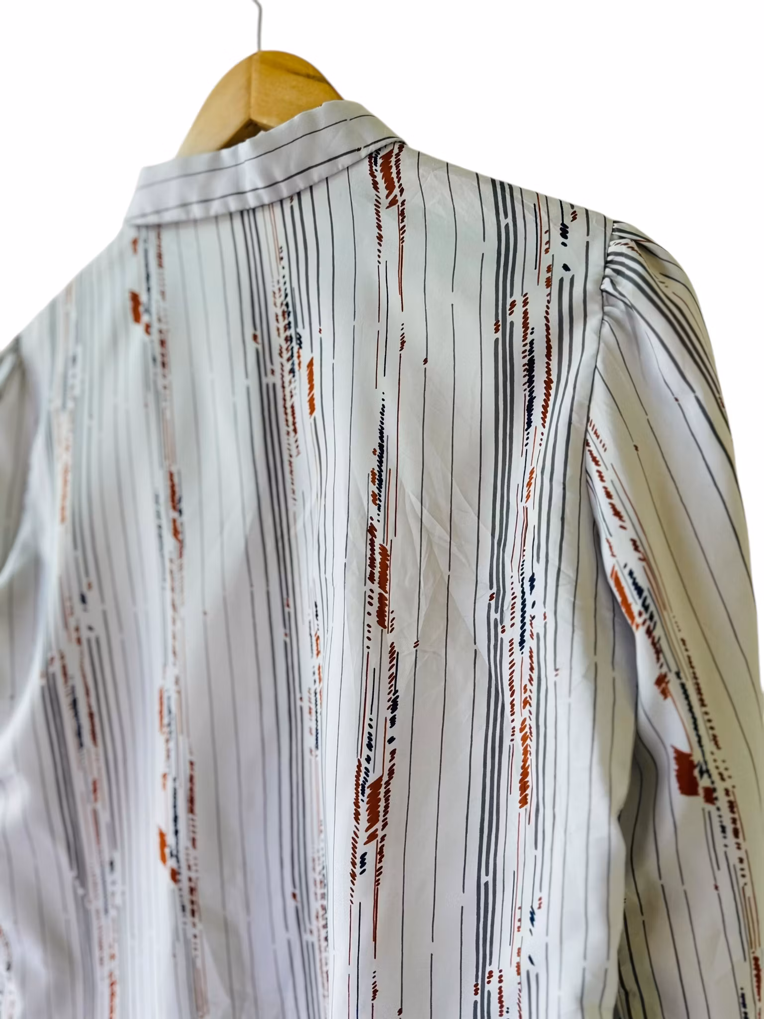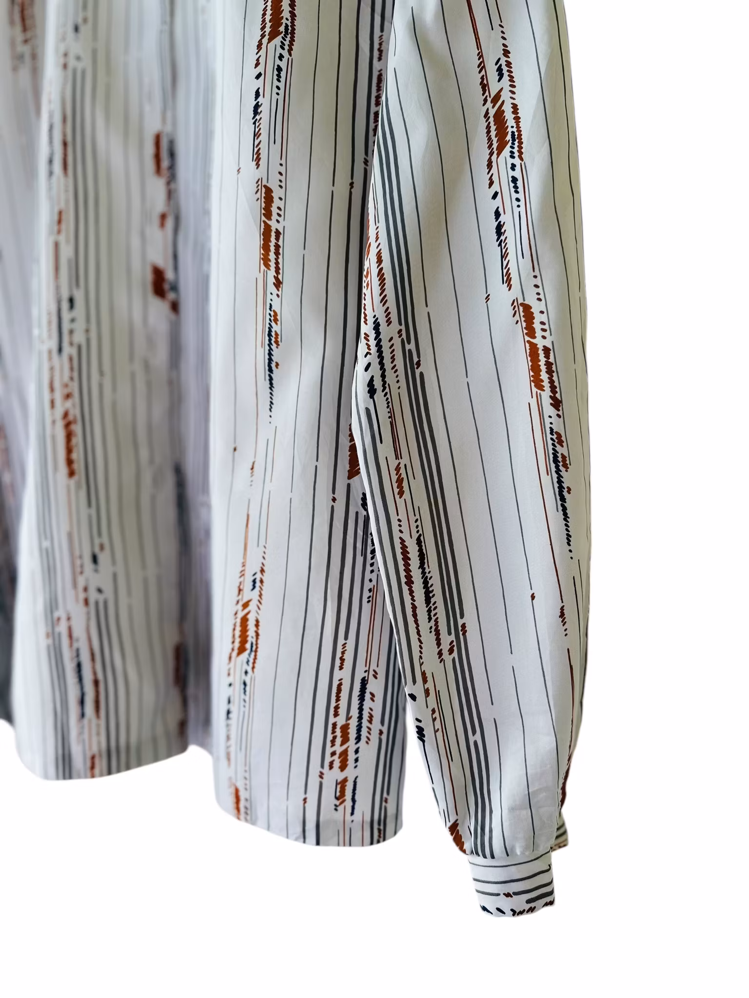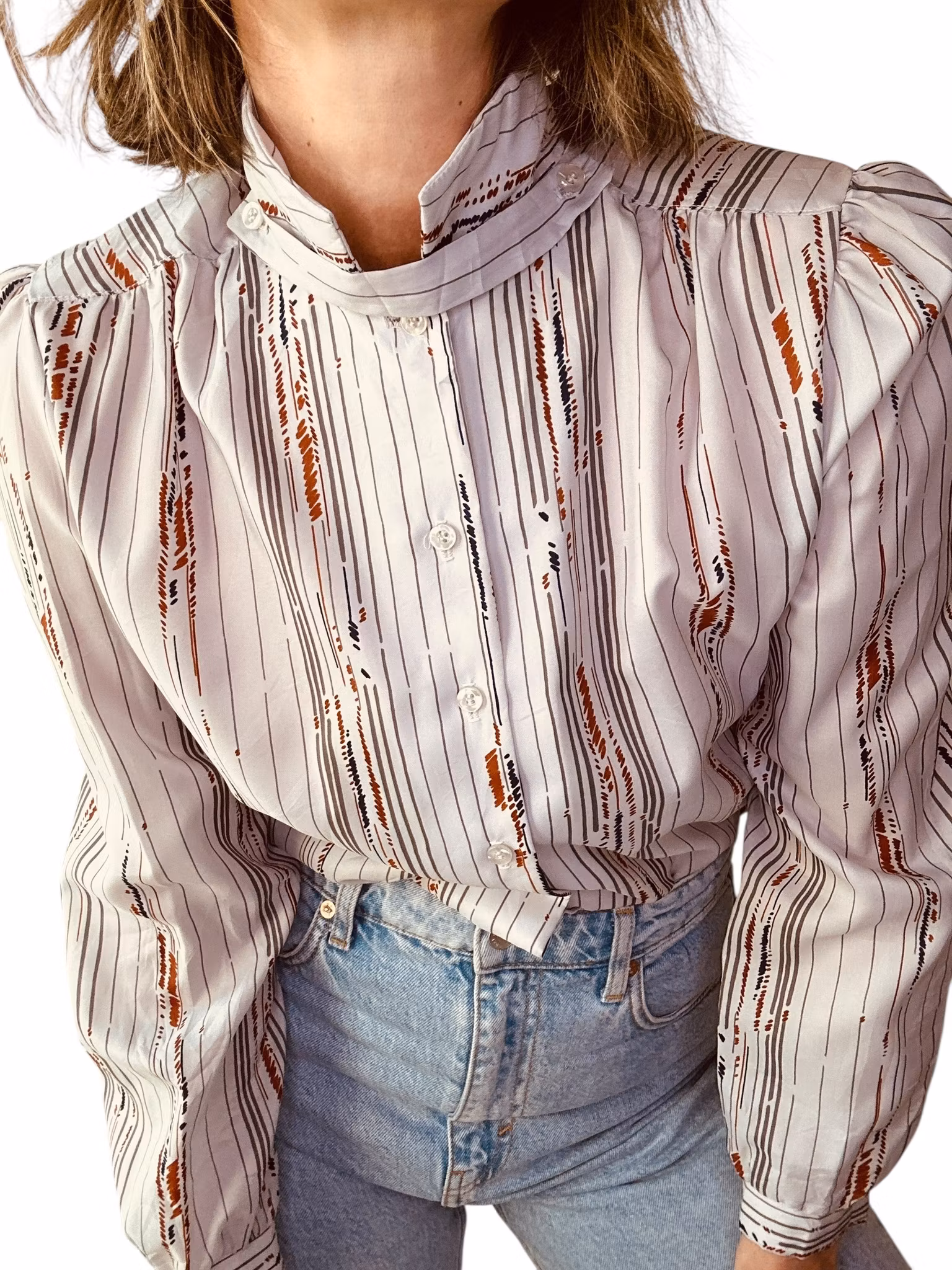 Beskrivning: Vintageblus i ljust grått med mönster. Lätt puffig axel, nätt krage och en liten slejf en kan knäppa under kragen och antingen vika den över eller ha ståkrage. Material saknas, men uppskattas vara polyester.