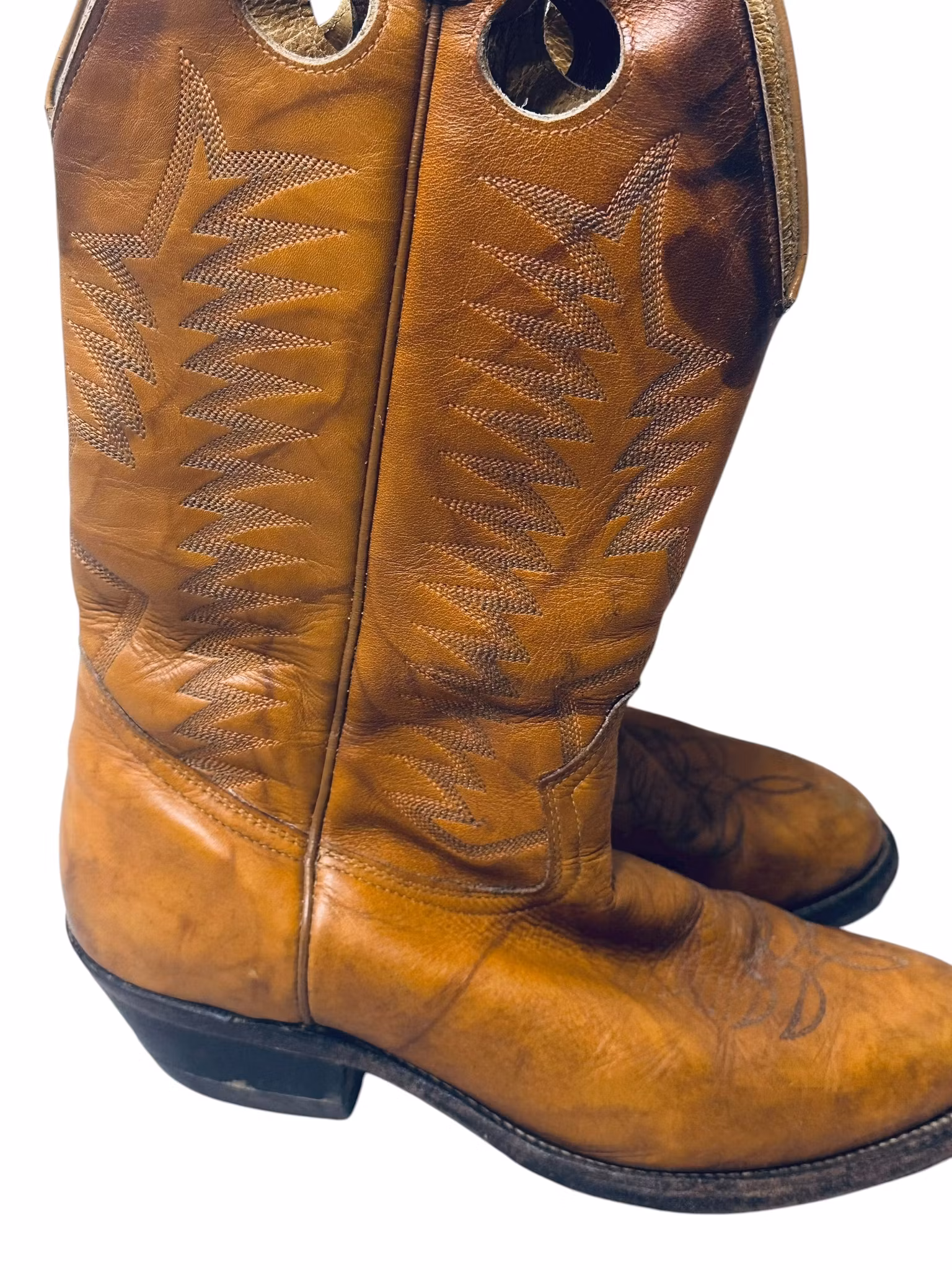 Beskrivning: Vintage cowboyboots med fin patina. Konjaksbrunt läder med skiftningar. Lädersula och låg klack. Roliga cirkelformade hål i skaften för att lättare dra på sig stövlarna.