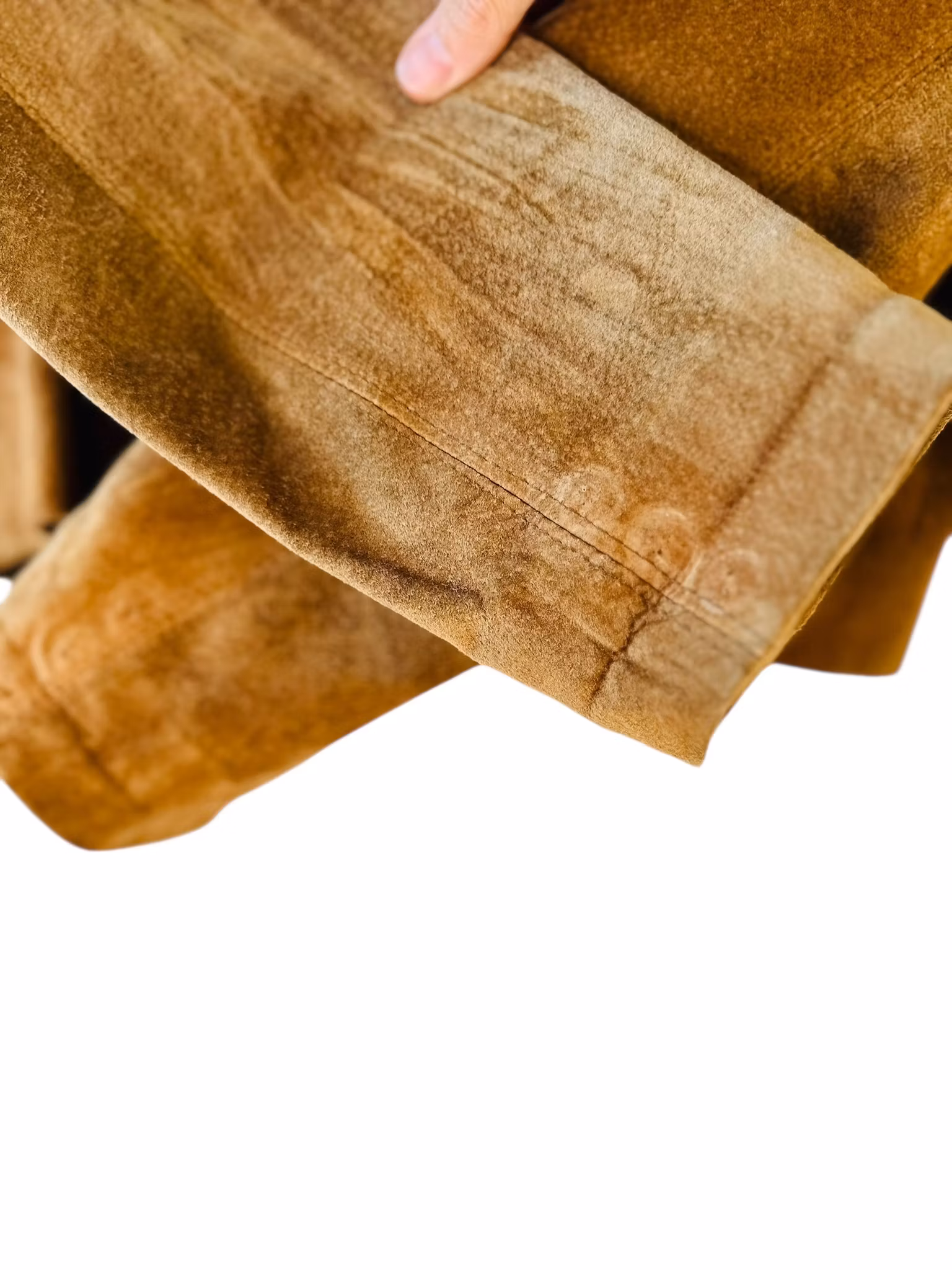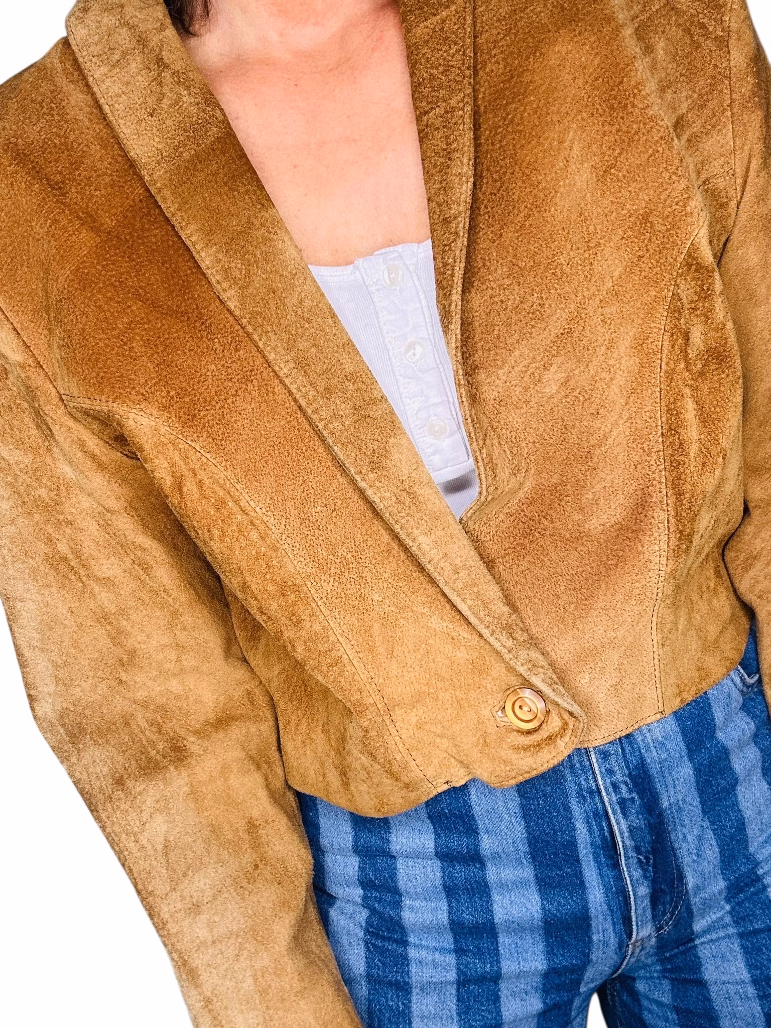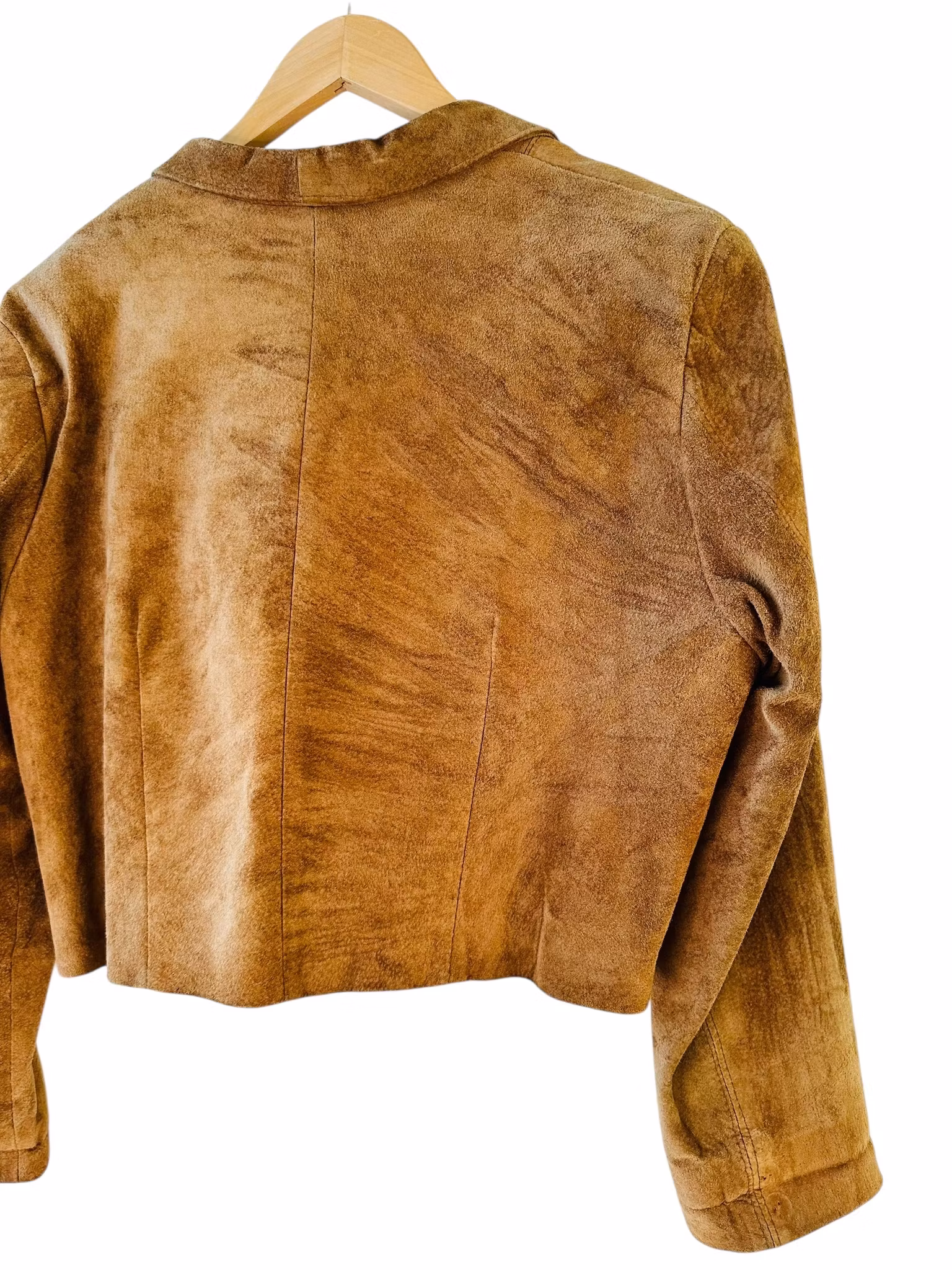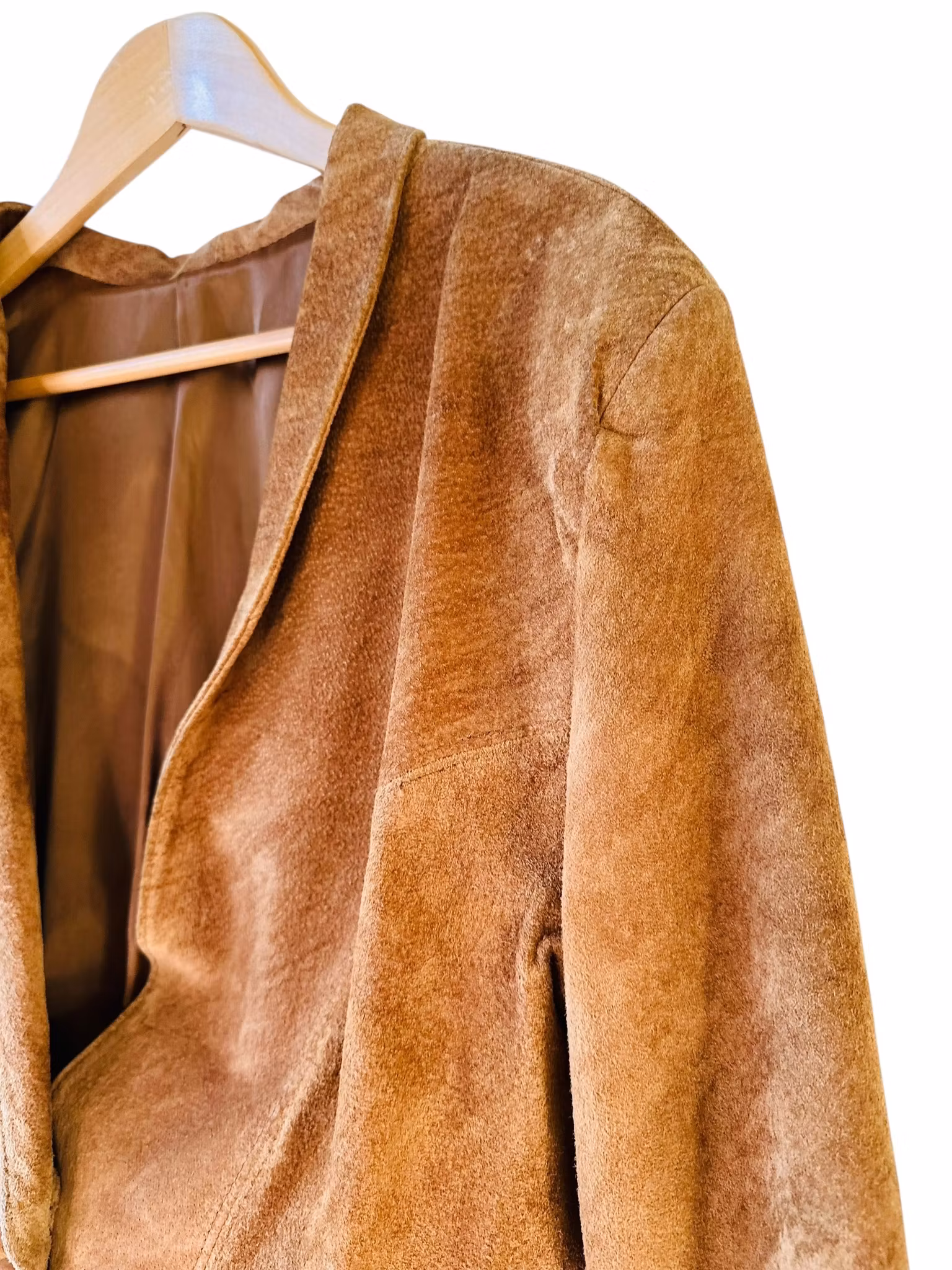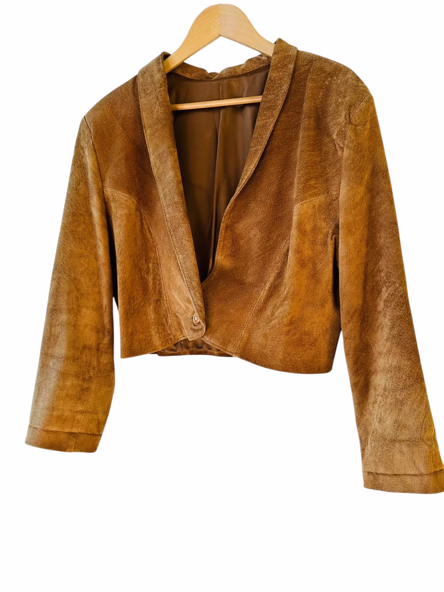 Beskrivning: En vintage mockajacka i perfekt brun nyans. Stängs med en knapp och är helfodrad. Det har funnits knappar i ärmsluten också, men dessa saknas. De fyllde dock ingen funktion för där finns inga knapphål så endast dekorativt, se sista bilden.