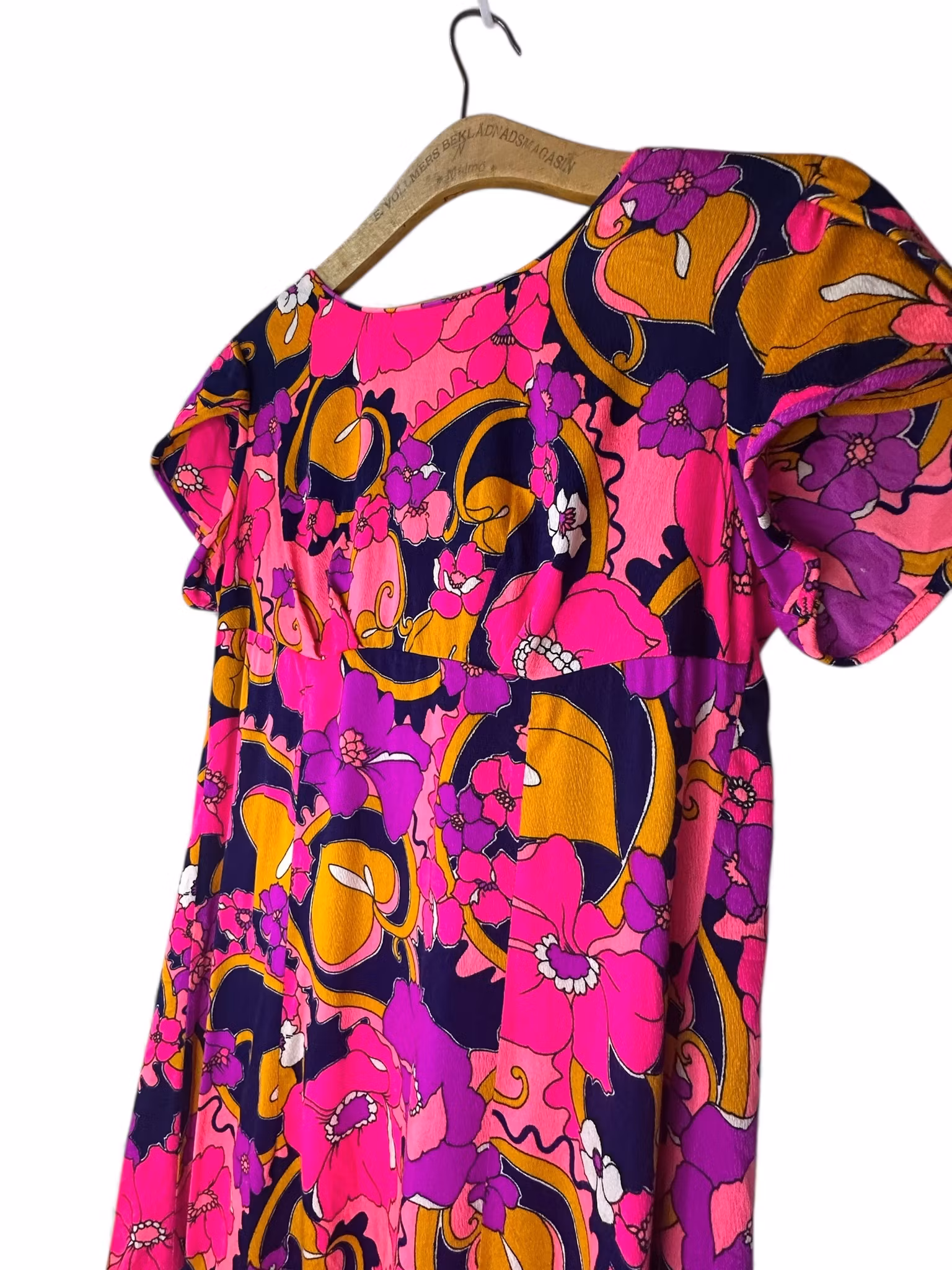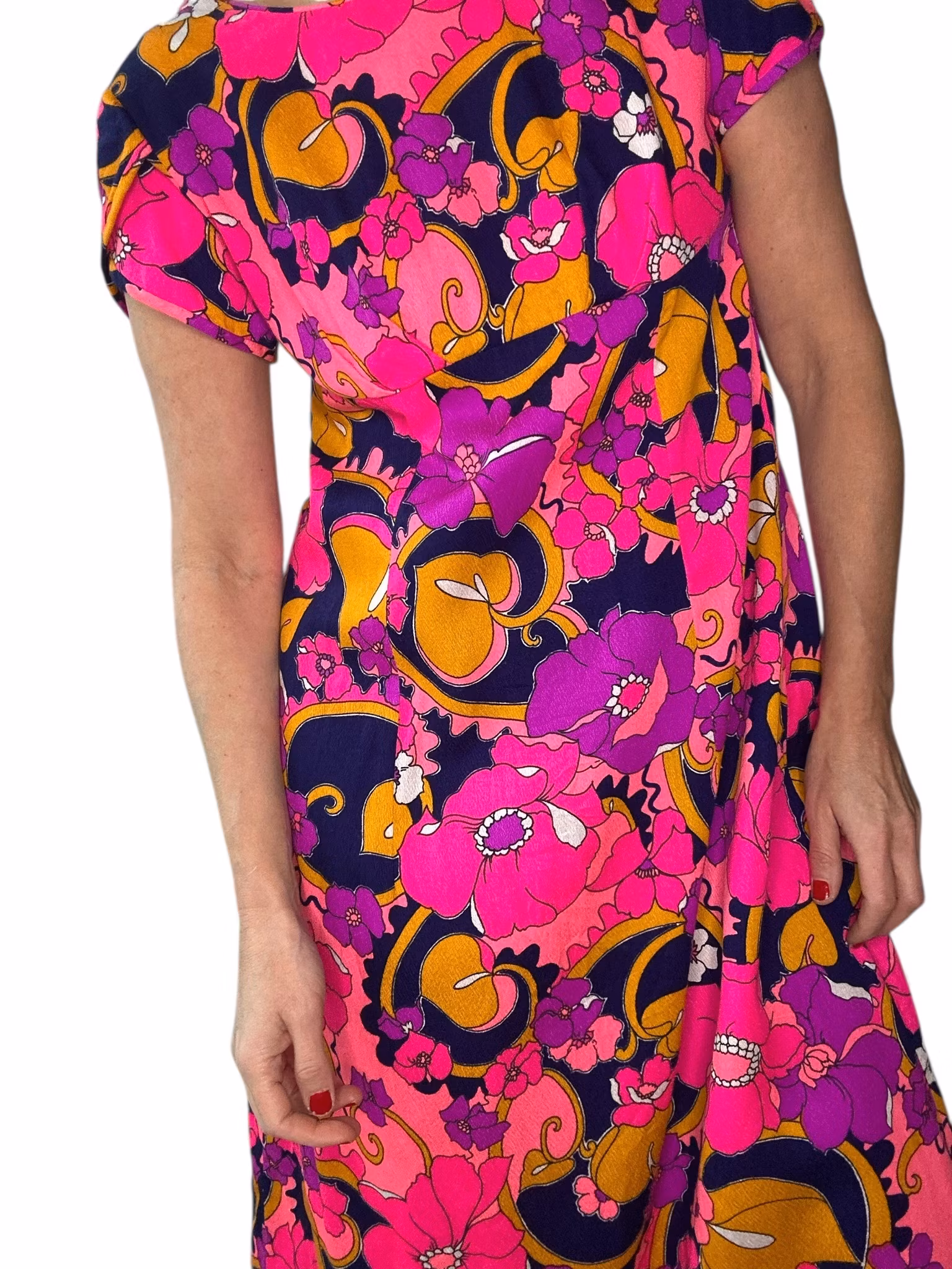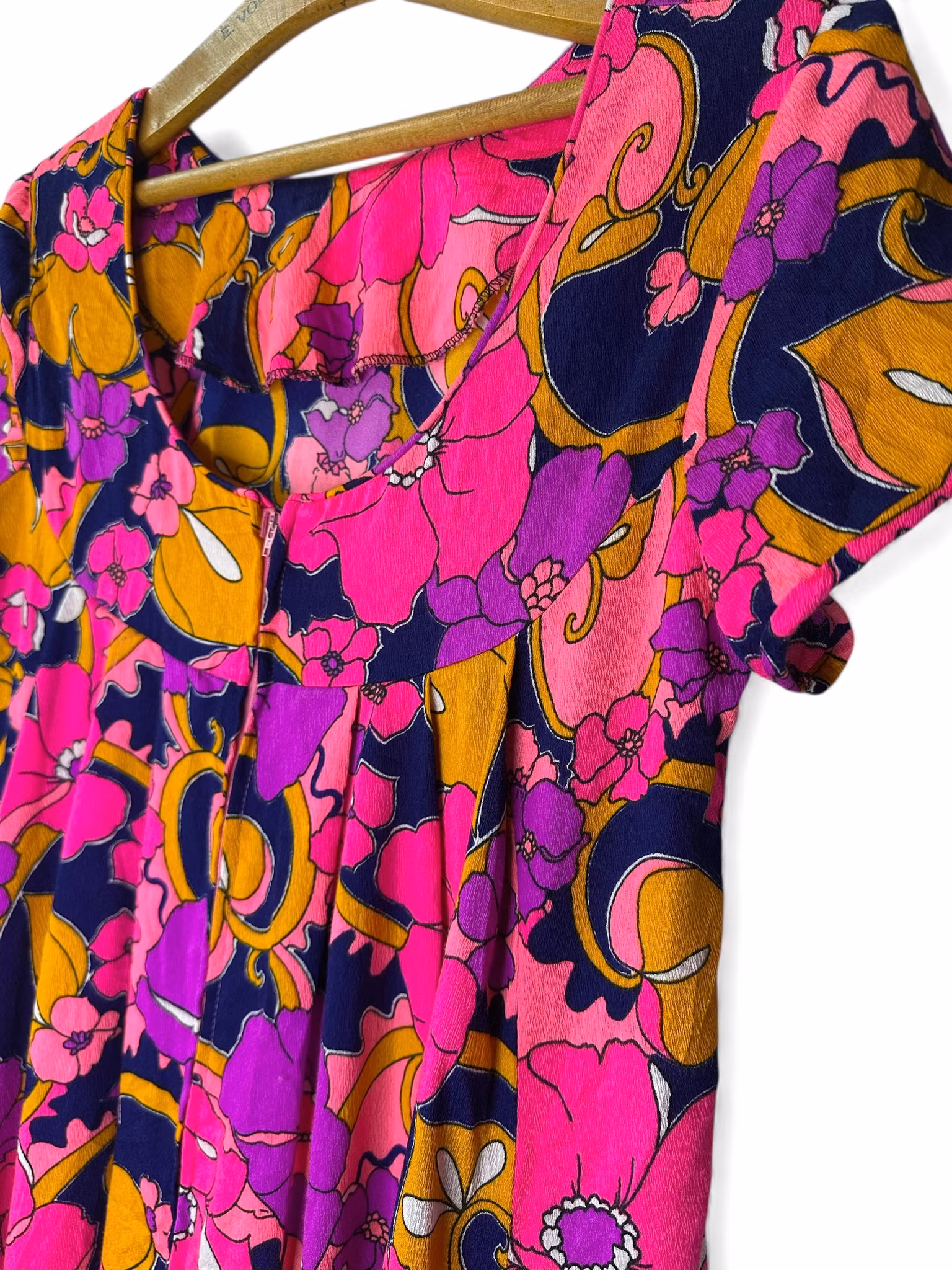 Beskrivning: Vintage klänning i otroligt färgglatt material. Blommor i rosa, orange och lila och en härlig form där det är prinsesskärning framtill och djup rygg med dragkedja och rejält veckad baksida som ger kul volym.