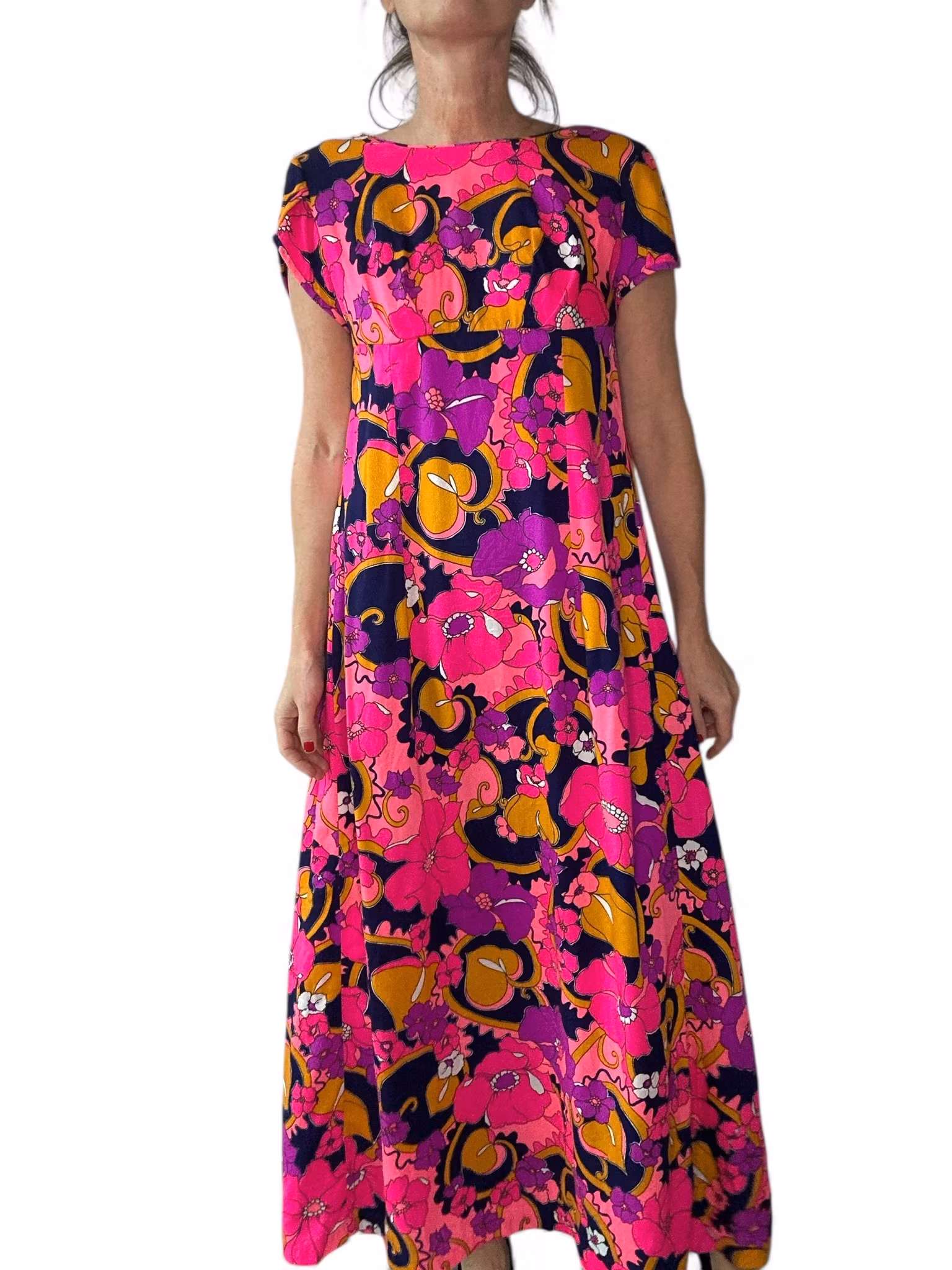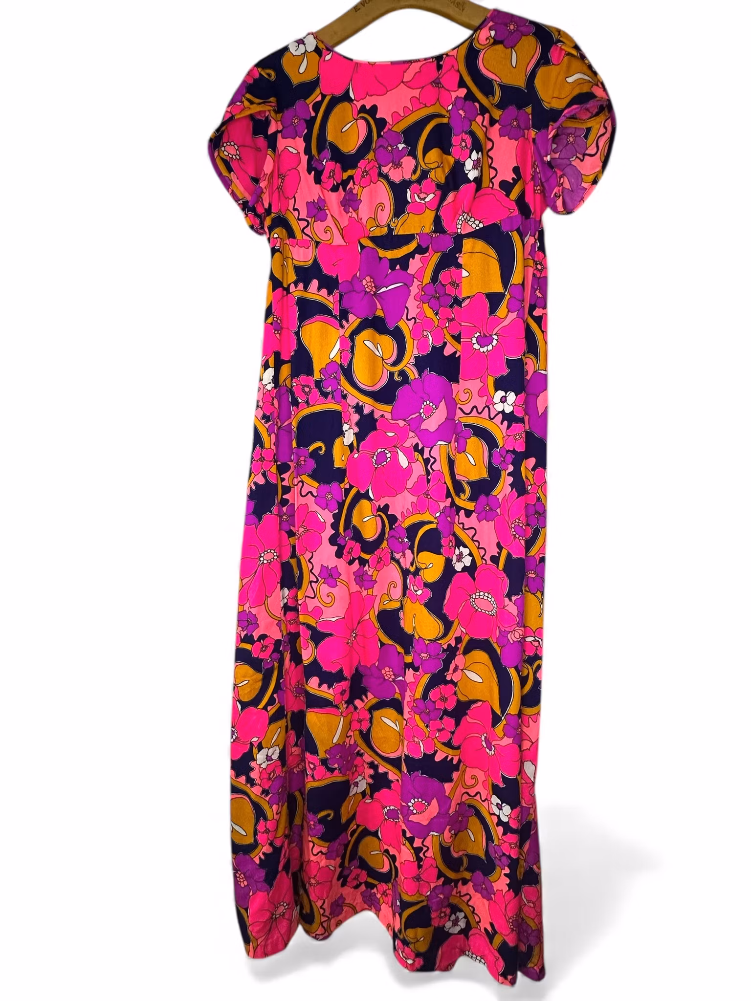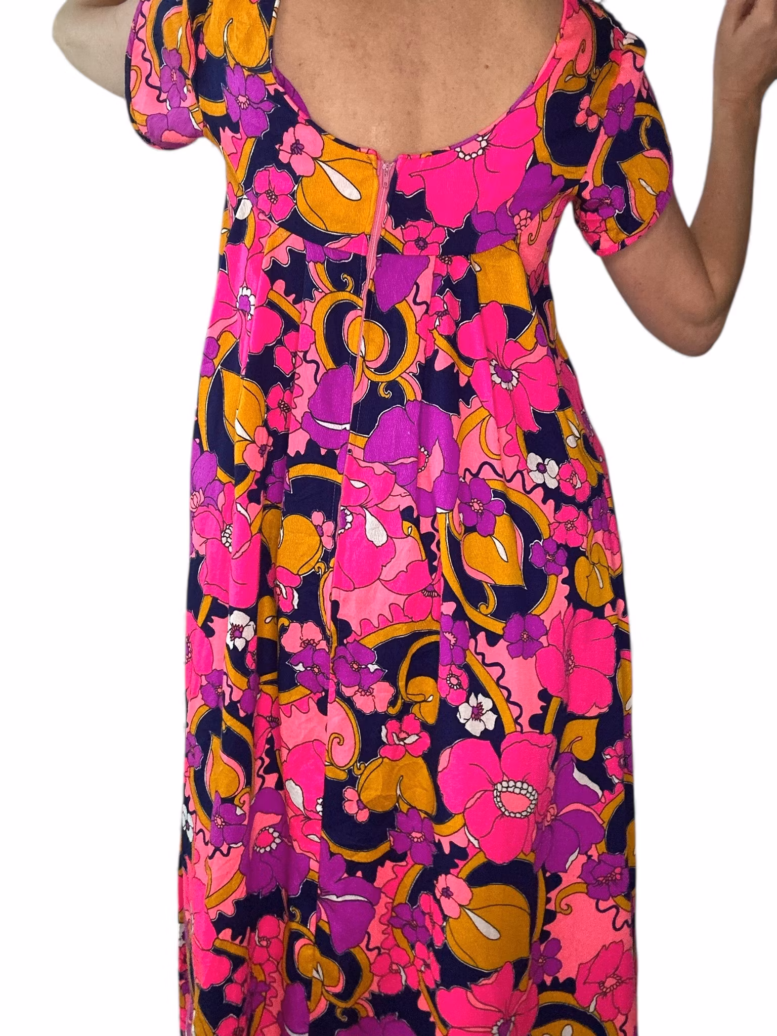 Beskrivning: Vintage klänning i otroligt färgglatt material. Blommor i rosa, orange och lila och en härlig form där det är prinsesskärning framtill och djup rygg med dragkedja och rejält veckad baksida som ger kul volym.