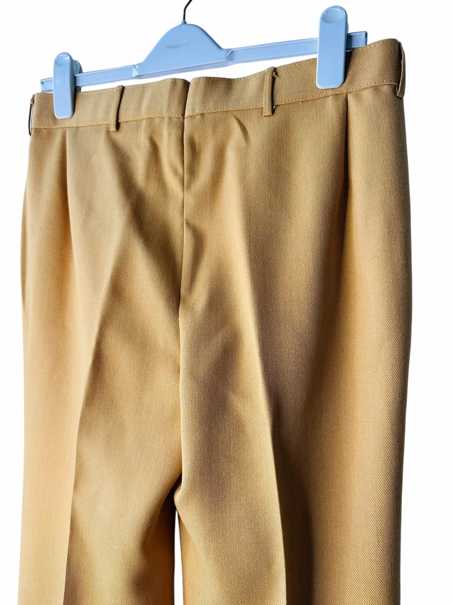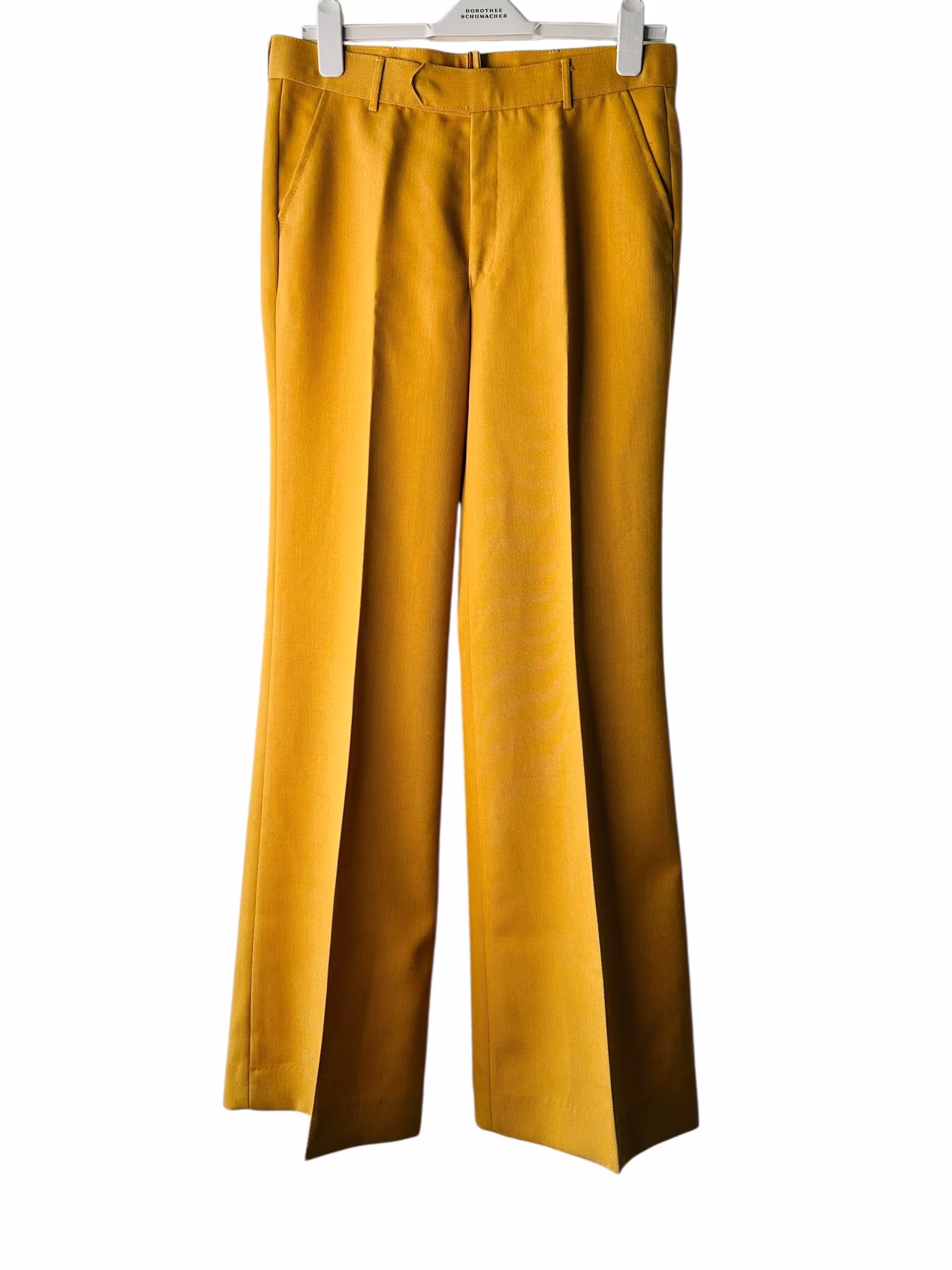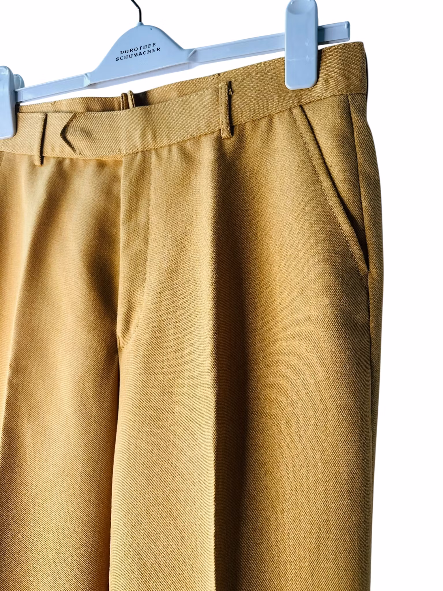 Beskrivning: Ett par klassiska gabardinbyxor i en härligt, höstig gul nyans - någonstans mellan lejongul och senapsgul. Hög midja med hällor, stängning med hyska och dragkedja, fickor i sidorna och lång, lätt utställda ben med pressveck.