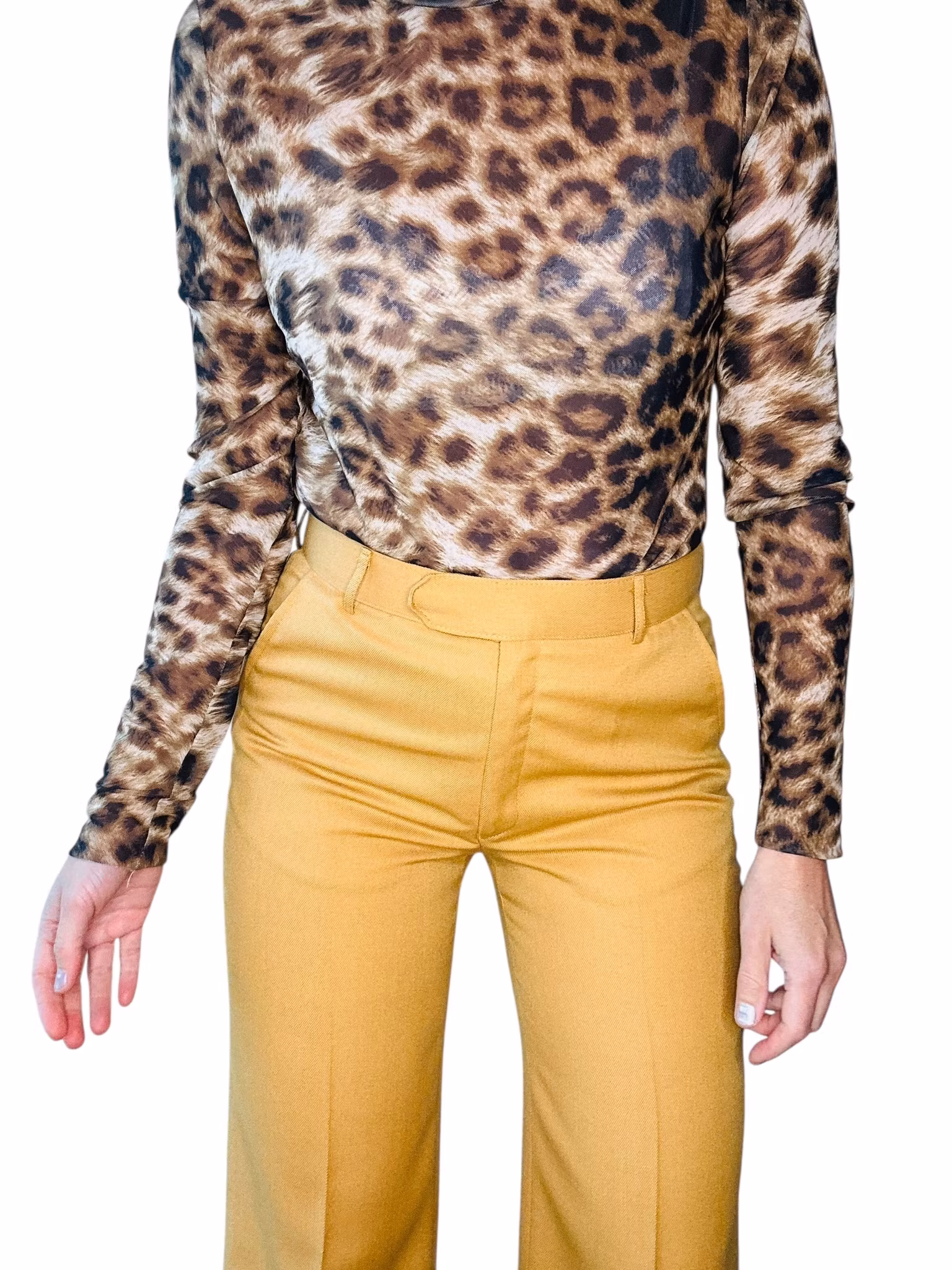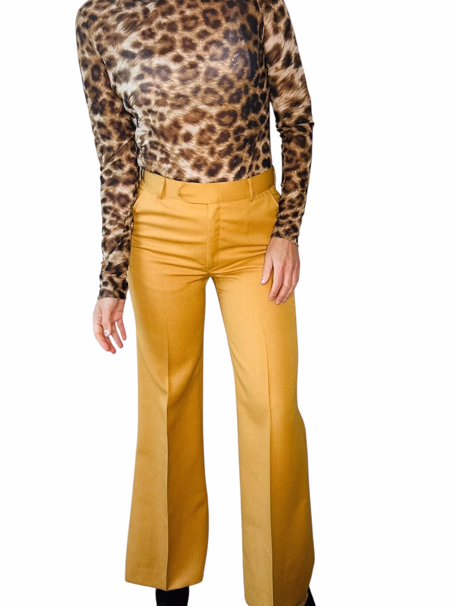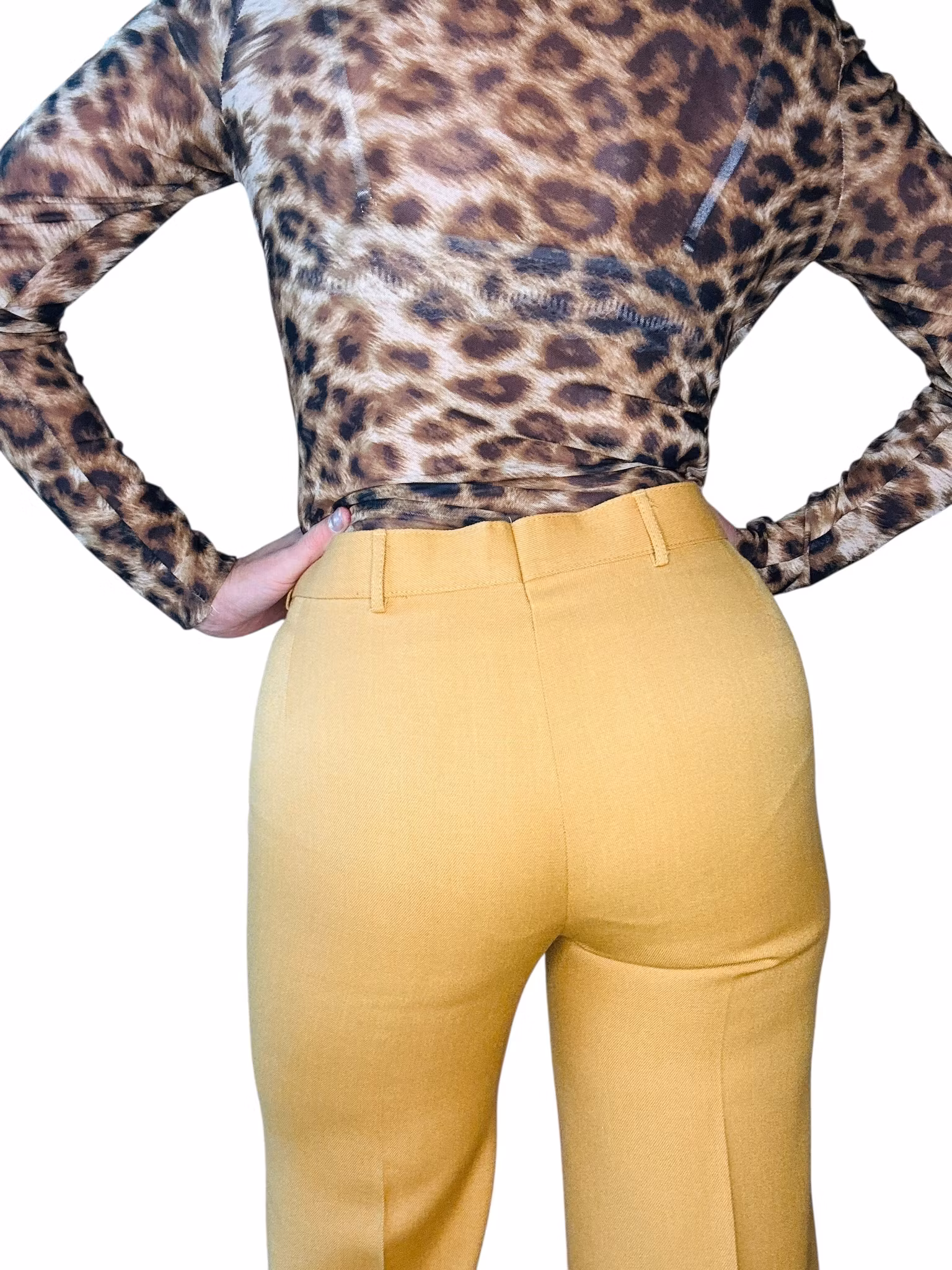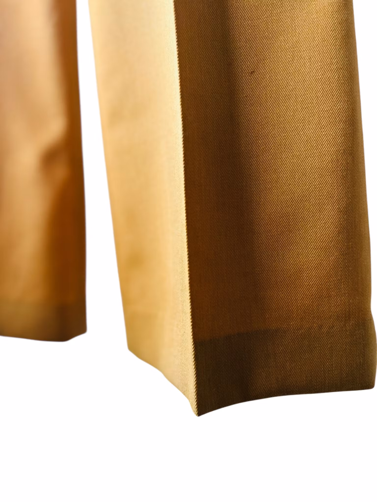 Beskrivning: Ett par klassiska gabardinbyxor i en härligt, höstig gul nyans - någonstans mellan lejongul och senapsgul. Hög midja med hällor, stängning med hyska och dragkedja, fickor i sidorna och lång, lätt utställda ben med pressveck.