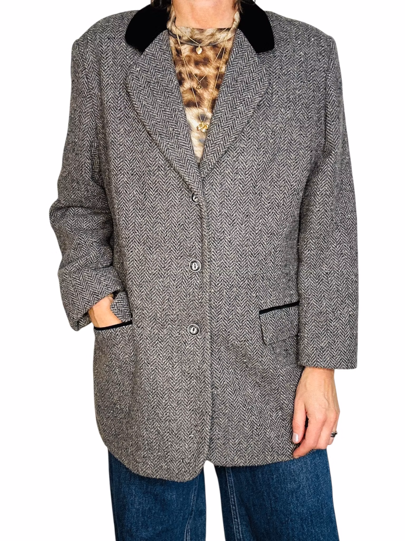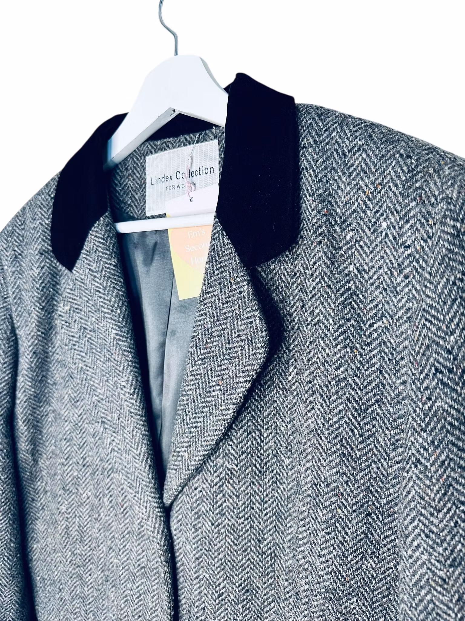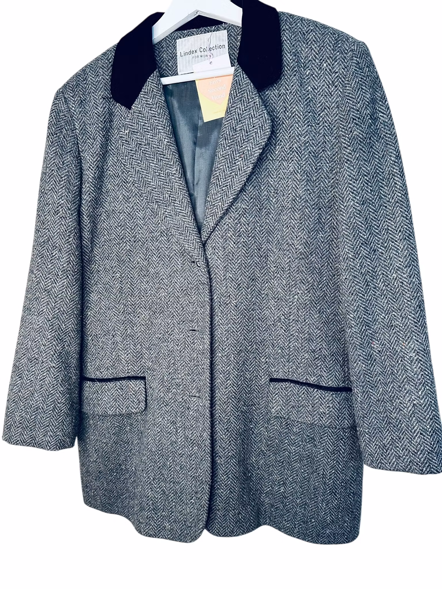 Beskrivning: En kavaj som är vintage men som känns helt mitt i prick den här hösten. I gråmelerad ullmix med en krage som kantas av sammet i en ledig, lång modell. Fickorna har lock och en rand av kragens sammet. Från Lindex.