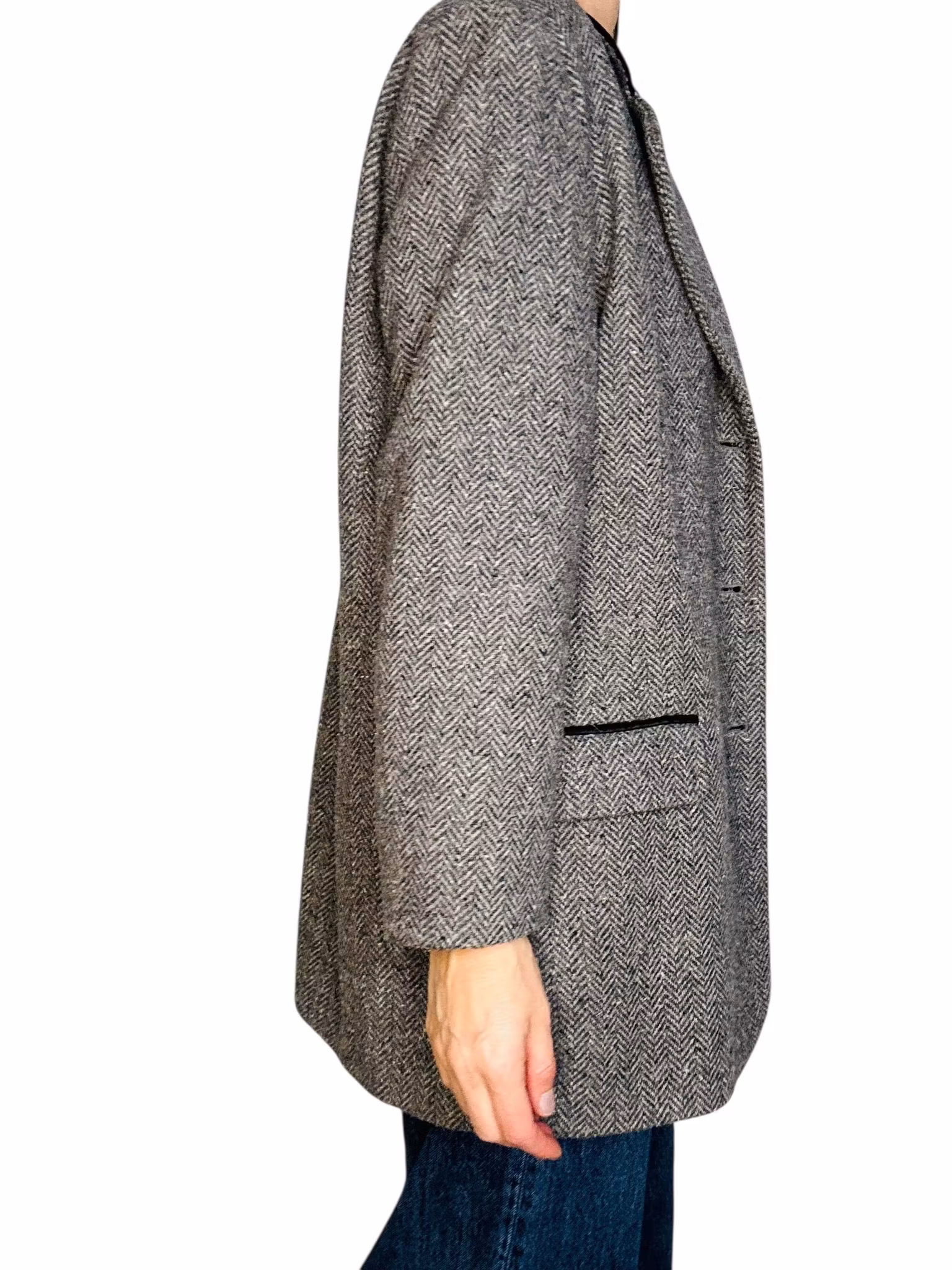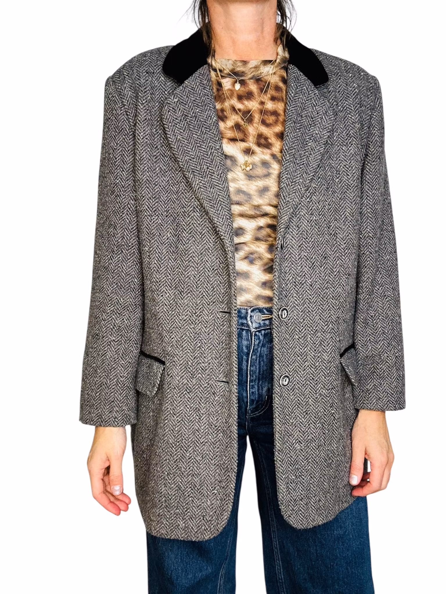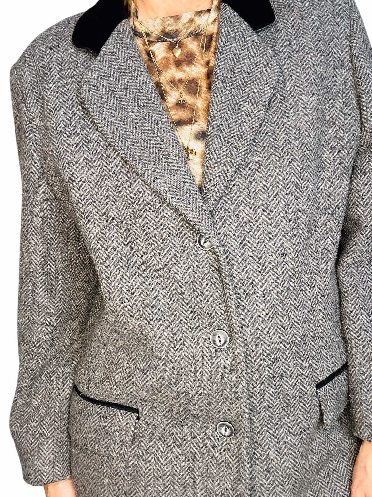 Beskrivning: En kavaj som är vintage men som känns helt mitt i prick den här hösten. I gråmelerad ullmix med en krage som kantas av sammet i en ledig, lång modell. Fickorna har lock och en rand av kragens sammet. Från Lindex.