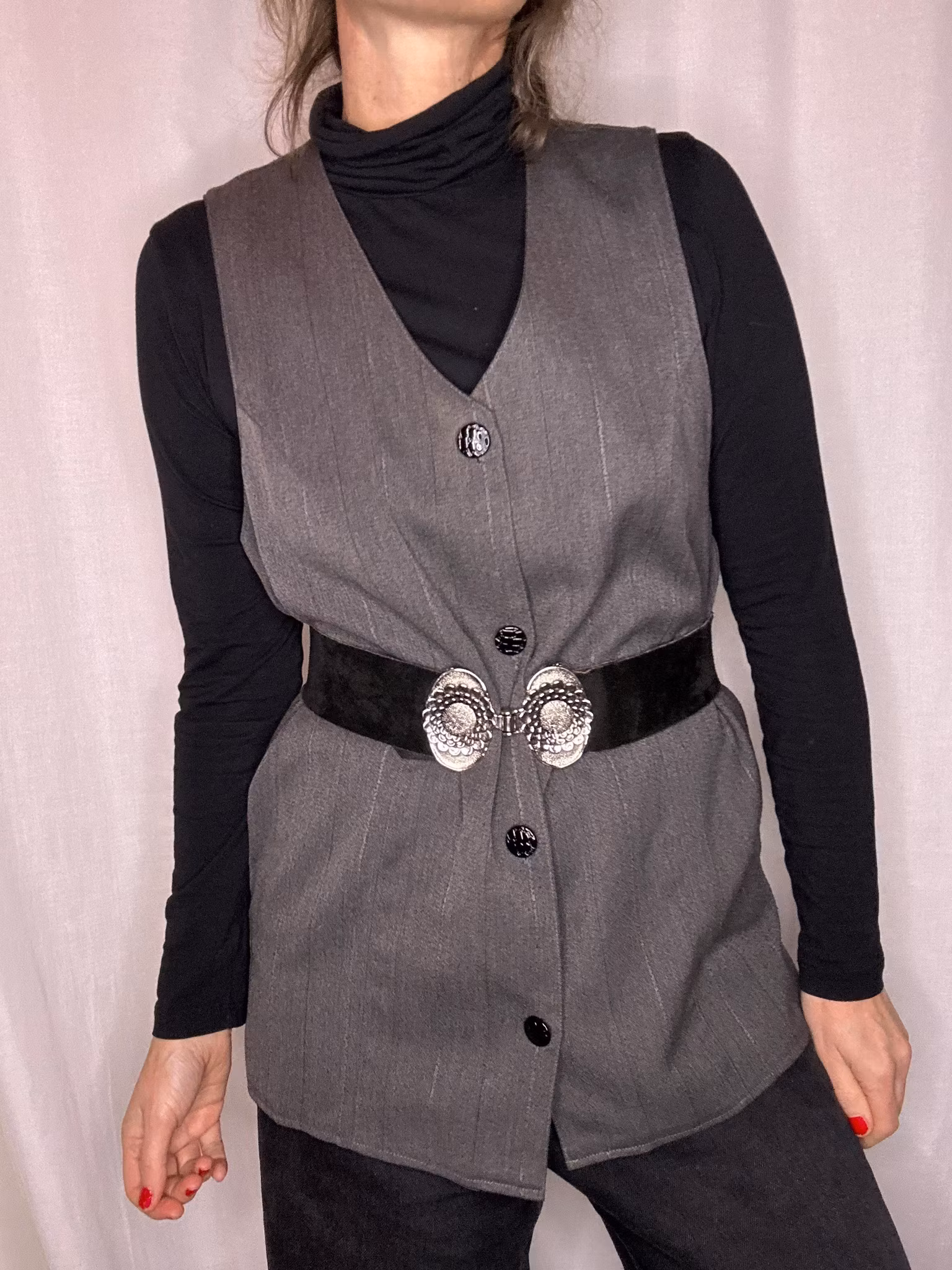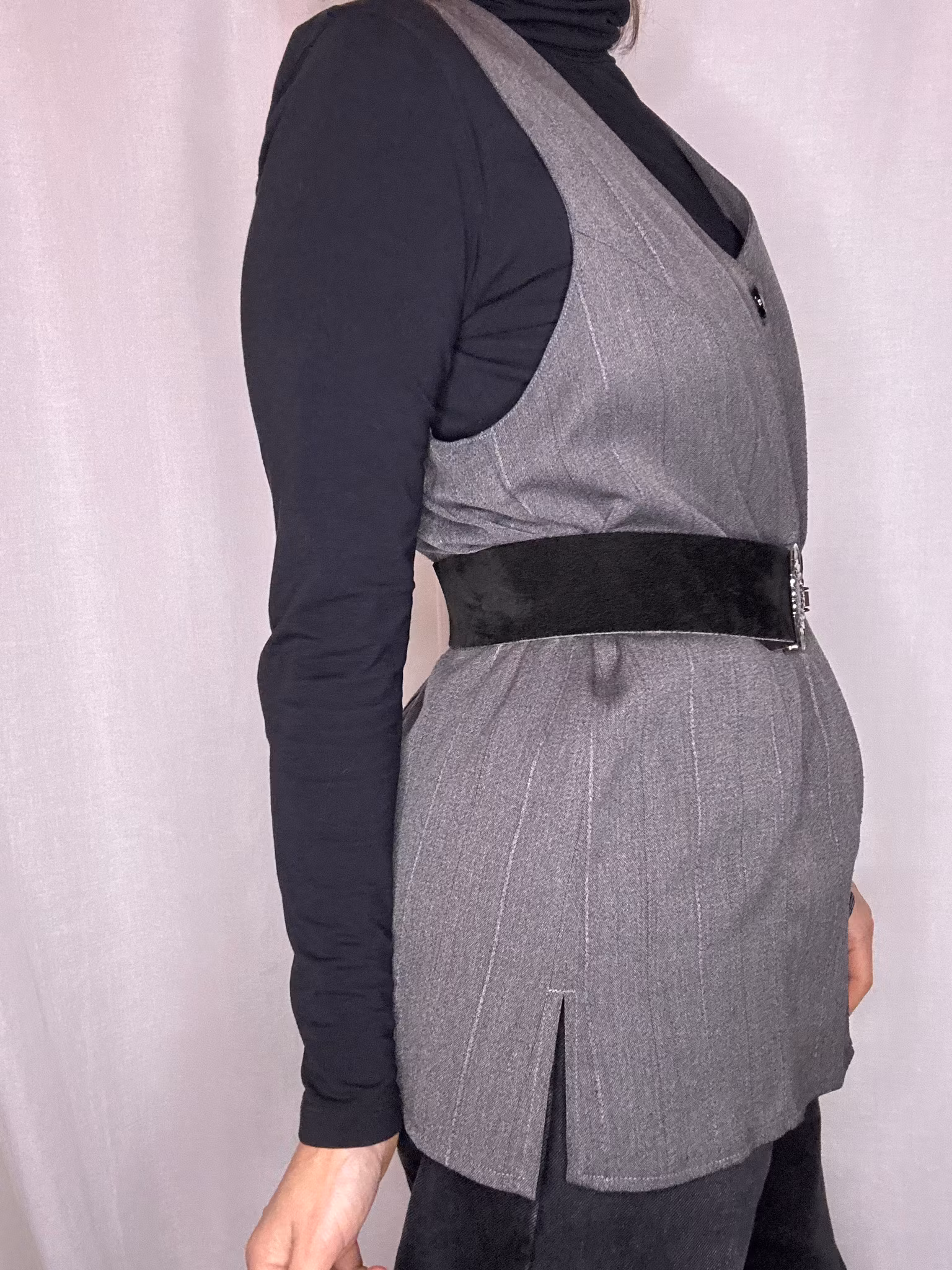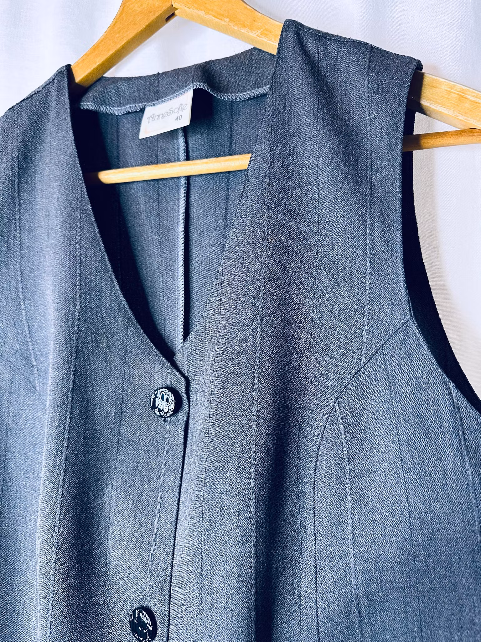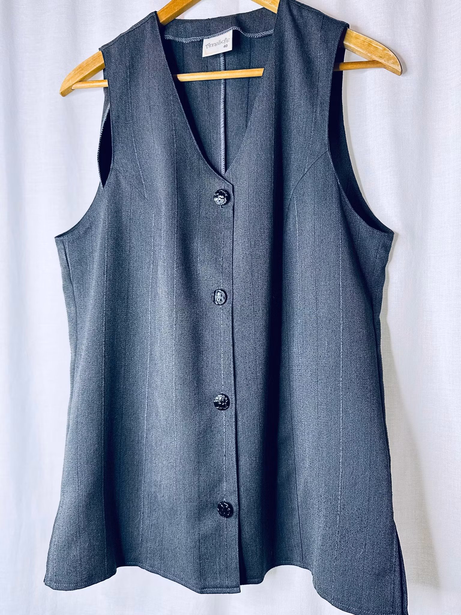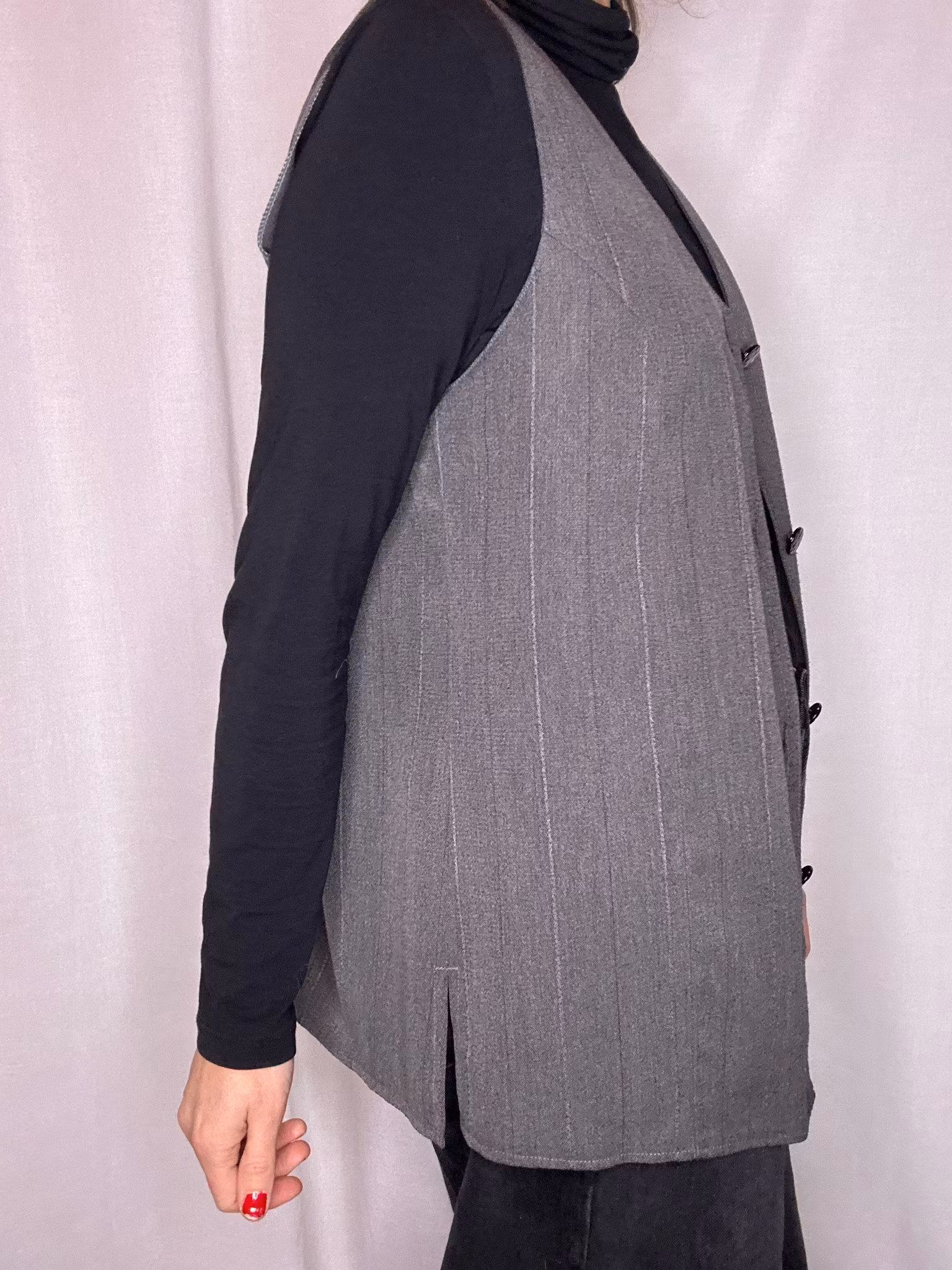 Beskrivning: Grå väst med svarta ränder märkt "Ann-Sofie" och "Made in Denmark". Längre modell med slitsar i sidorna och svarta, mönsterpräglade knappar hela vägen ner. Fin att ha med bälte i midjan!