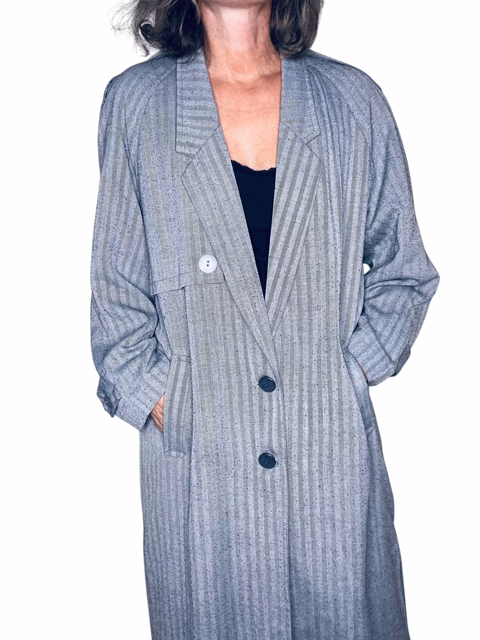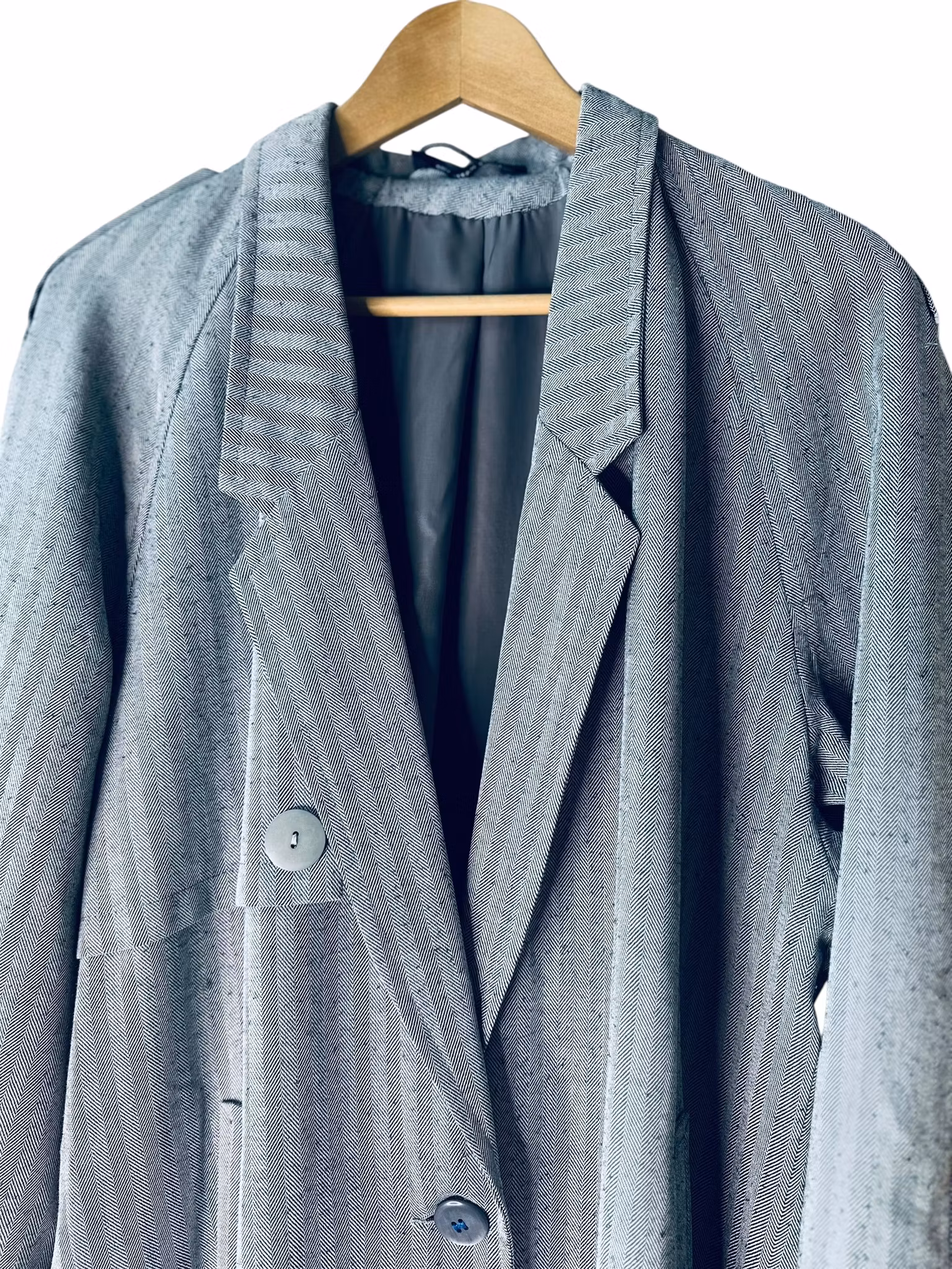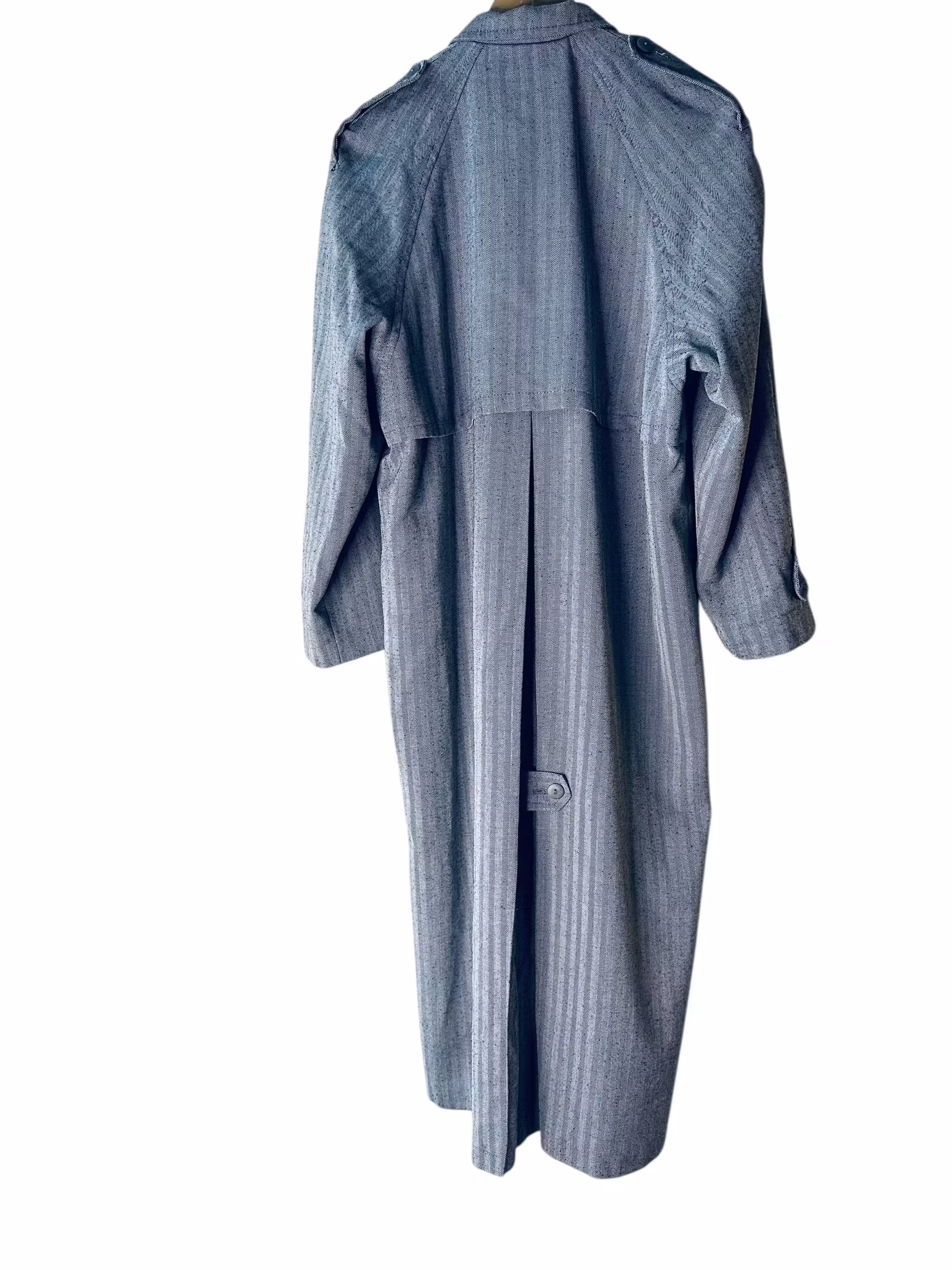 Beskrivning: En vintage, brittisk, tunn rock. Den har vävt mönster i töta ronder som går diagonalt. Materialet har som små pluppar på sig jämt över hela kappan, vi gissar en ullblandning. Fodrad i tunt, grått, silkigt material. Fodret har en söm som blivit lagad. Från det kultiga märket Chelsea Girl .