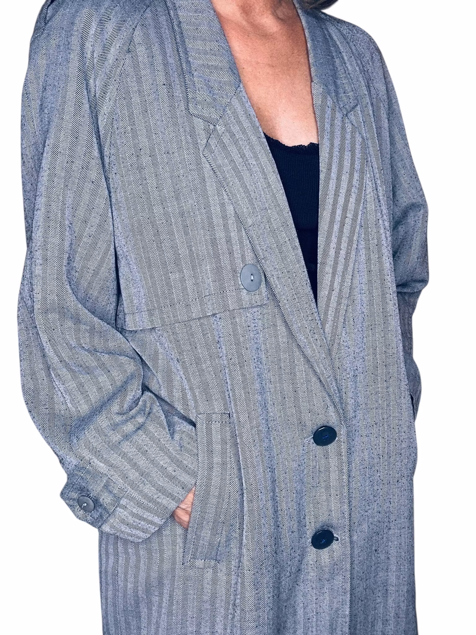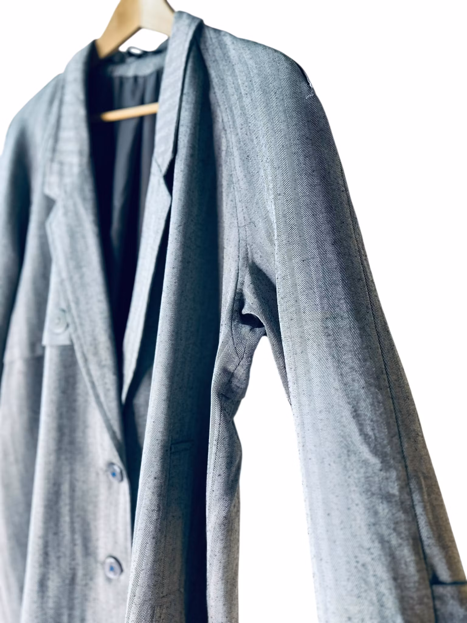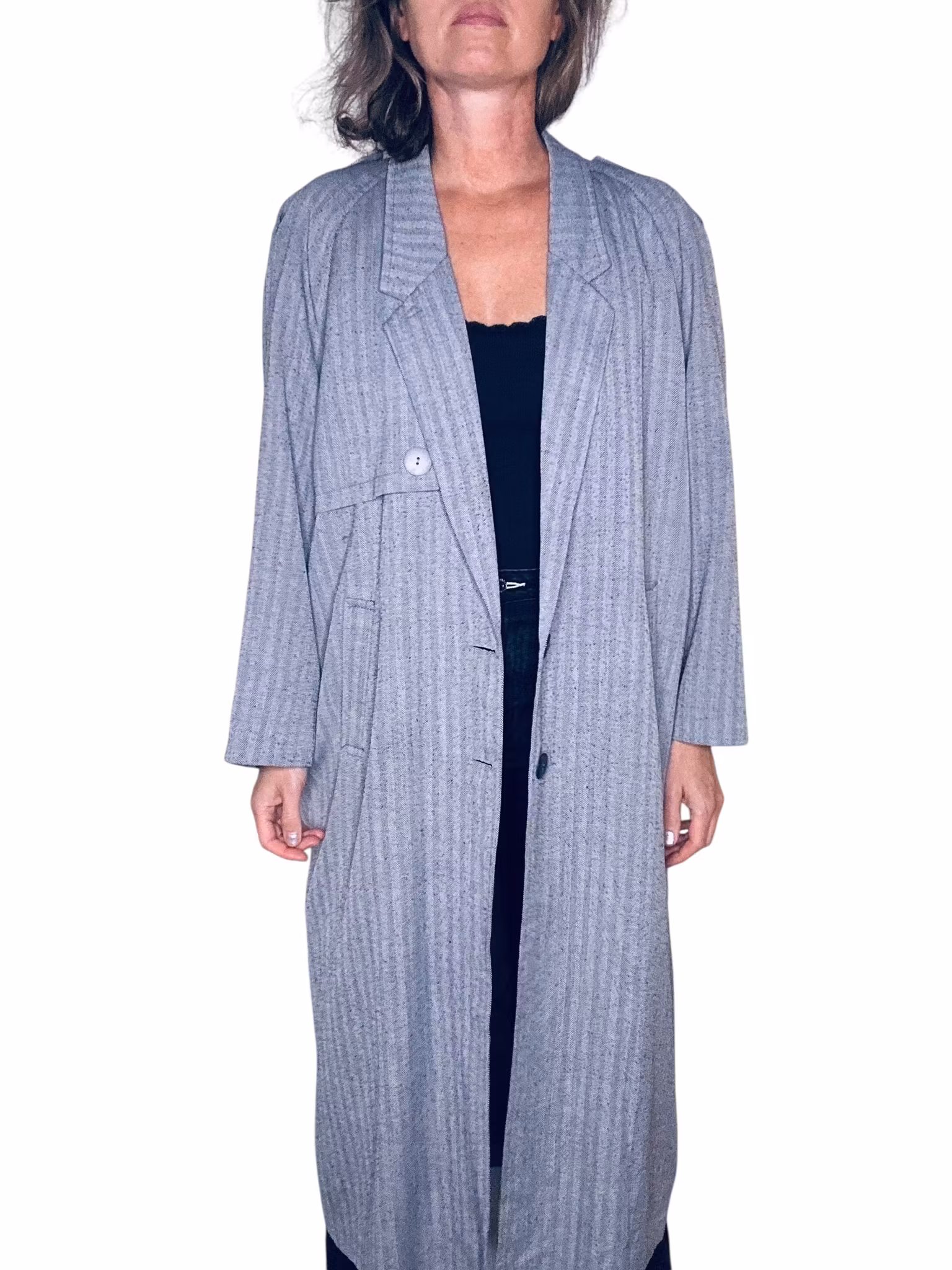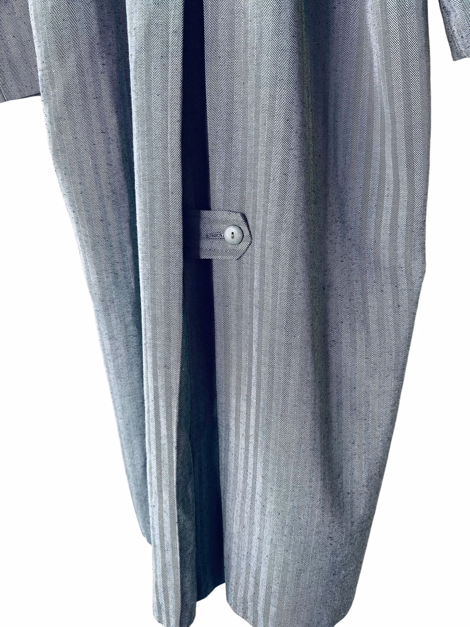Beskrivning: En vintage, brittisk, tunn rock. Den har vävt mönster i töta ronder som går diagonalt. Materialet har som små pluppar på sig jämt över hela kappan, vi gissar en ullblandning. Fodrad i tunt, grått, silkigt material. Fodret har en söm som blivit lagad. Från det kultiga märket Chelsea Girl .