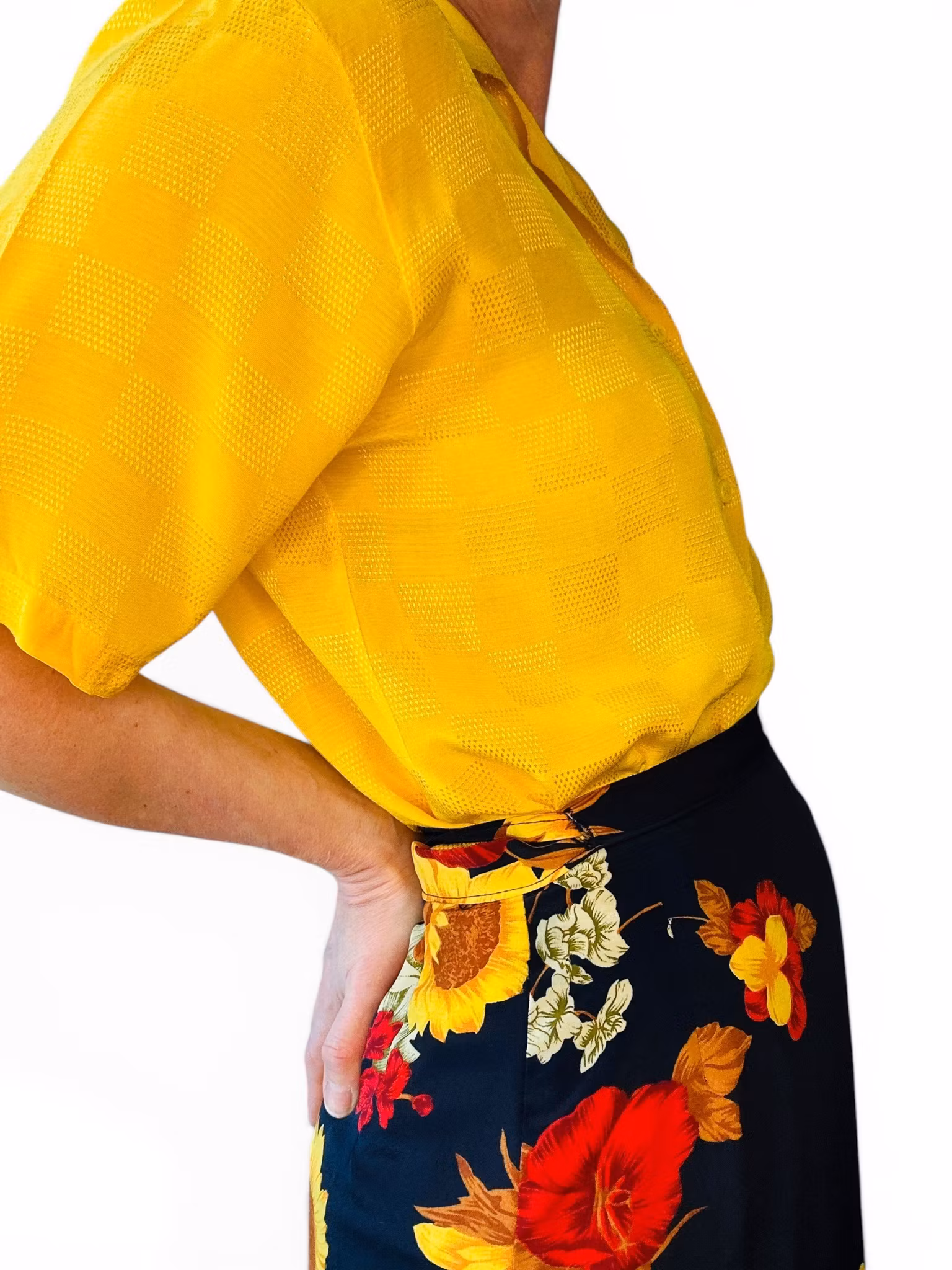 Sökord: Vintageblus, gul blus dam, viskosblus, Made in Sweden, svensk vintage, jacquardblus, solgul blus, kortärmad blus, retroblus, 70-talsblus, 80-talsblus, hållbart mode, skandinavisk vintage, second hand dam.