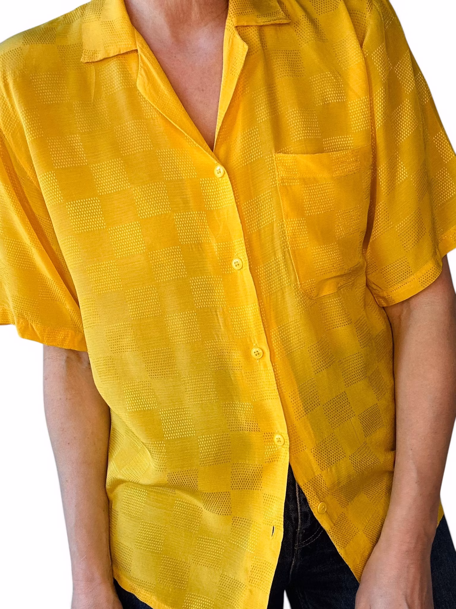 Beskrivning: En strålande solgul vintageblus tillverkad i Sverige – ett tidlöst och stilrent plagg som för tankarna till skandinavisk sommarelegans. Den mjuka viskosen och det subtila jacquardmönstret ger en exklusiv känsla och ett vackert fall. Denna charmiga kortärmade blus är sydd i en luftig och följsam viskos med invävt rutmönster som skapar diskret struktur och lyster. Den klara gula nyansen ger energi till garderoben och passar lika bra till vardag som till semester och festliga sommartillfällen. Designen har en klassisk krage, knäppning framtill och en bröstficka som förstärker det tidlösa uttrycket. Den avslappnade passformen gör den både bekväm och lätt att styla.