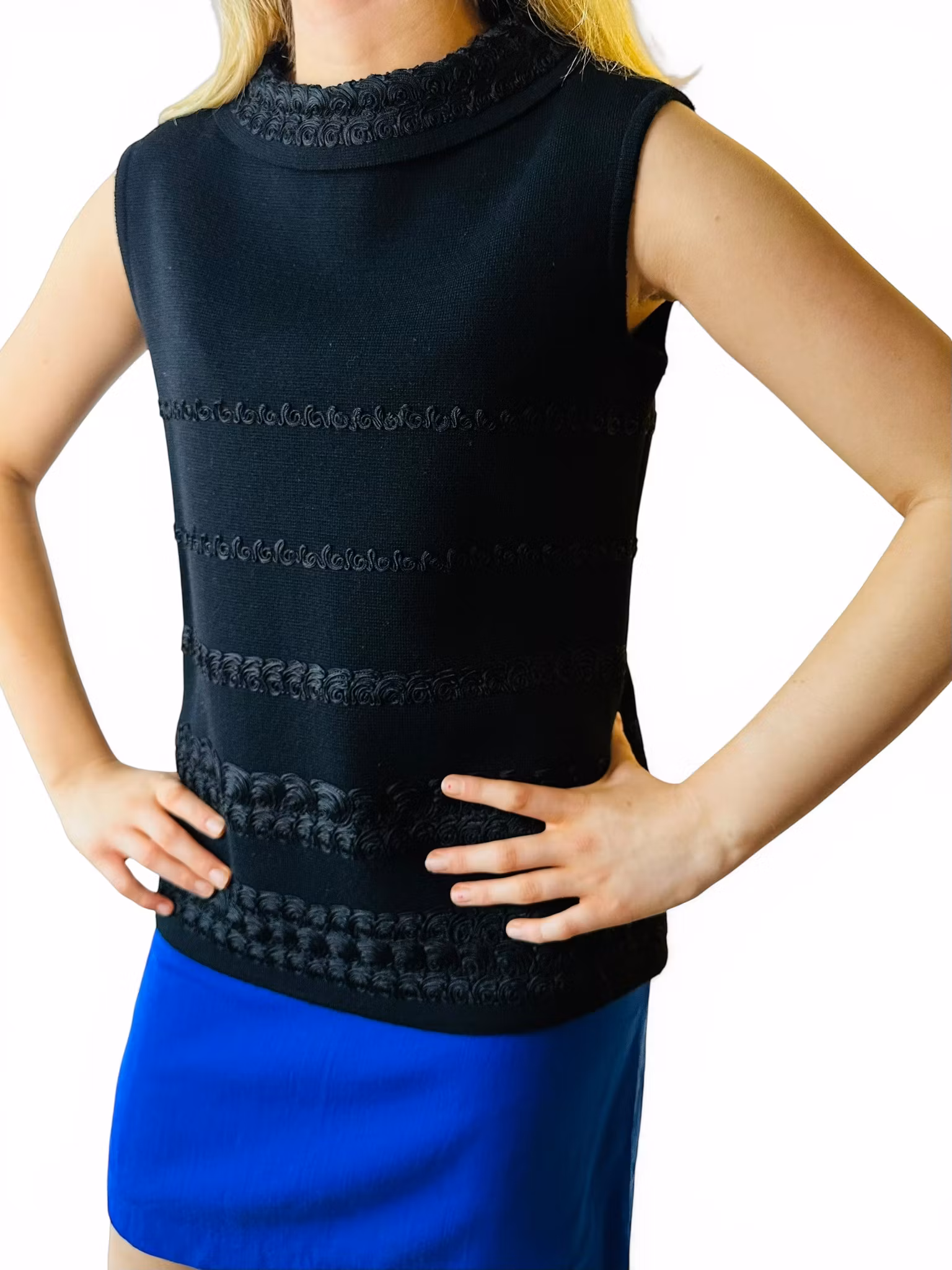 Beskrivning: En elegant och ovanlig vintage-topp i 100% ull, tillverkad i Italien, med vackra dekorativa band i relief som ger plagget en subtil men exklusiv struktur.