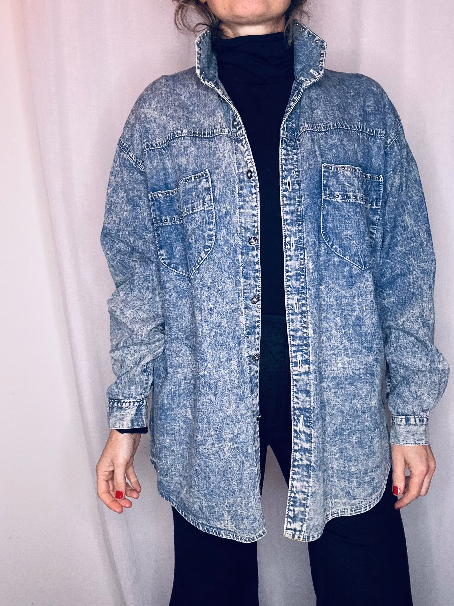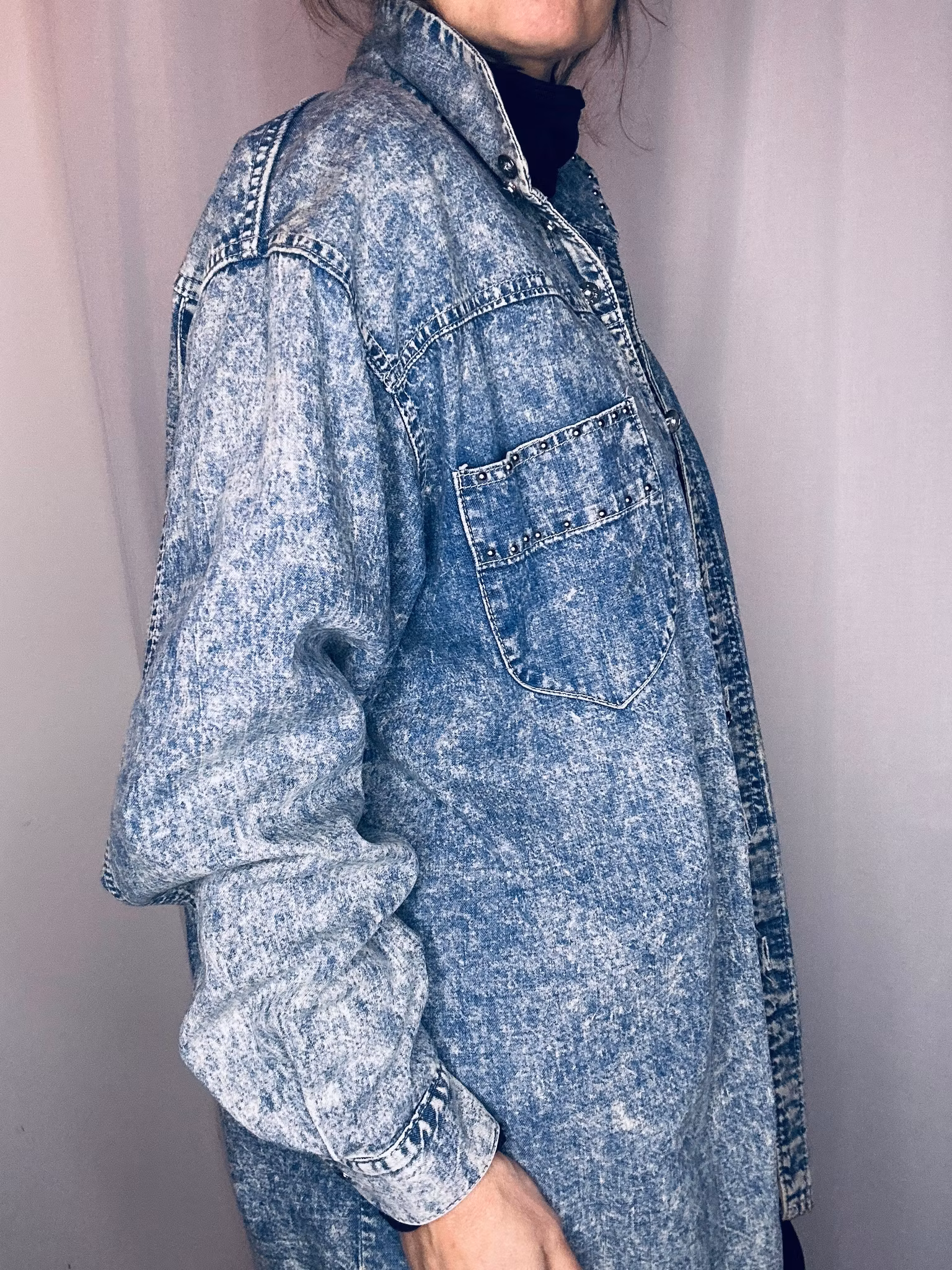 Beskrivning: Vintage jeansskjorta i stentvättad denim. Små runda nitar runtom kragen och på de stora bröstfickorna. Kragen har en speciell form med avhuggna spetsar och möjlighet att knäppa upp den som en ståkrage! Också fin som overshirt eller med bälte i midjan som på bilderna.