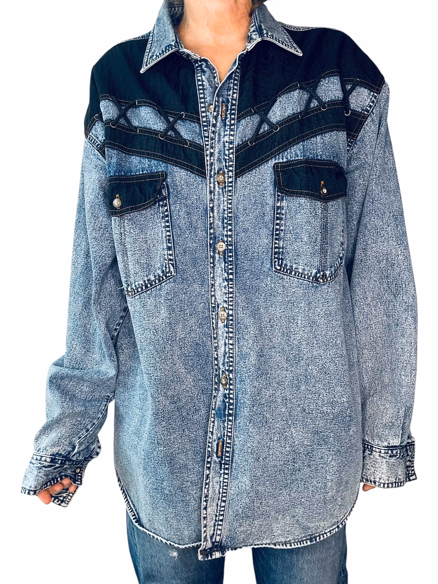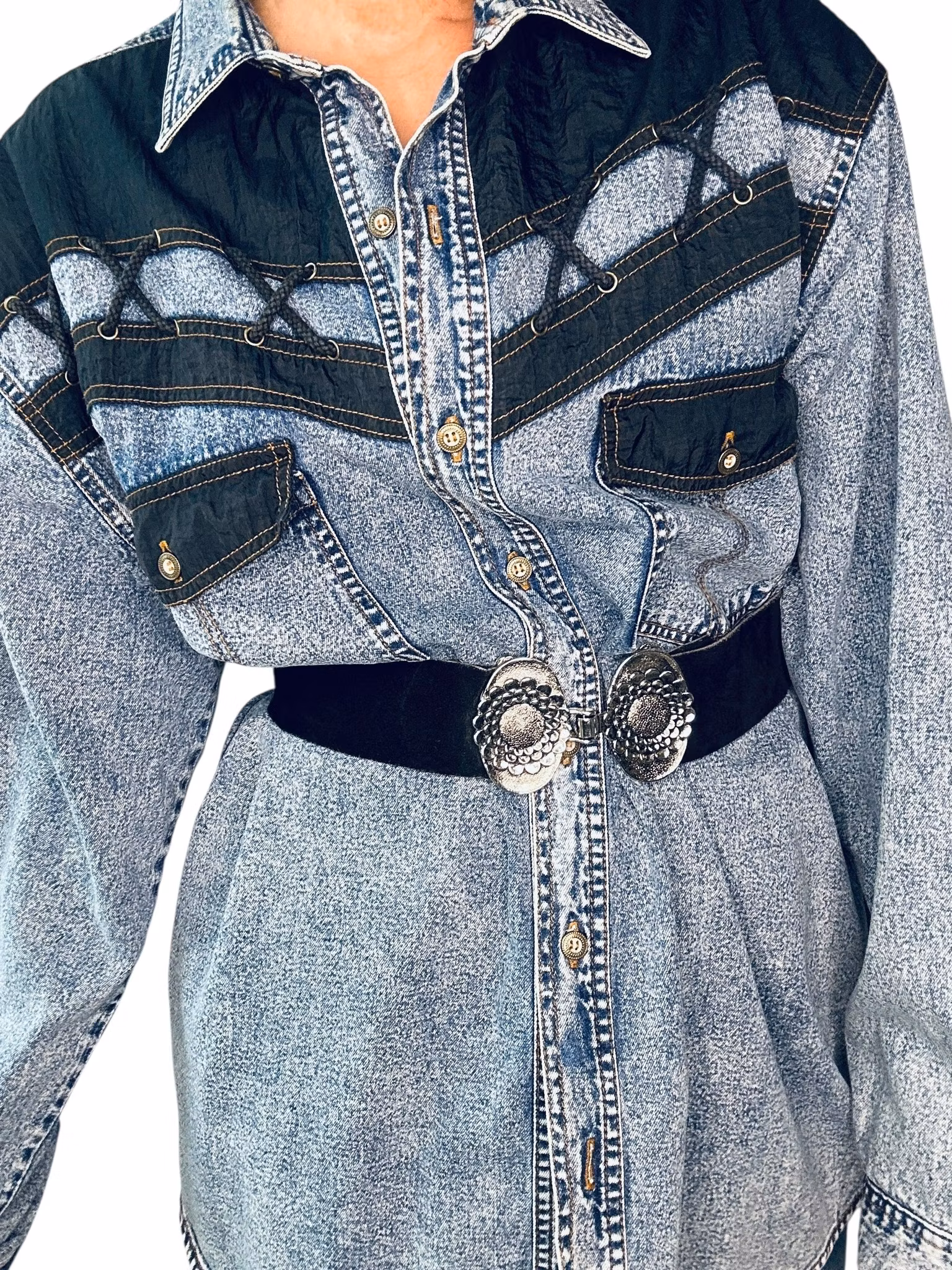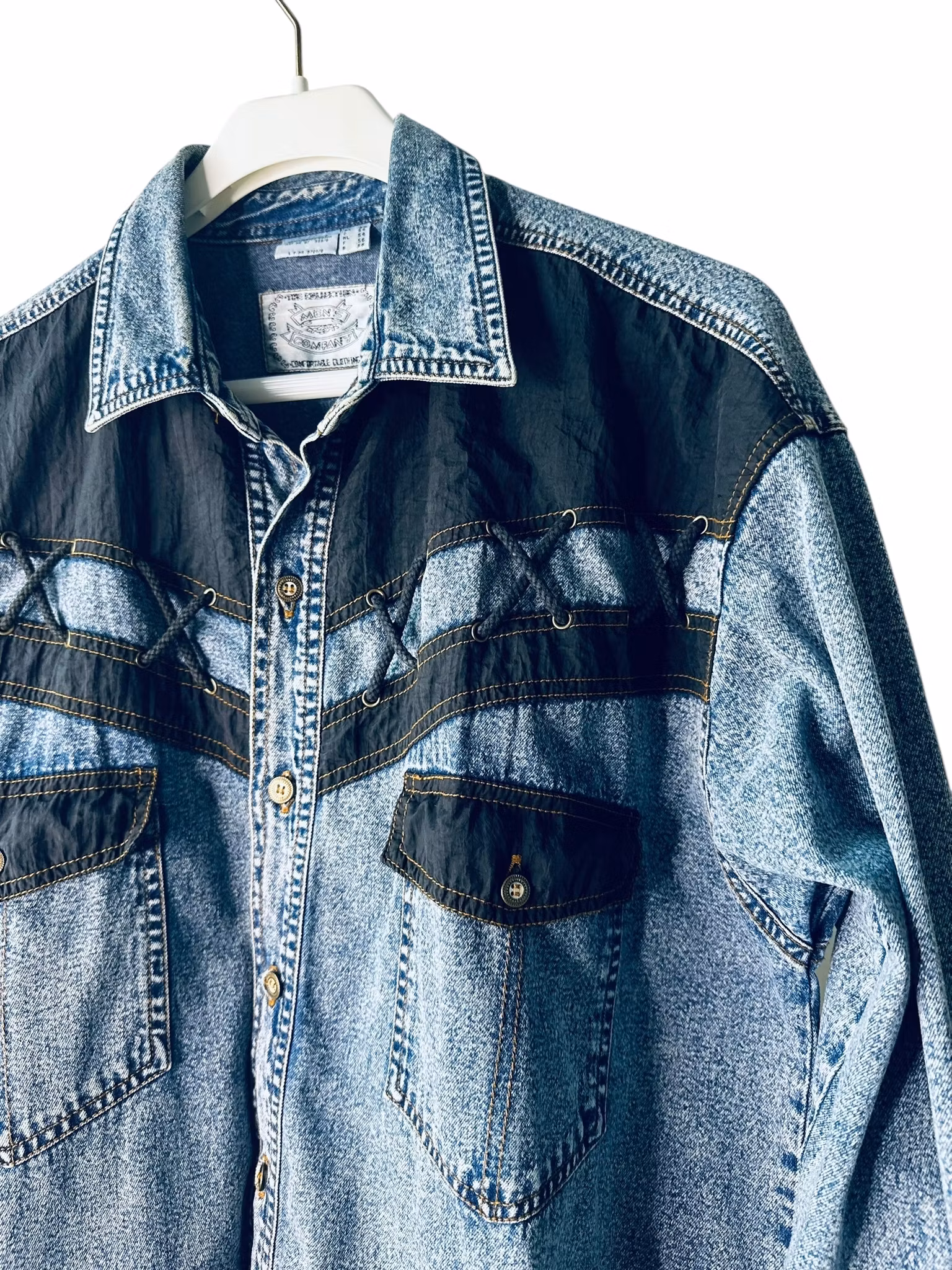 Beskrivning: Vintage jeansskjorta i stentvättad denim och detaljer i svart i ett vindjackematerial med jeanssömmar och repdetaljer. Stängs med metallknappar hela vägen ner samt på bröstfickorna. Från "Men's Company". Snygg att bära som den är, eller som overshirt och även som på bilderna med bälte i midjan.