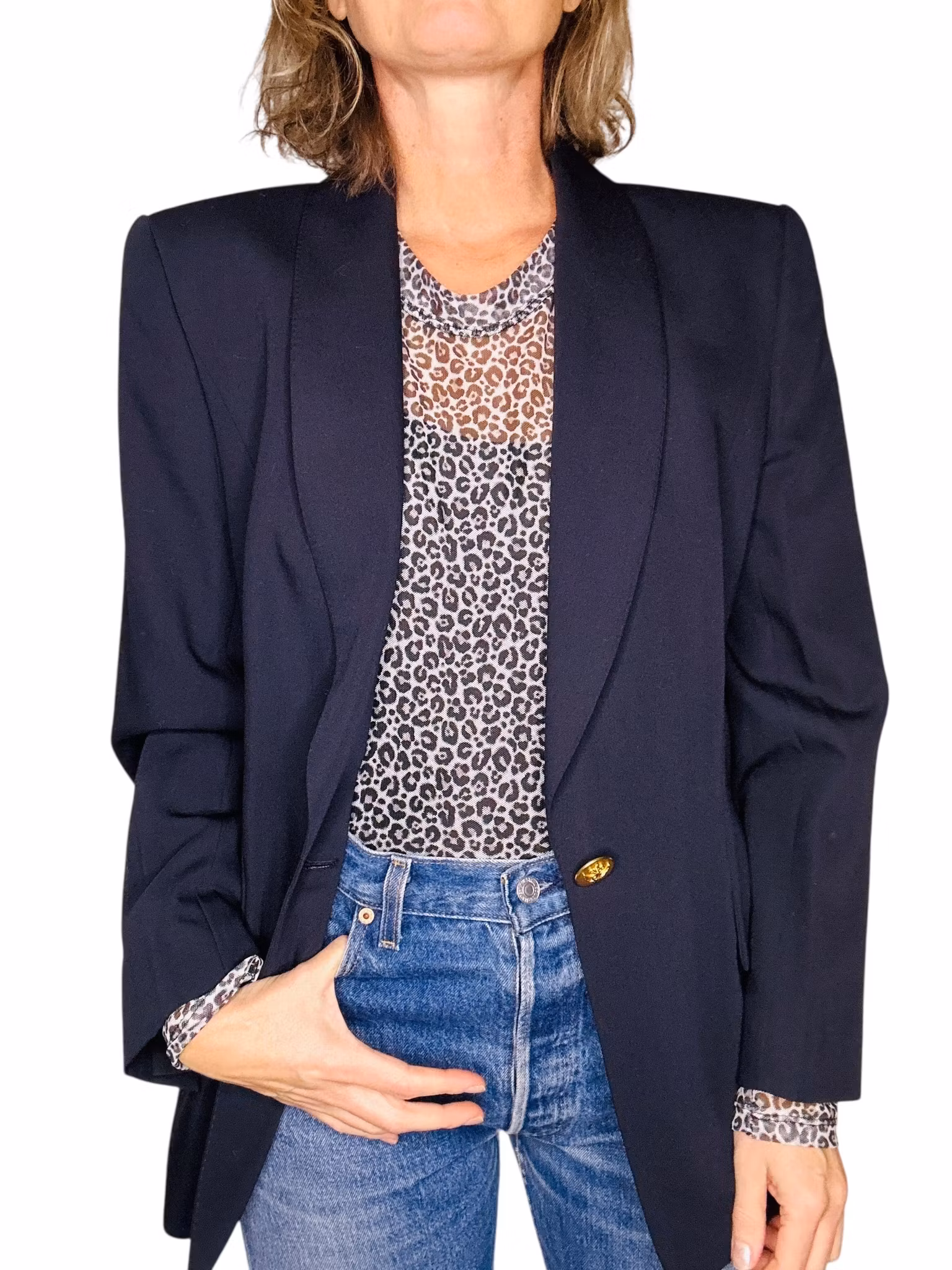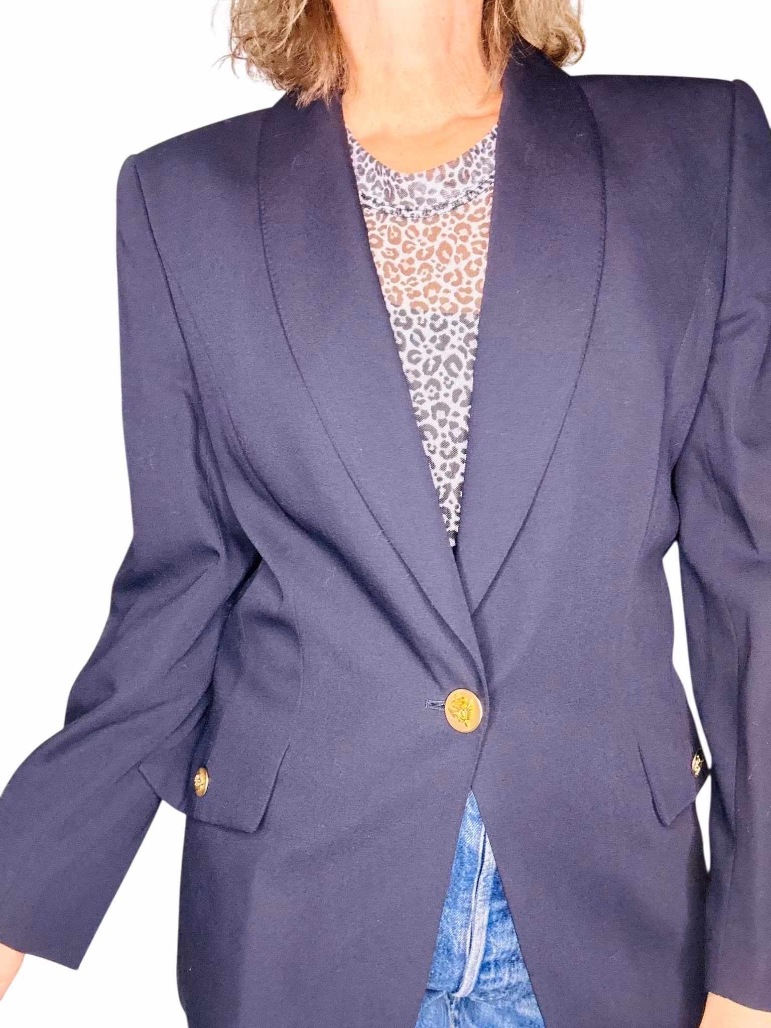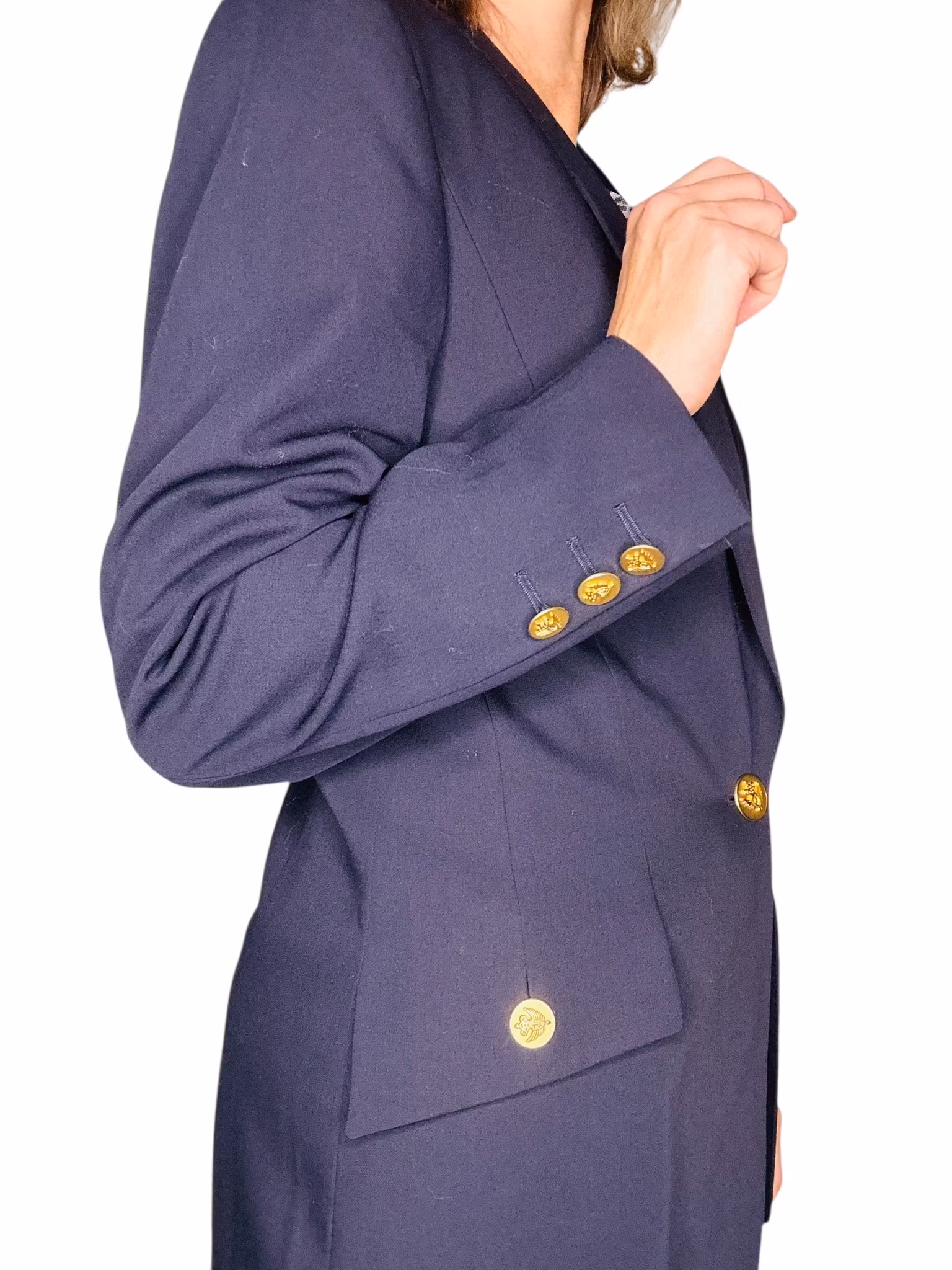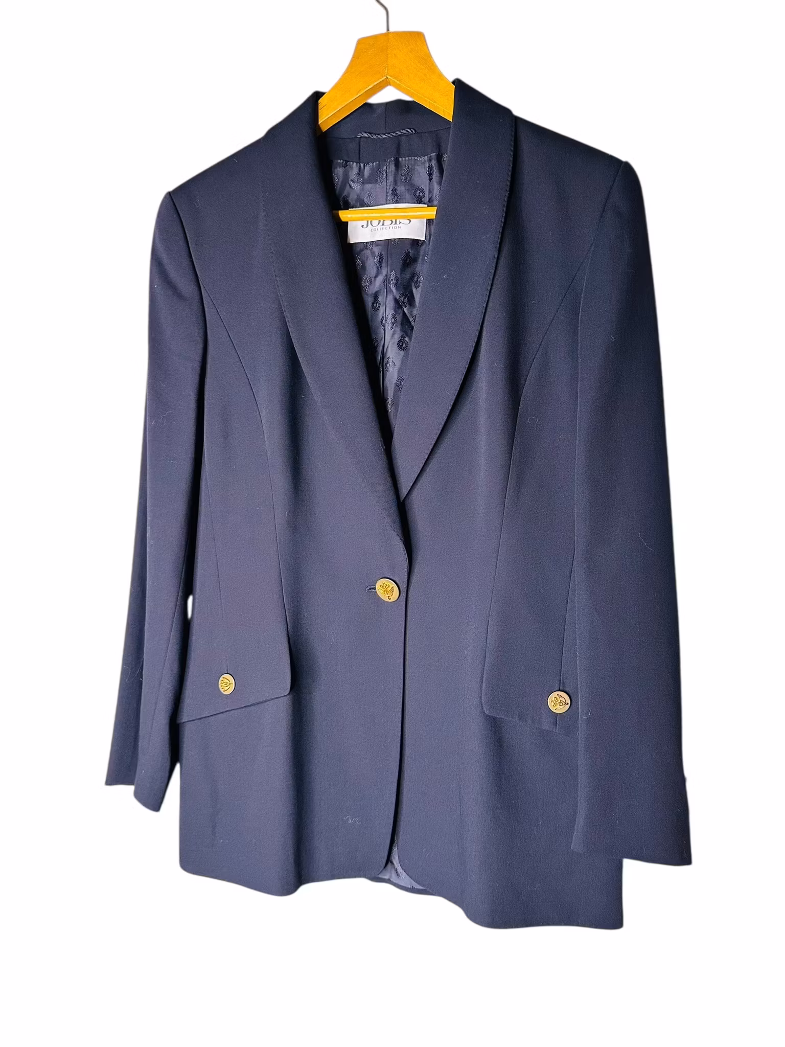 Beskrivning: En kavaj från Jobis i ullblanding. Mörkblå och slimmad i snittet med rundade slag. Fickorna går i ett från ovandelen som skapar ett sömlöst lock. På fickor, manschetter och framtill finns guldknappar med dekoration. Kavajen är helfodrad.