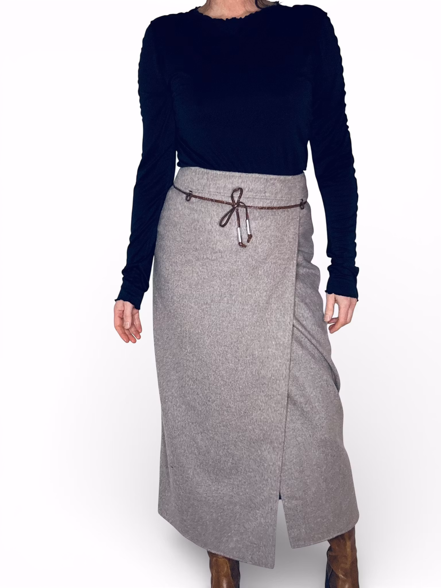 Beskrivning: Elegant ullkjol i en mjukt melerad grå nyans. Modellen är lång, rak och lagd omlott framtill vilket skapar ett vackert fall och ger kjolen rörelse utan att bli vid. Midjan är slät och hög, dekorerad med ett smalkt knytbälte i läder med metallavslut. En diskret men genomarbetat detalj som ger plagget karaktär.