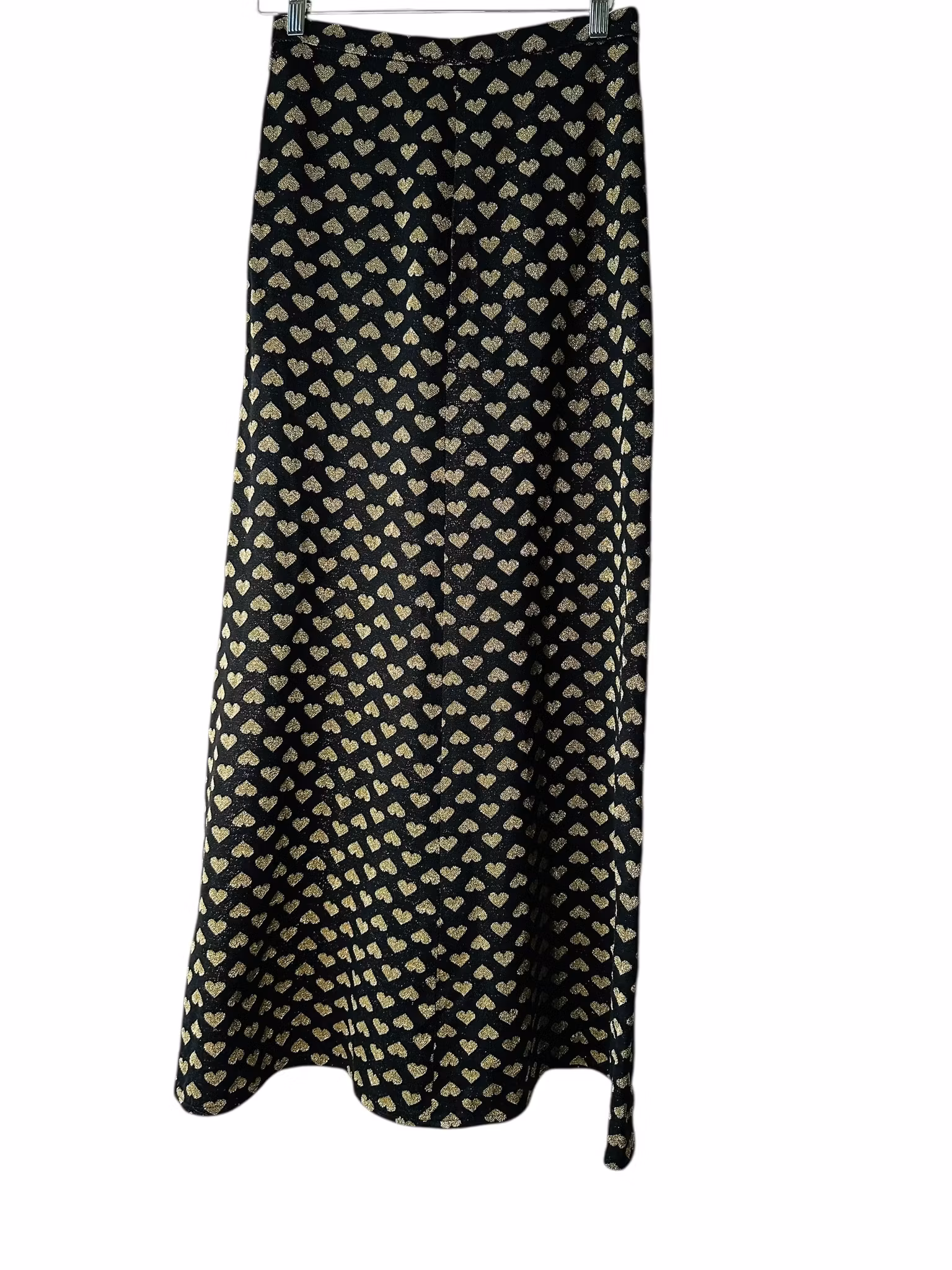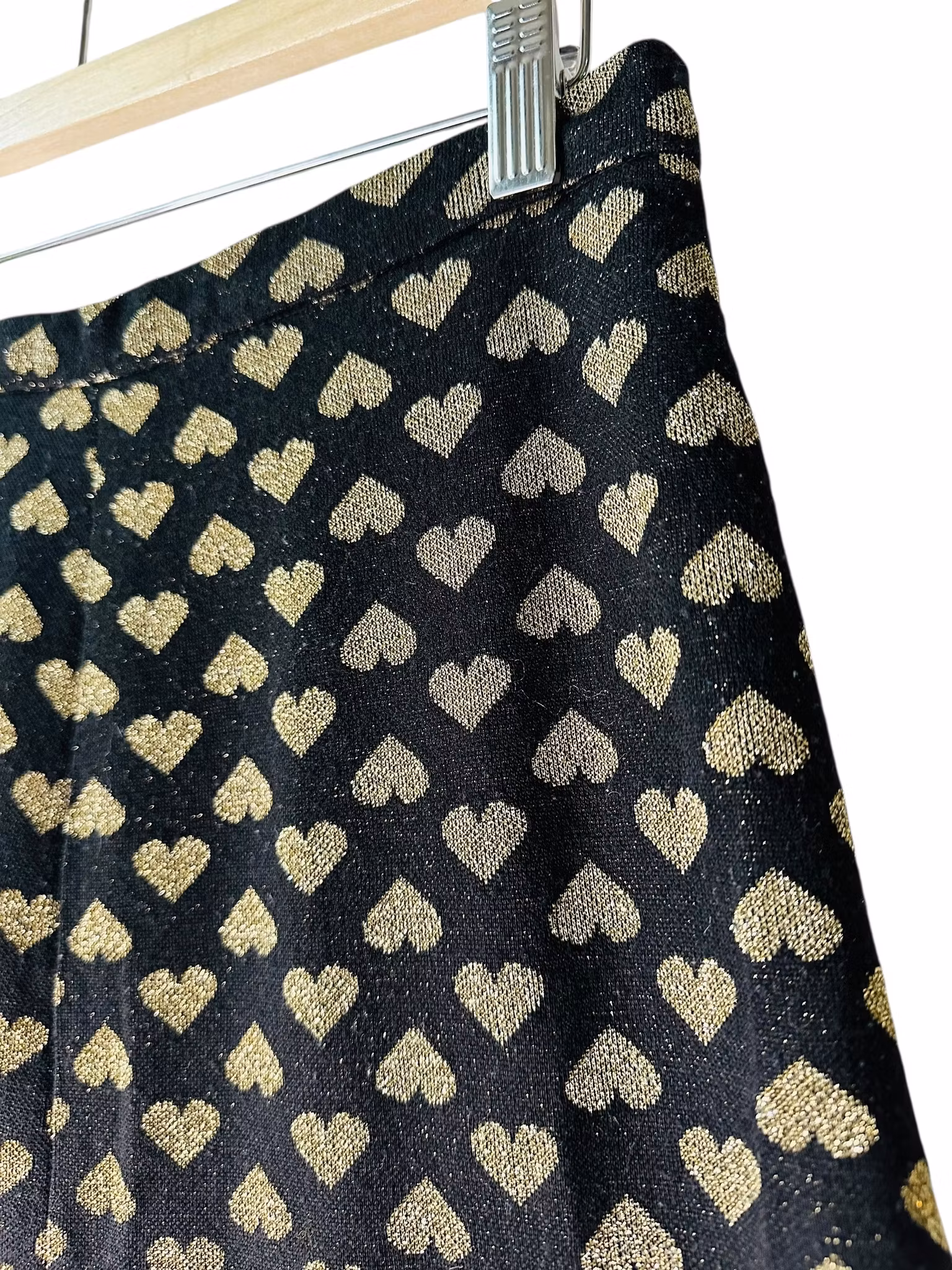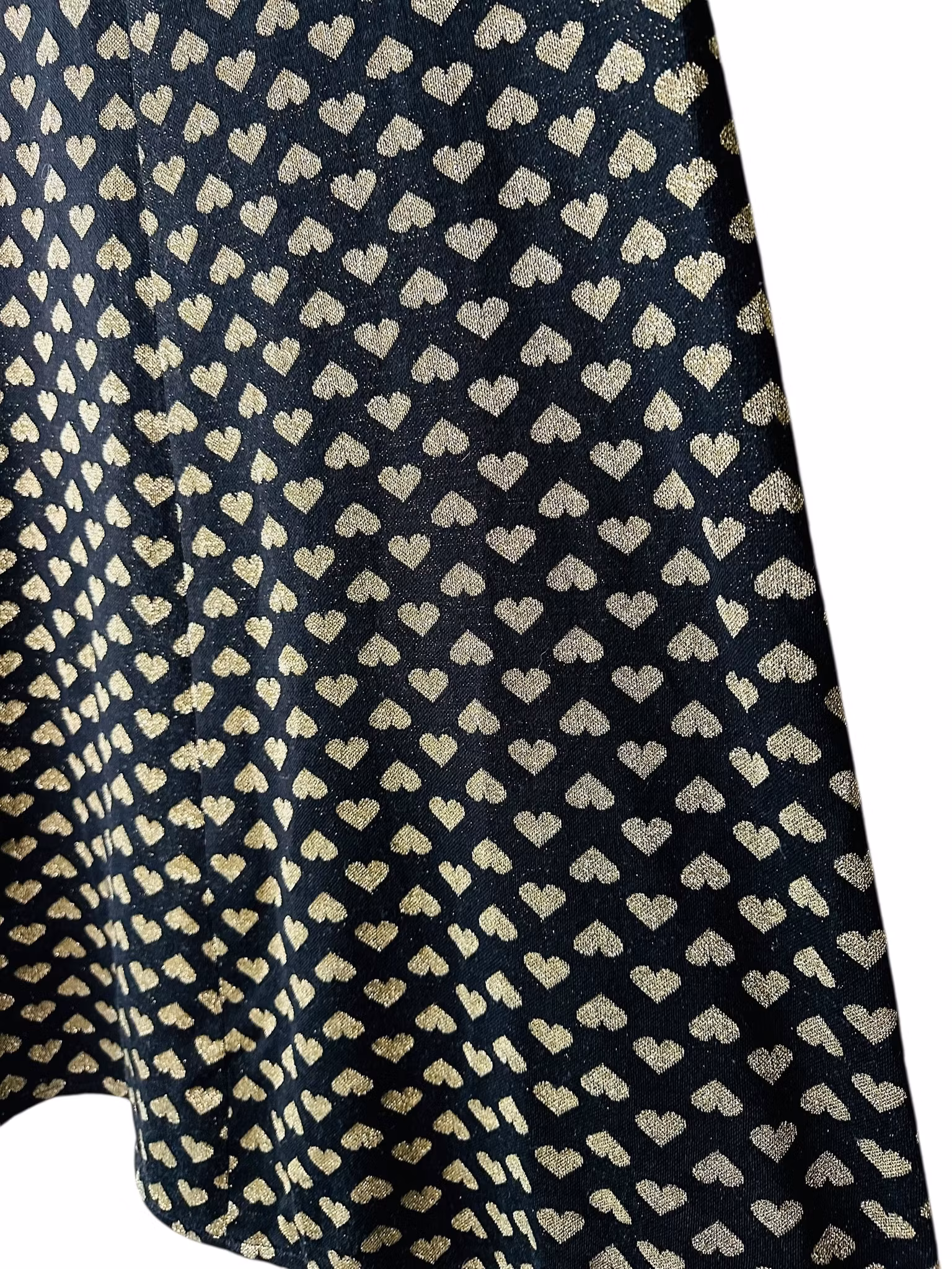 Beskrivning: Vintage kjol från 70-talet. Lång och lätt utställd. Svart med vävda hjärtan i guldfärg. Material saknas men uppskattas vara polyester och lurex. Stängs med dragkedja och knapp.